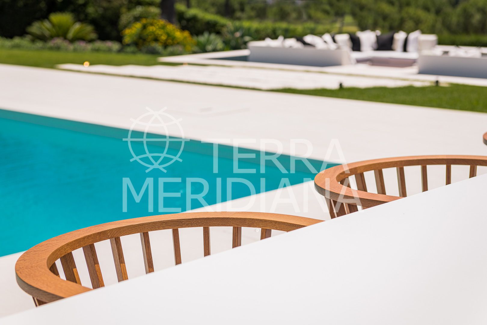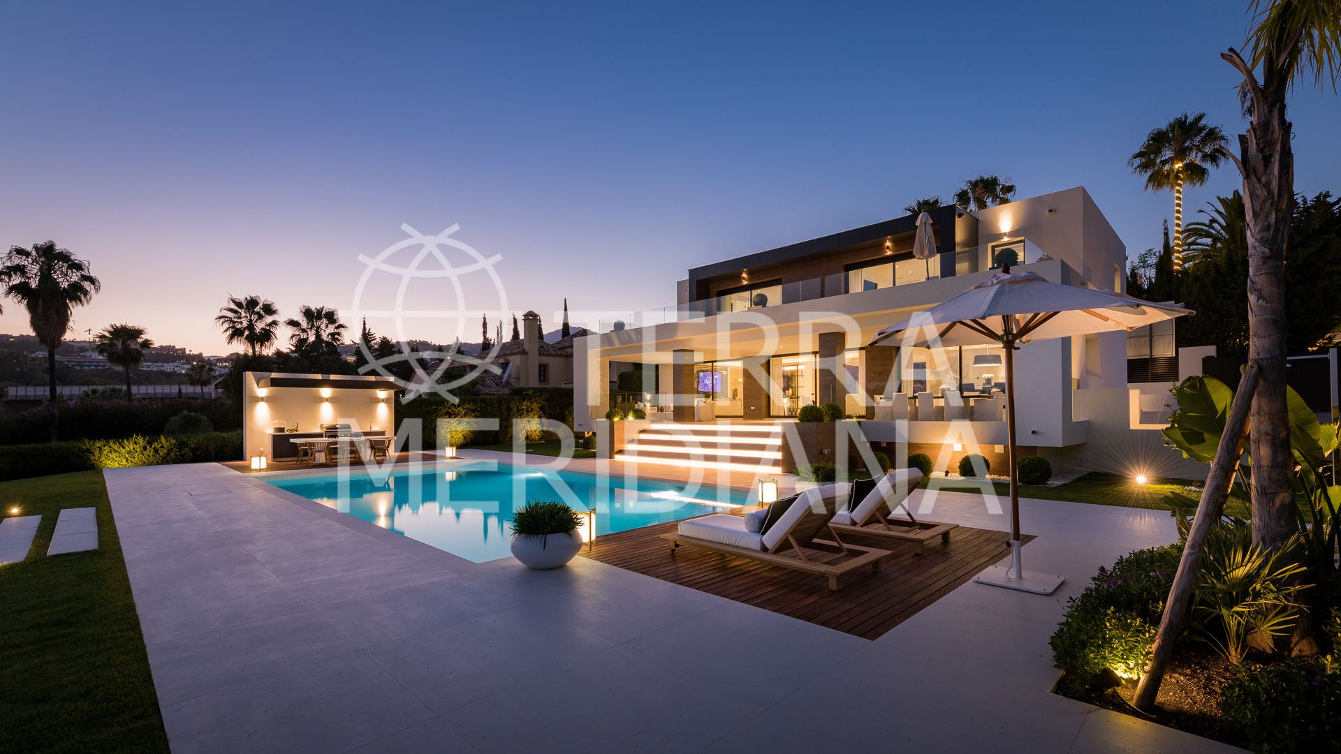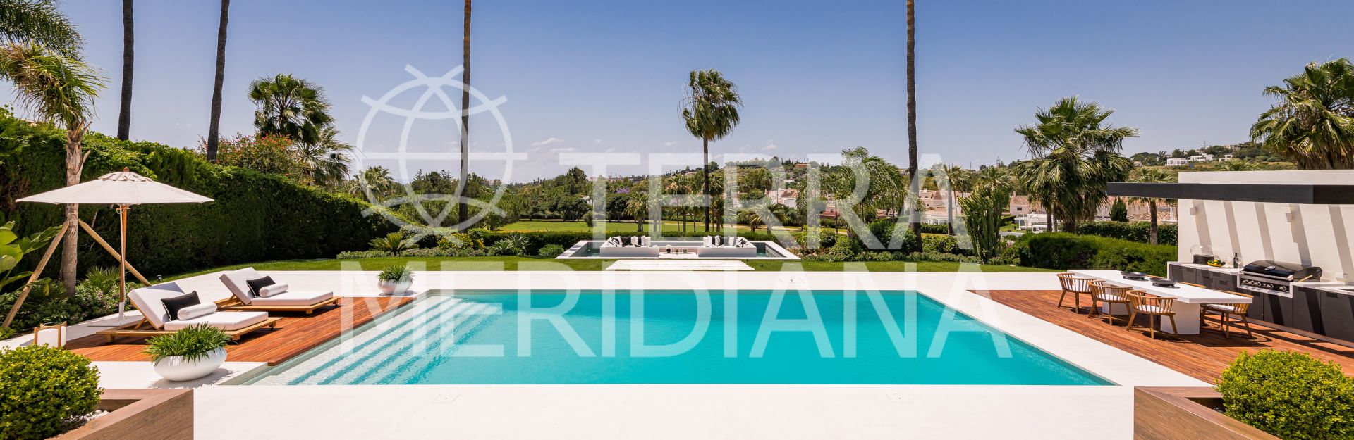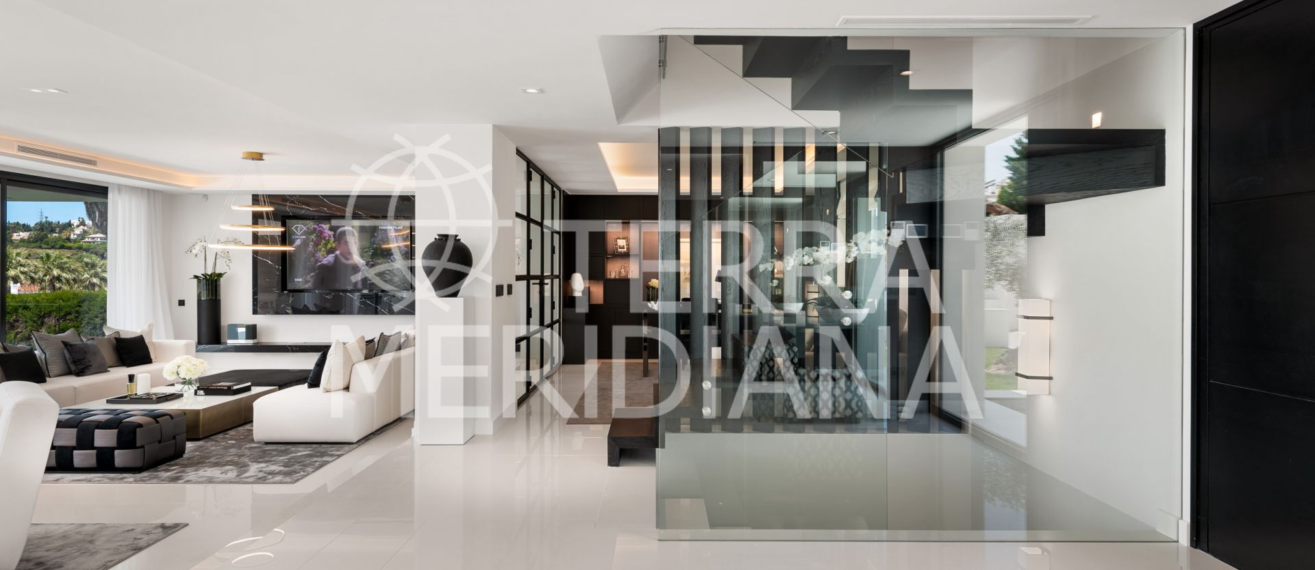Spectacular villa designed by a well-known award-winning architect located in a privileged setting in the heart of the Golf Valley of Nueva Andalucía, one of the most sought-after residential areas on the Costa del Sol. This southwest-facing villa is distributed over three floors and comprises, on the entrance level: bright hall leading to a huge open-plan living area divided into three seating areas, Italian designer kitchen fully equipped with Gaggenau appliances and dining area. All leads to a spacious porch, the beautiful landscaped gardens with a stunning chill out zone with water features, the extra sized heated pool with outside shower and plenty of space to sunbath and the outside BBQ kitchen – all with stunning views over the the golf course. Upstairs: master bedroom with a huge elegant wardrobe, en-suite bathroom and access to the terrace to enjoy the views, even from the bathtub; further suite; 2 bedrooms sharing a bathroom. All bedrooms have spacious built-in oak wardrobes. Lower level: 2 more bedrooms; laundry room; wine cellar; gym and a home-cinema. Built to the highest specifications and finishes, including bathrooms with Dornbracht fittings to mention a few. Quietly located, undisturbed, on an elevated plot on the golf course. Situated only a few minutes’ drive to the renowned Aloha international college and Aloha, with its rich selection of restaurants, bars and amenities. Only 5 minutes’ drive to Aloha Golf, Las Brisas Golf, La Quinta Golf, Magna Marbella Golf, and a wide selection of tennis and paddle tennis courts. Only 10 minutes’ drive to Puerto Banús, the beach and Marbella’s Golden Mile.