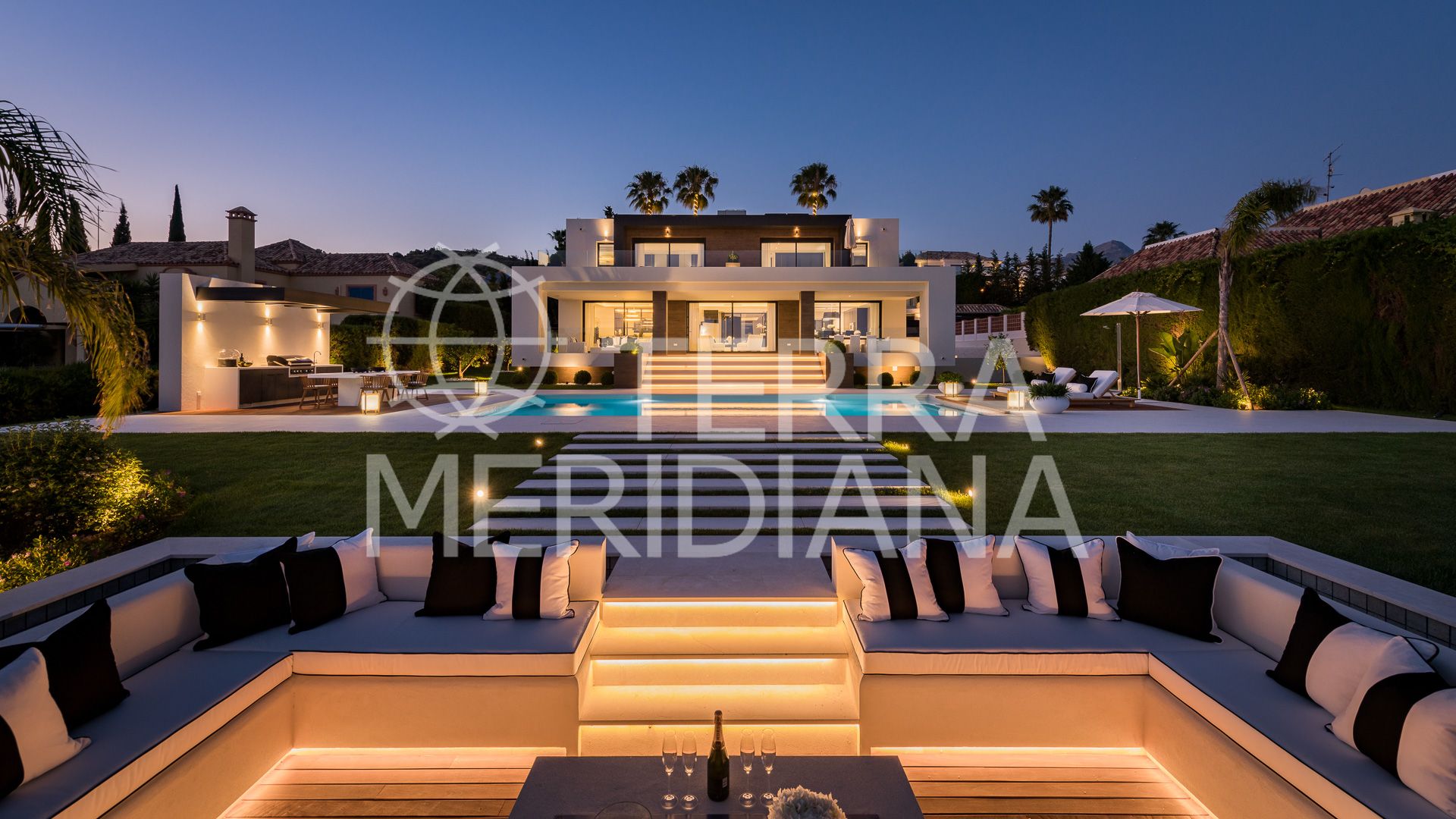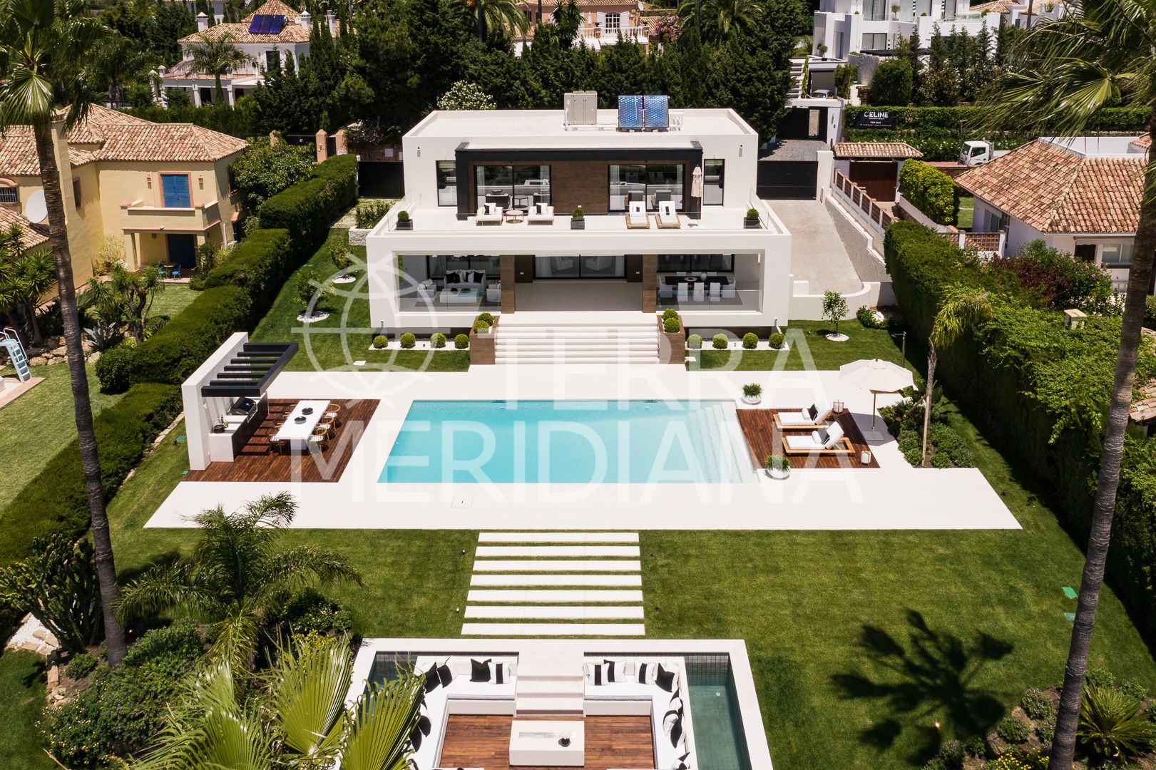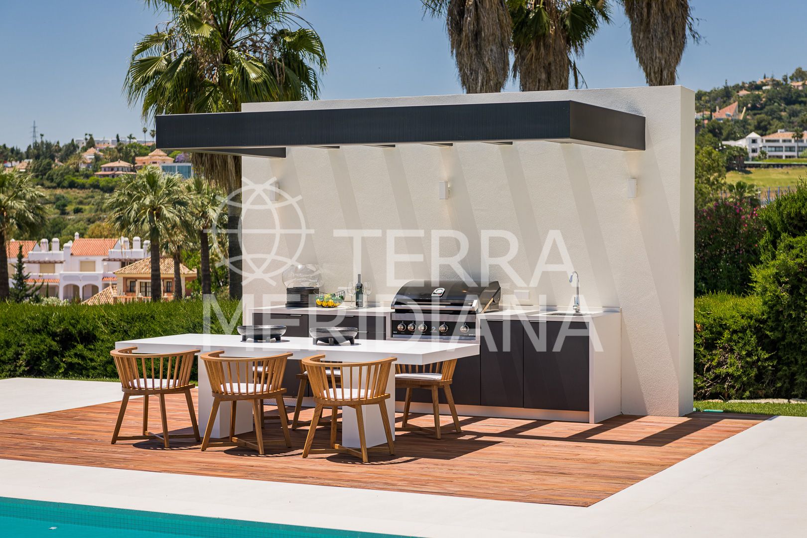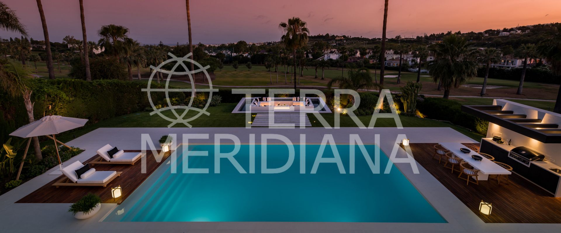 Spectacular villa designed by a well-known award-winning architect located in a privileged setting in the heart of the Golf Valley of Nueva Andalucía, one of the most sought-after residential areas on the Costa del Sol. This southwest-facing villa is distributed over three floors and comprises, on the entrance level: bright hall leading to a huge open-plan living area divided into three seating areas, Italian designer kitchen fully equipped with Gaggenau appliances and dining area. All leads to a spacious porch, the beautiful landscaped gardens with a stunning chill out zone with water features, the extra sized heated pool with outside shower and plenty of space to sunbath and the outside BBQ kitchen – all with stunning views over the the golf course. Upstairs: master bedroom with a huge elegant wardrobe, en-suite bathroom and access to the terrace to enjoy the views, even from the bathtub; further suite; 2 bedrooms sharing a bathroom. All bedrooms have spacious built-in oak wardrobes. Lower level: 2 more bedrooms; laundry room; wine cellar; gym and a home-cinema. Built to the highest specifications and finishes, including bathrooms with Dornbracht fittings to mention a few. Quietly located, undisturbed, on an elevated plot on the golf course. Situated only a few minutes’ drive to the renowned Aloha international college and Aloha, with its rich selection of restaurants, bars and amenities. Only 5 minutes’ drive to Aloha Golf, Las Brisas Golf, La Quinta Golf, Magna Marbella Golf, and a wide selection of tennis and paddle tennis courts. Only 10 minutes’ drive to Puerto Banús, the beach and Marbella’s Golden Mile.