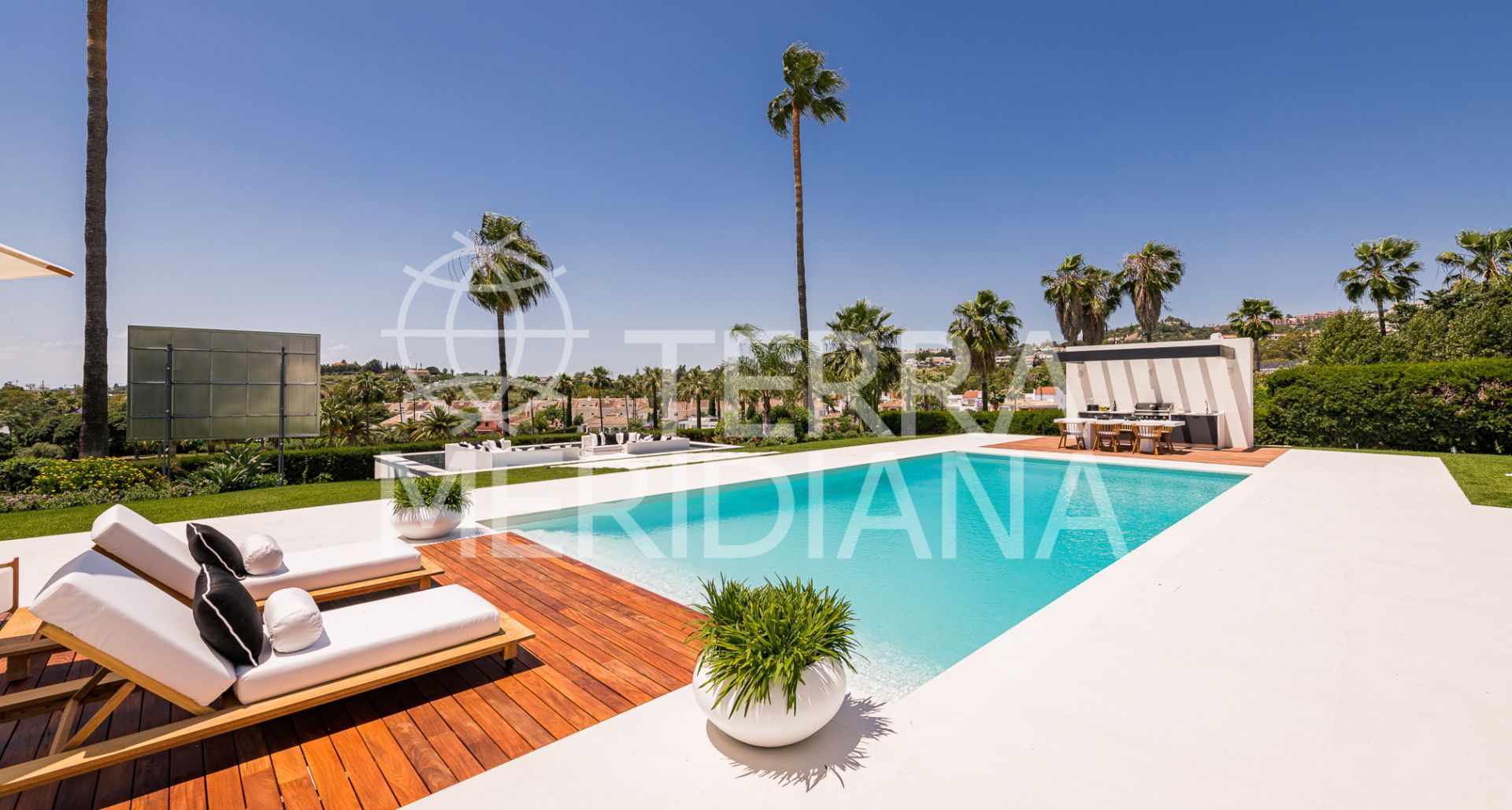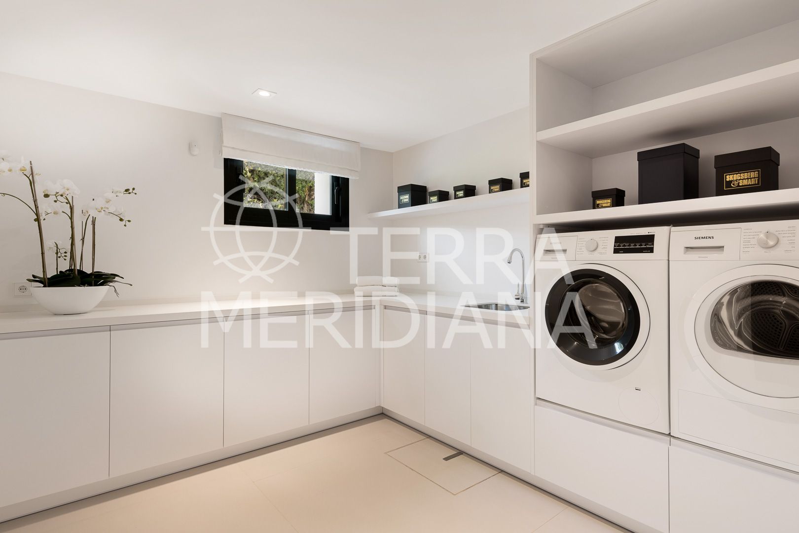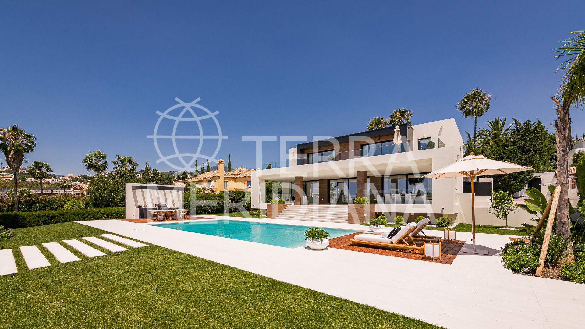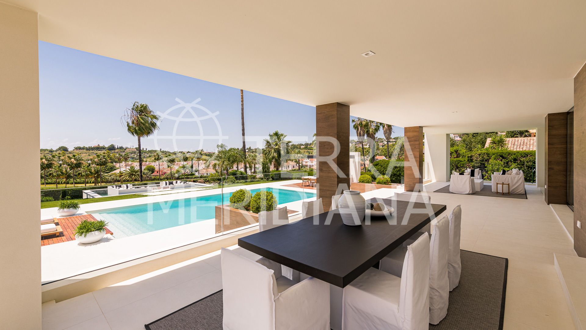 Spectacular villa designed by a well-known award-winning architect located in a privileged setting in the heart of the Golf Valley of Nueva Andalucía, one of the most sought-after residential areas on the Costa del Sol. This southwest-facing villa is distributed over three floors and comprises, on the entrance level: bright hall leading to a huge open-plan living area divided into three seating areas, Italian designer kitchen fully equipped with Gaggenau appliances and dining area. All leads to a spacious porch, the beautiful landscaped gardens with a stunning chill out zone with water features, the extra sized heated pool with outside shower and plenty of space to sunbath and the outside BBQ kitchen – all with stunning views over the the golf course. Upstairs: master bedroom with a huge elegant wardrobe, en-suite bathroom and access to the terrace to enjoy the views, even from the bathtub; further suite; 2 bedrooms sharing a bathroom. All bedrooms have spacious built-in oak wardrobes. Lower level: 2 more bedrooms; laundry room; wine cellar; gym and a home-cinema. Built to the highest specifications and finishes, including bathrooms with Dornbracht fittings to mention a few. Quietly located, undisturbed, on an elevated plot on the golf course. Situated only a few minutes’ drive to the renowned Aloha international college and Aloha, with its rich selection of restaurants, bars and amenities. Only 5 minutes’ drive to Aloha Golf, Las Brisas Golf, La Quinta Golf, Magna Marbella Golf, and a wide selection of tennis and paddle tennis courts. Only 10 minutes’ drive to Puerto Banús, the beach and Marbella’s Golden Mile.