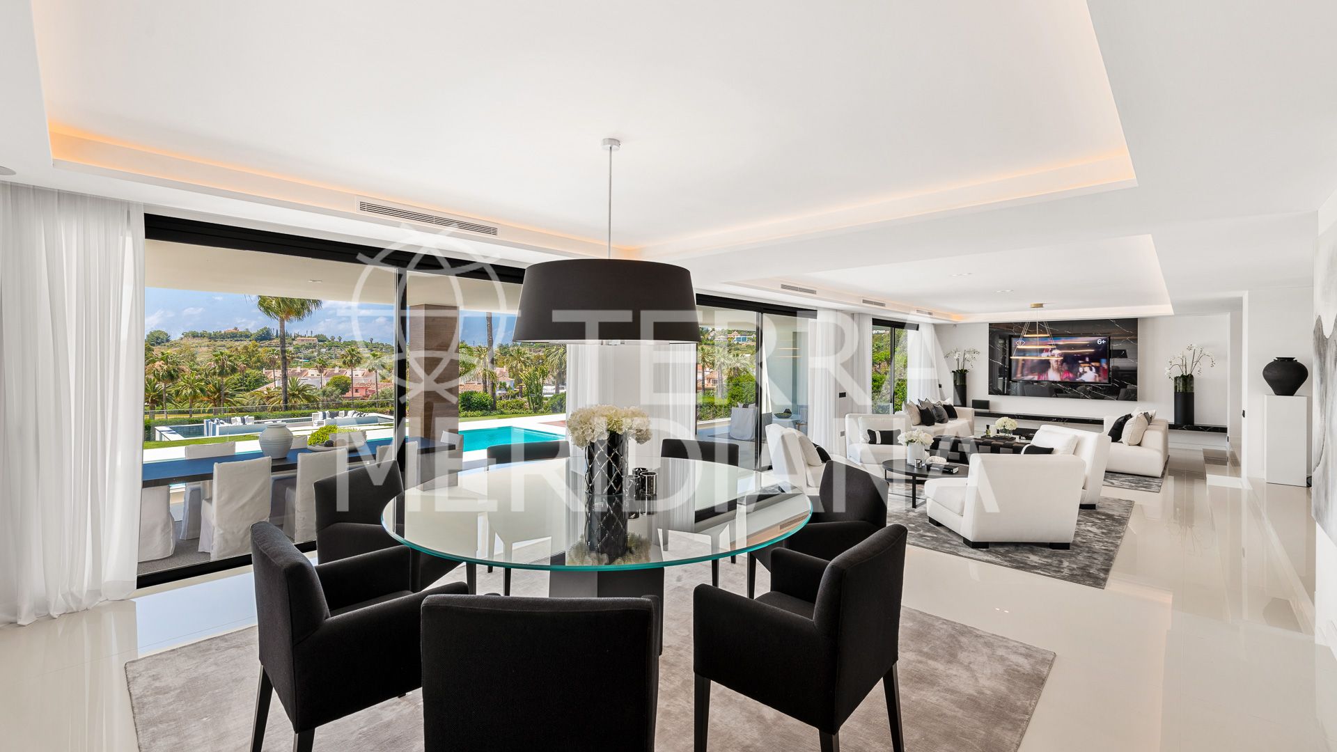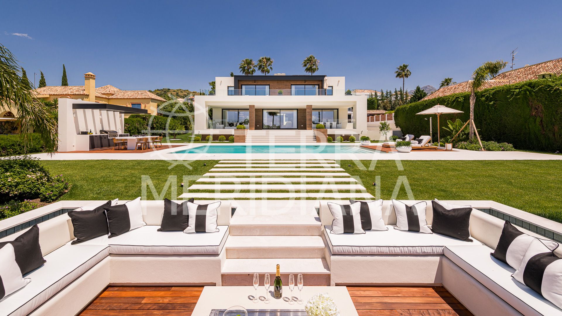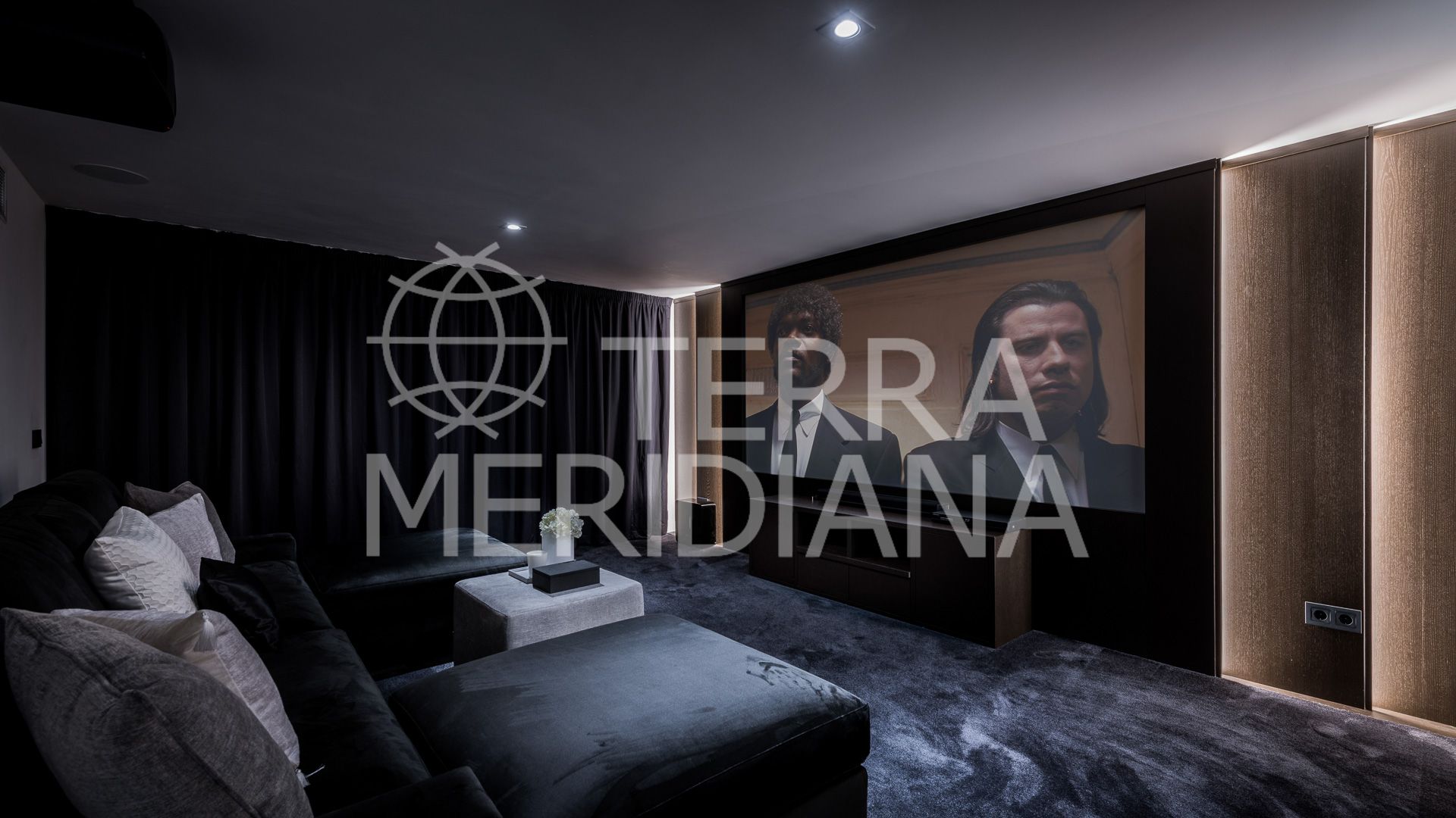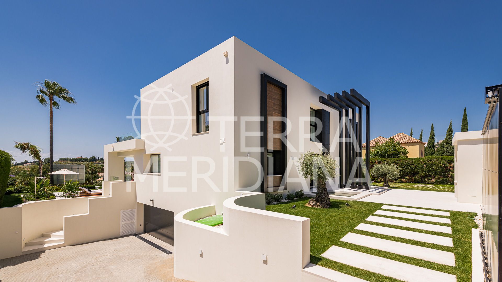 Spectacular villa designed by a well-known award-winning architect located in a privileged setting in the heart of the Golf Valley of Nueva Andalucía, one of the most sought-after residential areas on the Costa del Sol. This southwest-facing villa is distributed over three floors and comprises, on the entrance level: bright hall leading to a huge open-plan living area divided into three seating areas, Italian designer kitchen fully equipped with Gaggenau appliances and dining area. All leads to a spacious porch, the beautiful landscaped gardens with a stunning chill out zone with water features, the extra sized heated pool with outside shower and plenty of space to sunbath and the outside BBQ kitchen – all with stunning views over the the golf course. Upstairs: master bedroom with a huge elegant wardrobe, en-suite bathroom and access to the terrace to enjoy the views, even from the bathtub; further suite; 2 bedrooms sharing a bathroom. All bedrooms have spacious built-in oak wardrobes. Lower level: 2 more bedrooms; laundry room; wine cellar; gym and a home-cinema. Built to the highest specifications and finishes, including bathrooms with Dornbracht fittings to mention a few. Quietly located, undisturbed, on an elevated plot on the golf course. Situated only a few minutes’ drive to the renowned Aloha international college and Aloha, with its rich selection of restaurants, bars and amenities. Only 5 minutes’ drive to Aloha Golf, Las Brisas Golf, La Quinta Golf, Magna Marbella Golf, and a wide selection of tennis and paddle tennis courts. Only 10 minutes’ drive to Puerto Banús, the beach and Marbella’s Golden Mile.