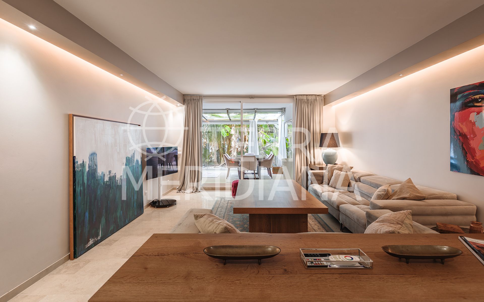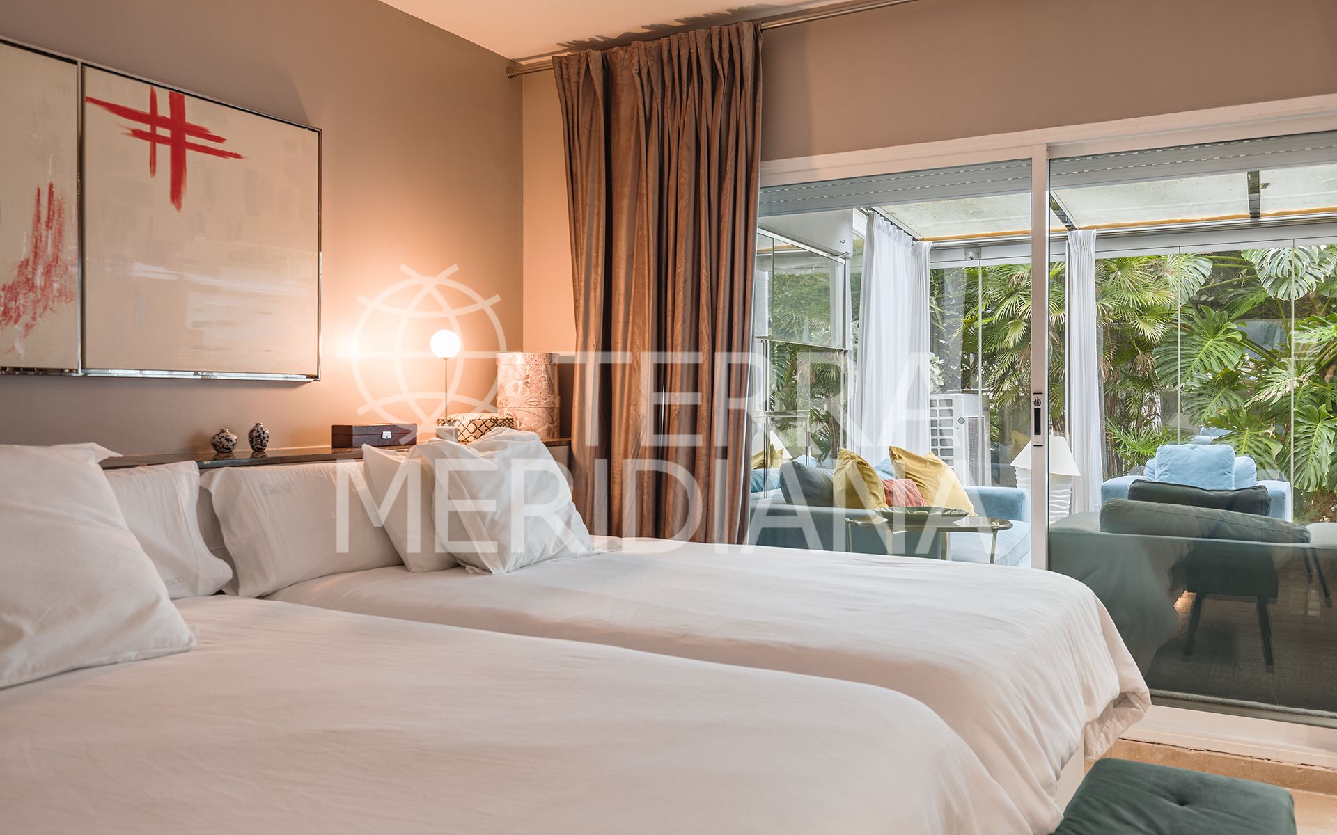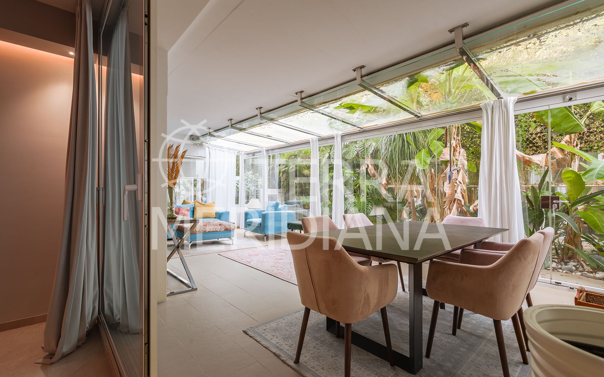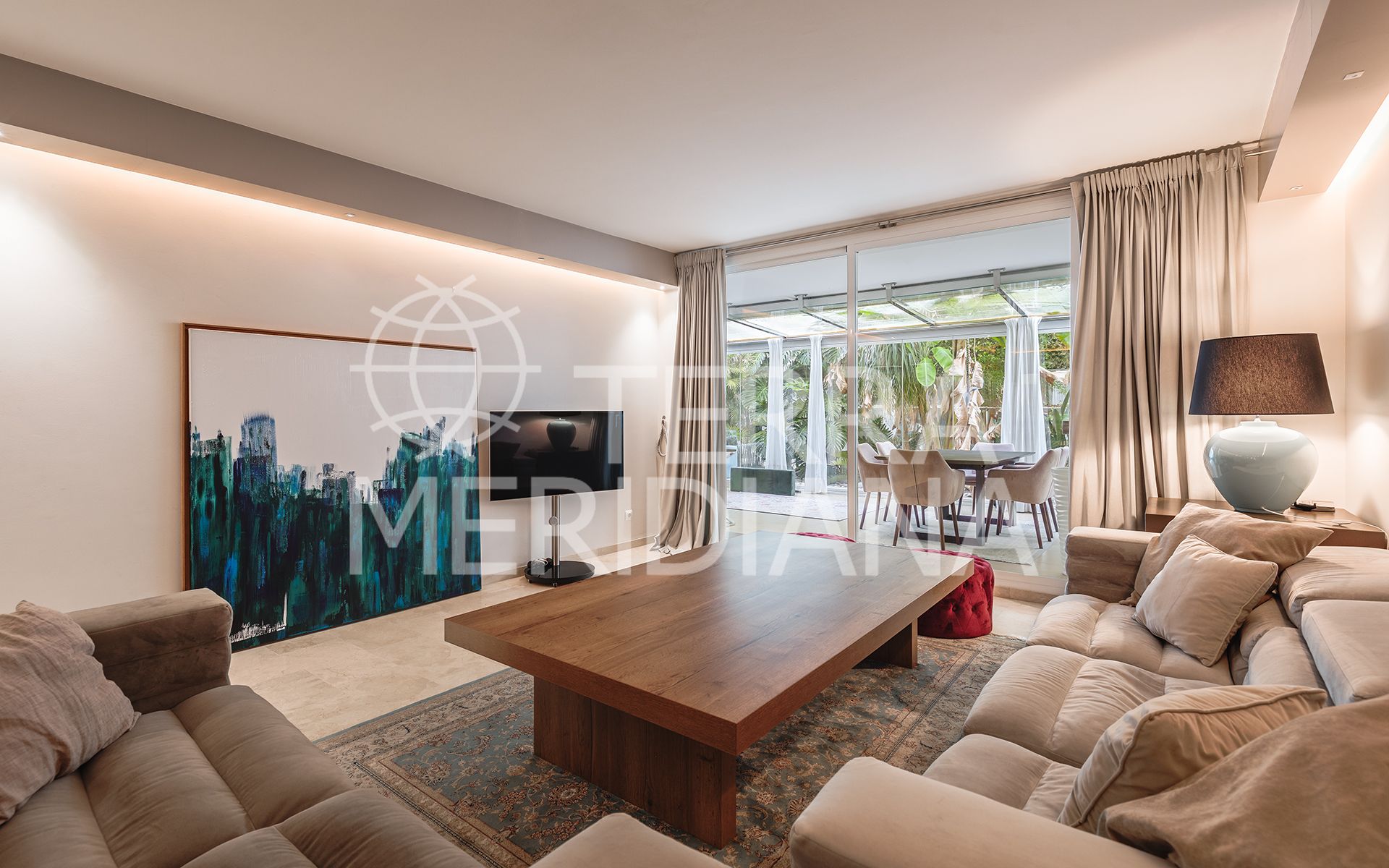 Exquisitely presented ground-floor apartment located in a 24-hour secured complex in Las Lomas del Marbella Club, in the heart of the Golden Mile. The property has been completely renovated and makes incredible use of the open floor plan that blends the kitchen, living room and large outdoor terrace seamlessly. Large floor-to-ceiling windows open up from the living room to a lush tropical garden and covered terrace with adjustable glass curtains that can be opened in the summer months to provide an incredible entertaining space within a very private setting. The apartment makes the most of the square meters and provides two spacious bedrooms, each with their own en-suite bathroom. The master bedroom opens up and connects with the large terrace towards the back of the unit. The complex offers an outdoor pool with wonderful sea views, gym and sauna for residents. The property comes with 1 parking space and a large storage room. Situated in a sought-after area, approximately half-way between Marbella Town and Puerto Banús.