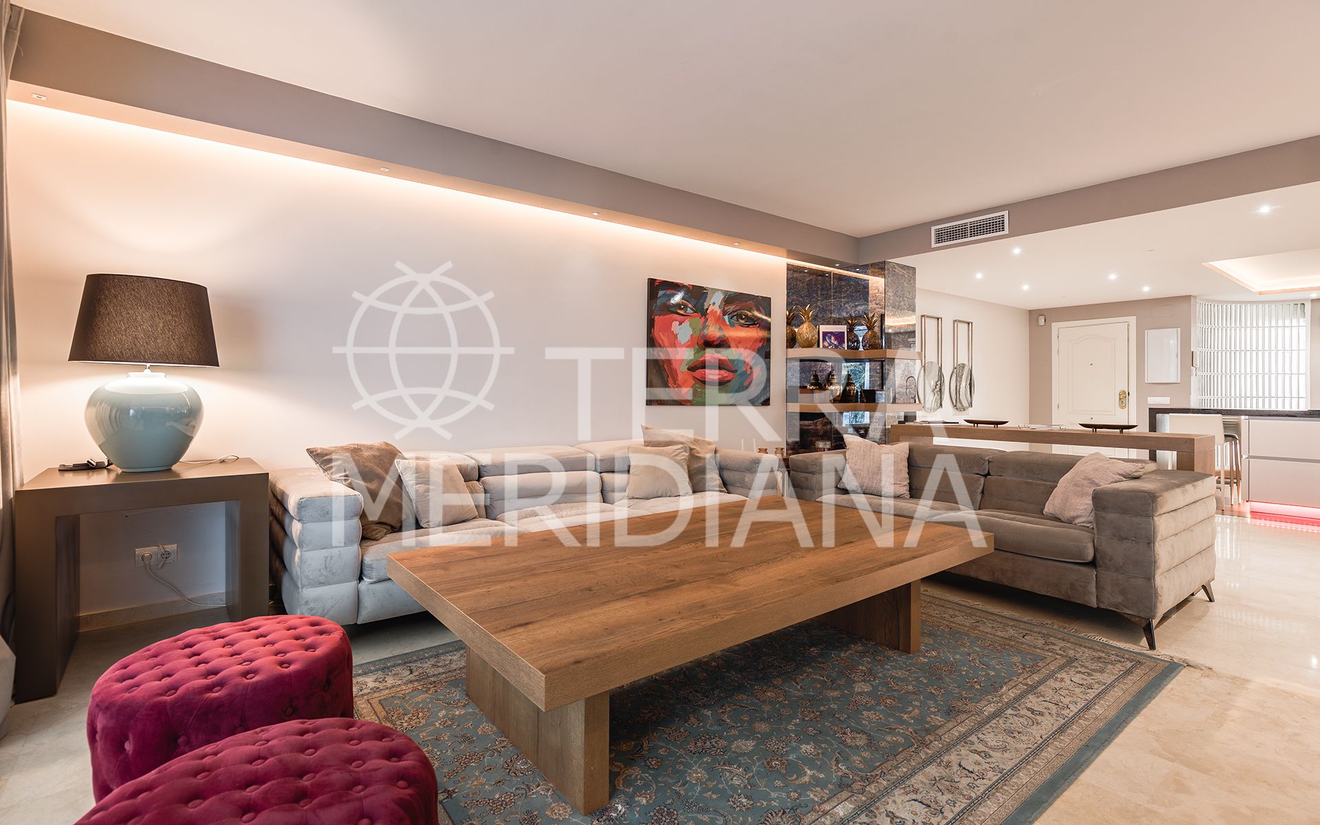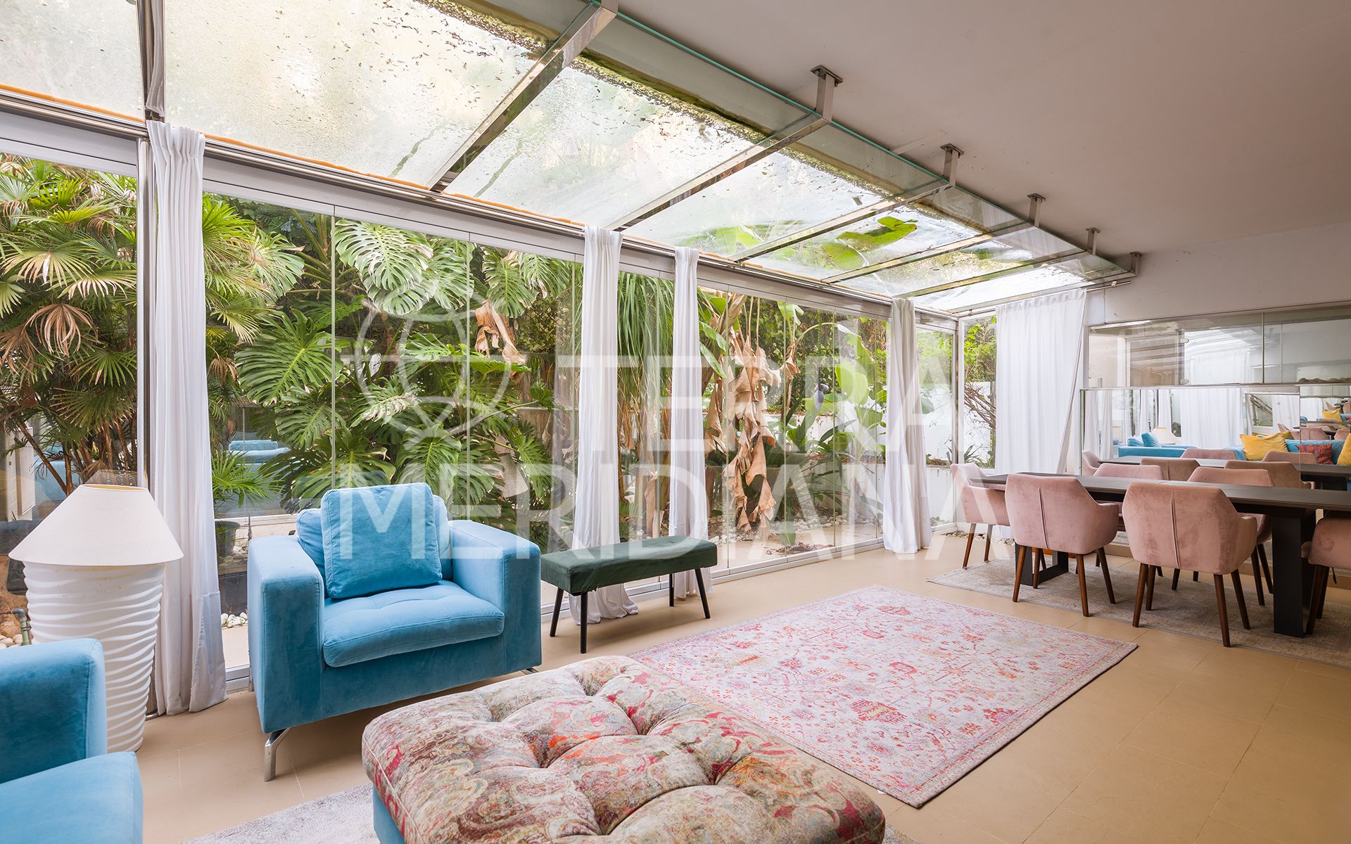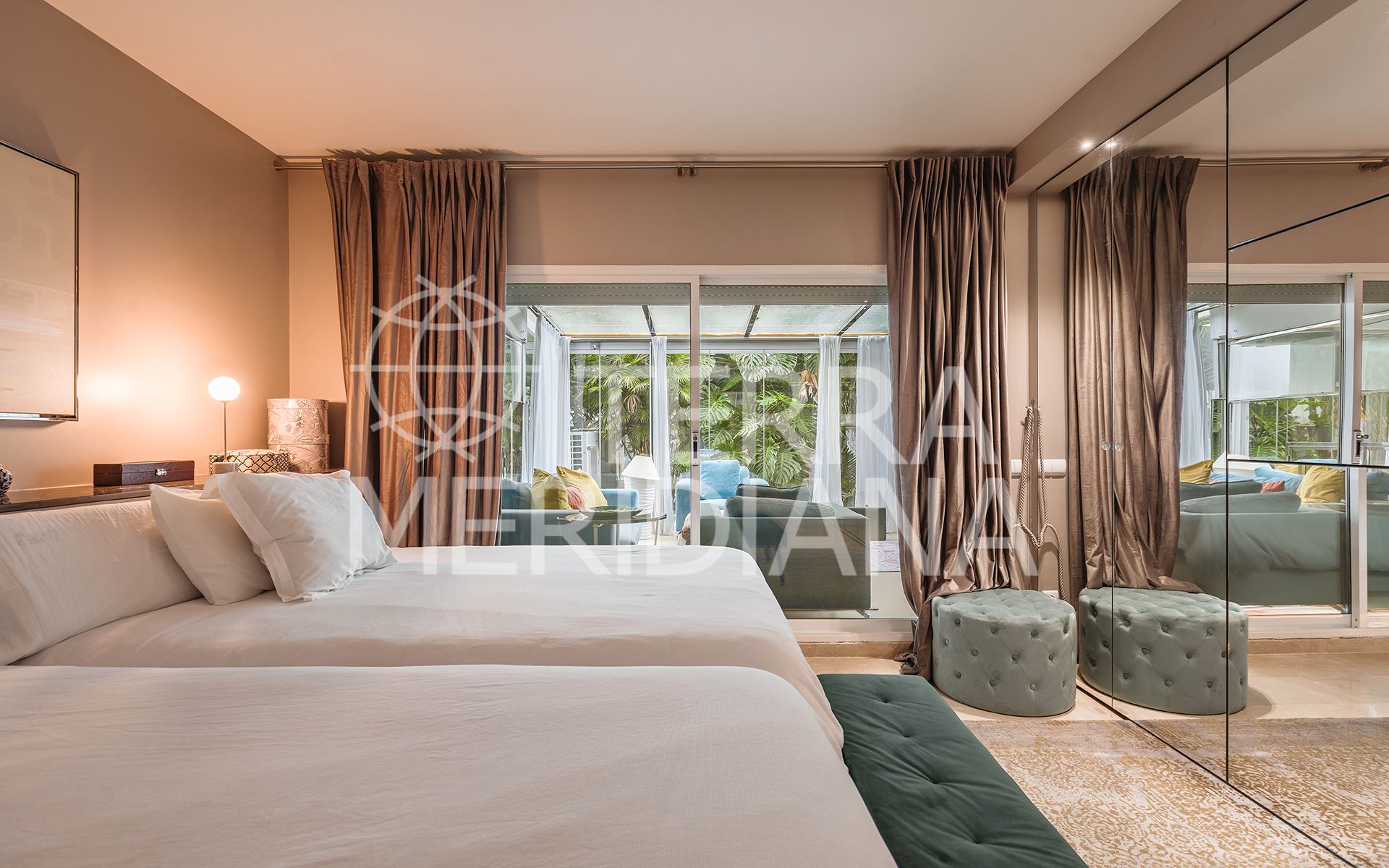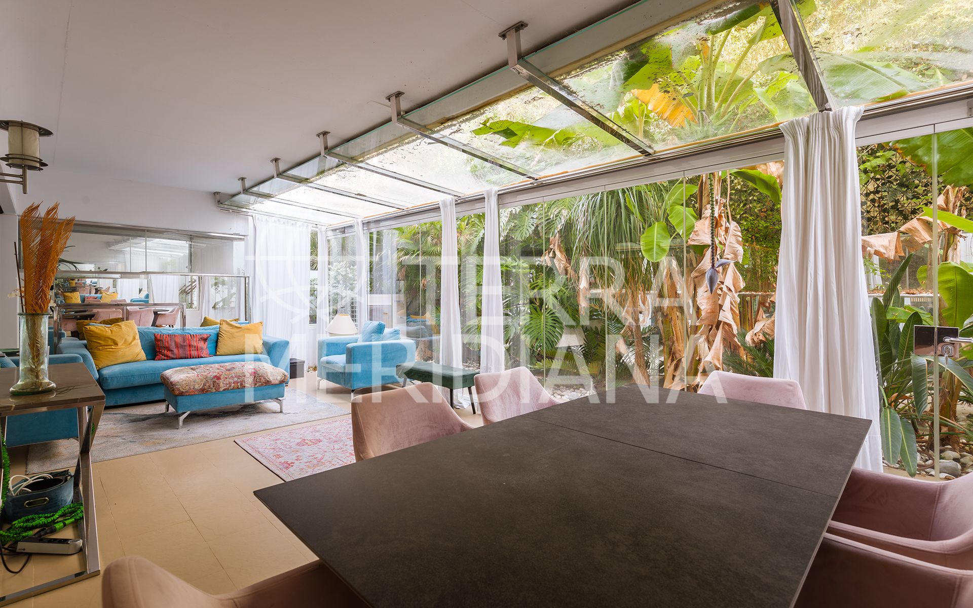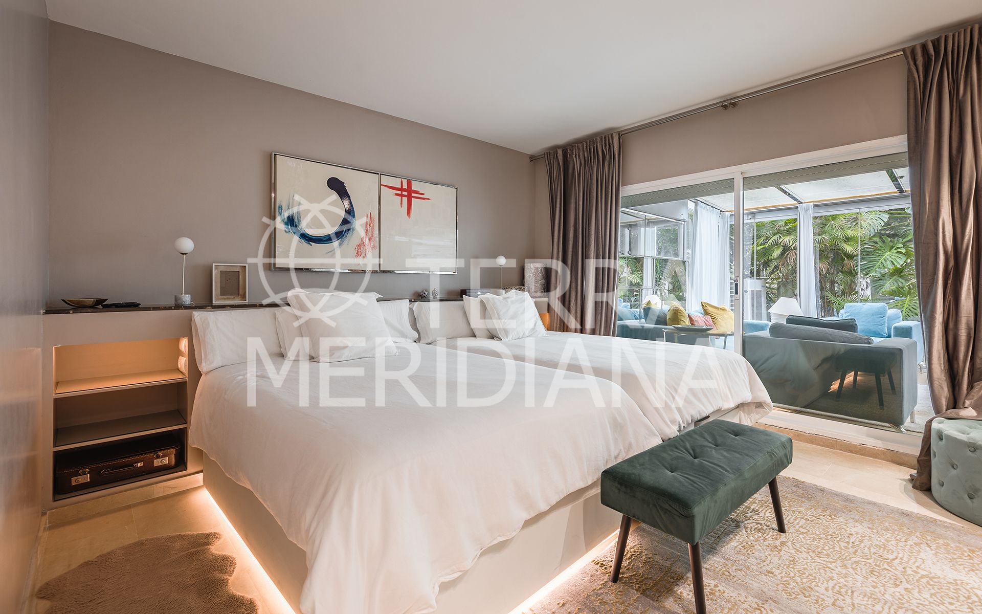 Exquisitely presented ground-floor apartment located in a 24-hour secured complex in Las Lomas del Marbella Club, in the heart of the Golden Mile. The property has been completely renovated and makes incredible use of the open floor plan that blends the kitchen, living room and large outdoor terrace seamlessly. Large floor-to-ceiling windows open up from the living room to a lush tropical garden and covered terrace with adjustable glass curtains that can be opened in the summer months to provide an incredible entertaining space within a very private setting. The apartment makes the most of the square meters and provides two spacious bedrooms, each with their own en-suite bathroom. The master bedroom opens up and connects with the large terrace towards the back of the unit. The complex offers an outdoor pool with wonderful sea views, gym and sauna for residents. The property comes with 1 parking space and a large storage room. Situated in a sought-after area, approximately half-way between Marbella Town and Puerto Banús.