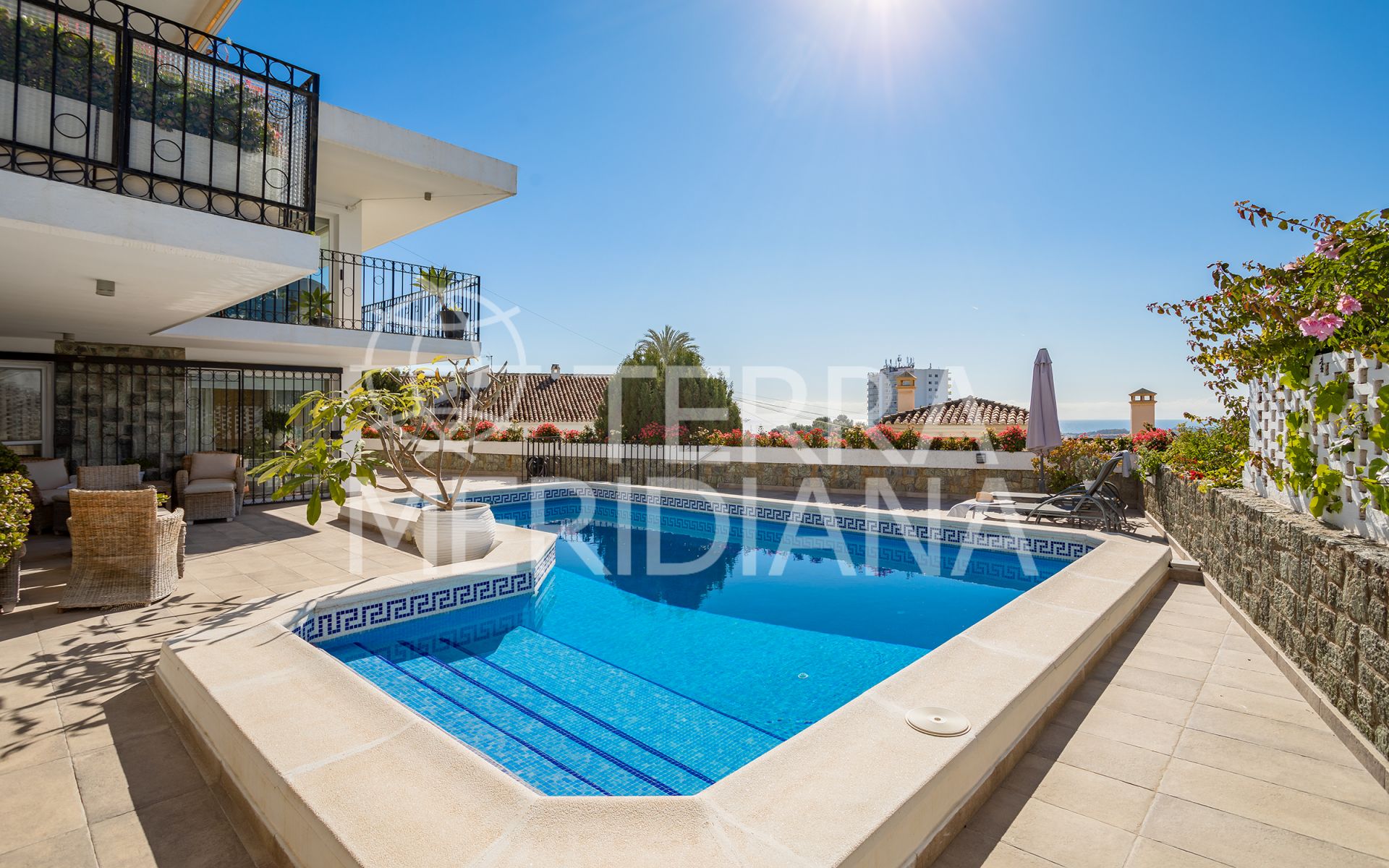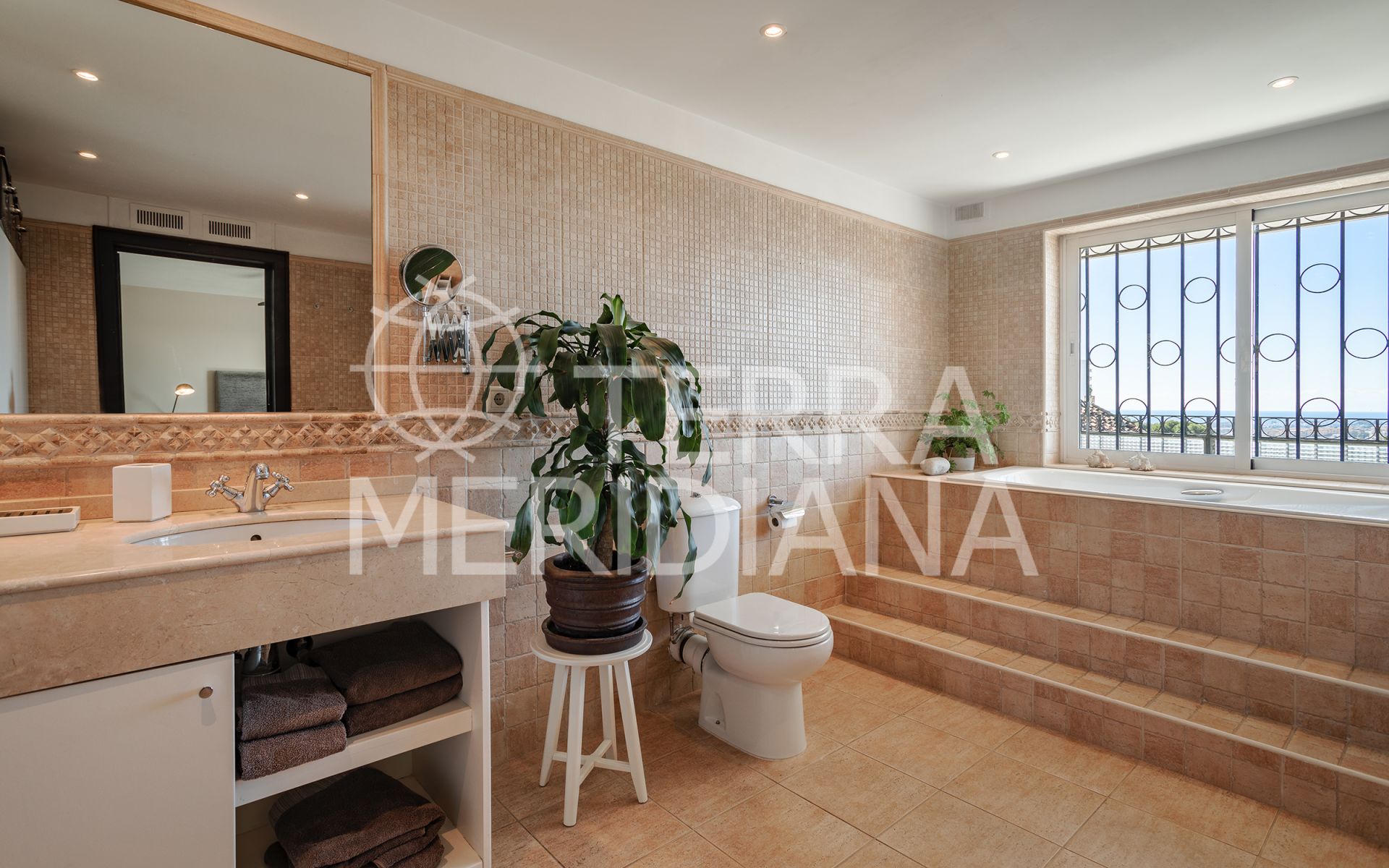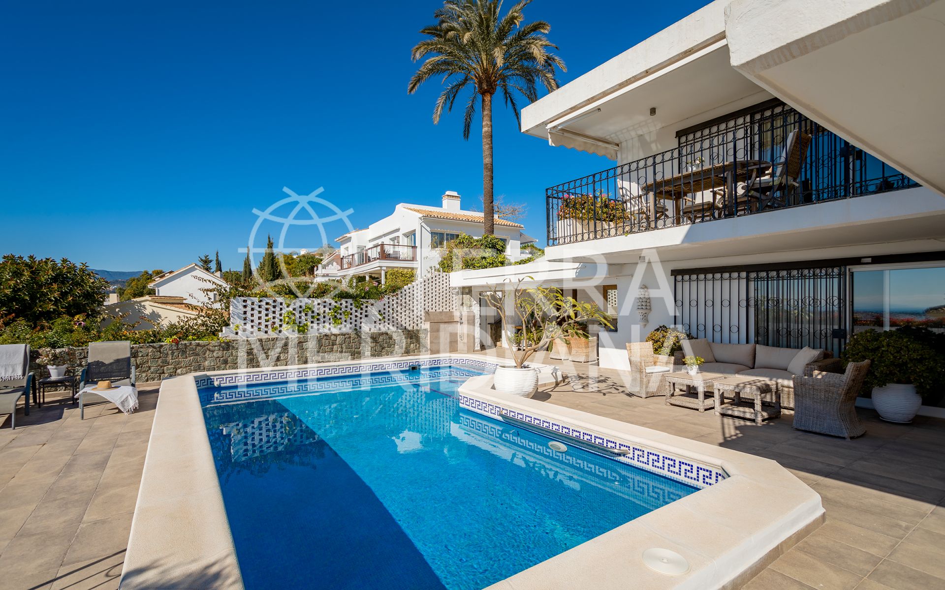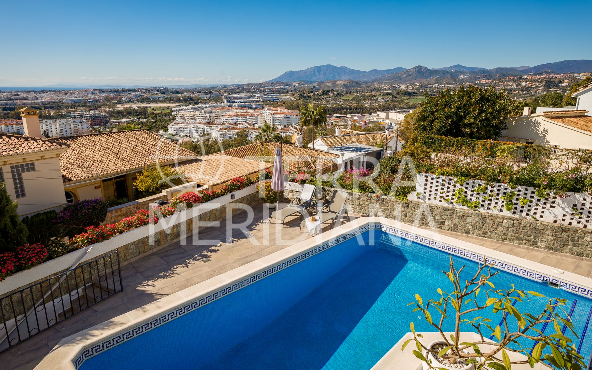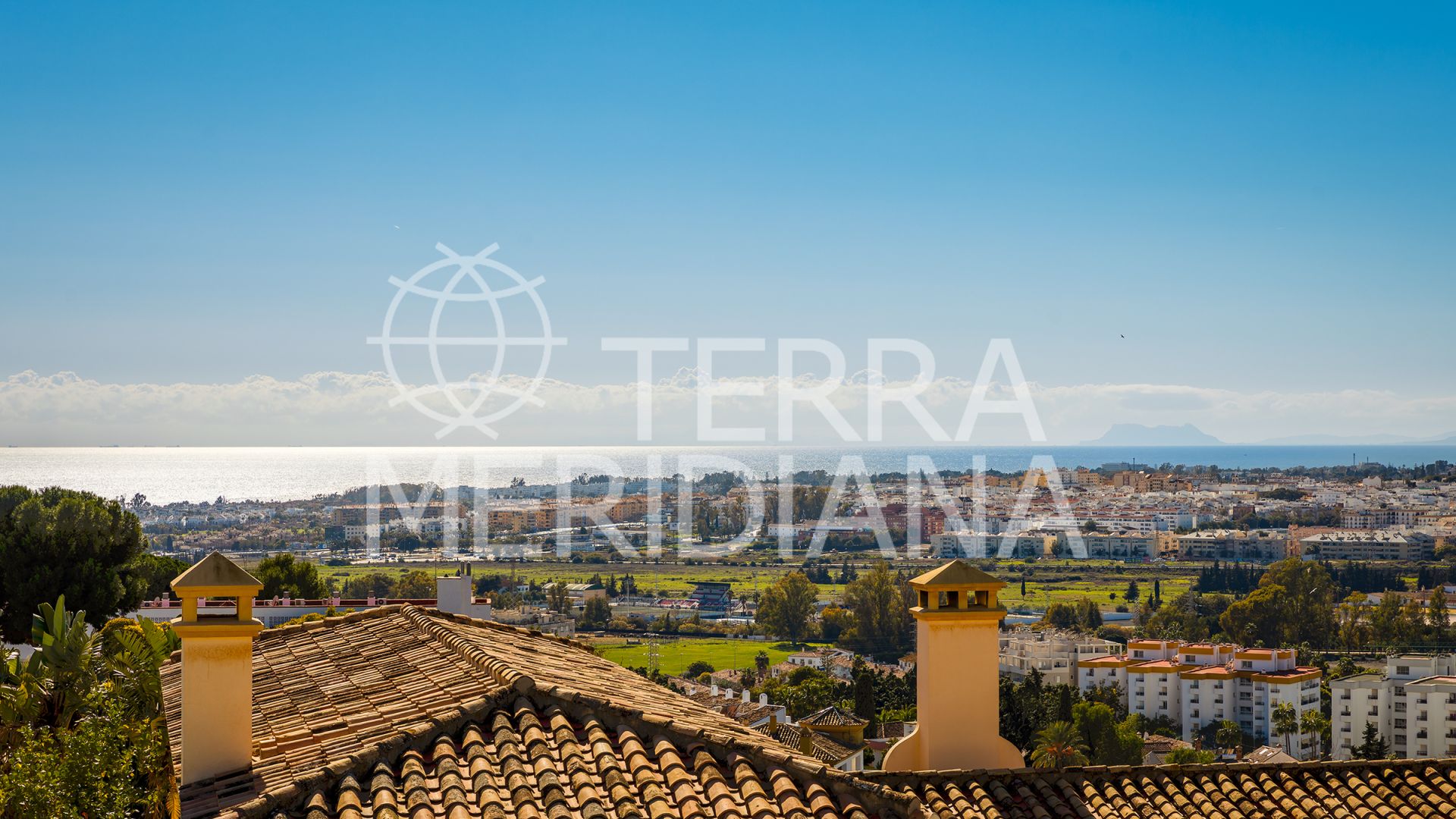 Fantastic villa with panoramic sea views walking distance to amenities in Nueva Andalucia. Built on three levels, property comprises, on entrance level: en-suite master bedroom; living/dining room with fireplace and access to the terraces enjoying the panoramic sea views; fully equipped kitchen with laundry room & dirty kitchen with separate entrance; guest toilet. Middle floor: double sitting room with fireplace and access to the heated swimming pool & bbq area; an office; 2 bedrooms sharing a bathroom; and a guest toilet. Basement: en-suite bedroom; garage with space for 4 cars; 2 large storages; a tool workshop; a wine cellar; the machinery room. Extra features include: alarm system; underfloor heating in the bathrooms; solar panels for the whole electric system. A property with lots of potential just a 5-minute drive (or 25-minute walk) to the beach and Puerto Banús.
