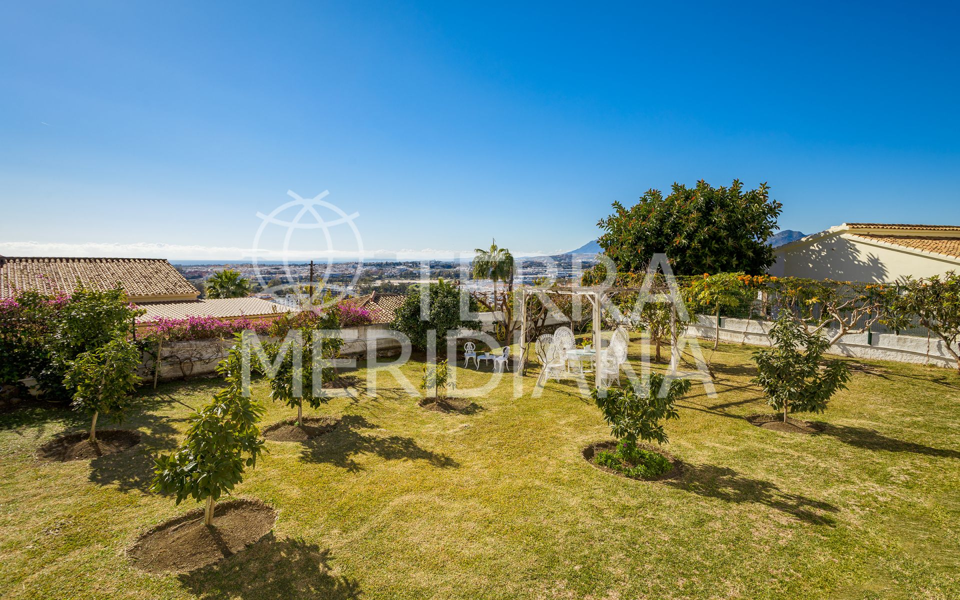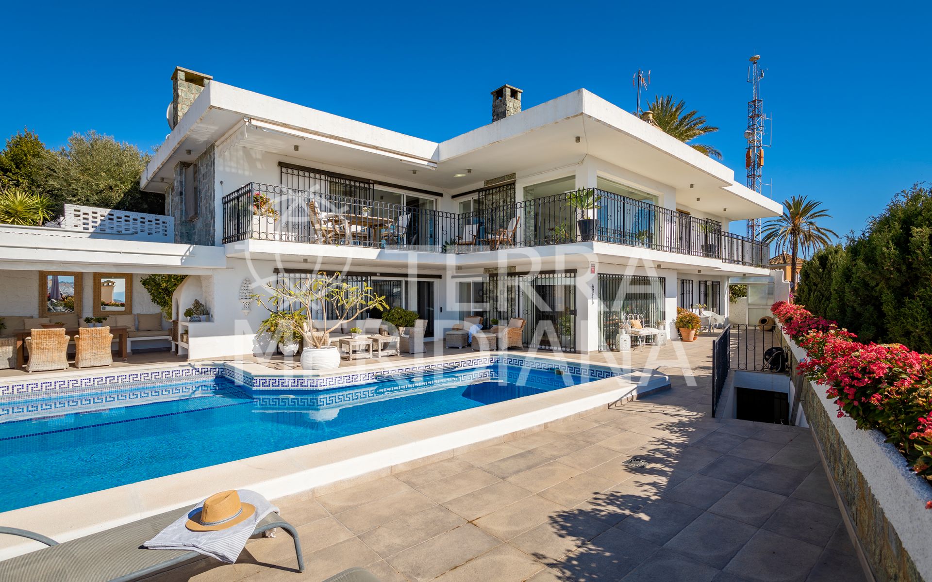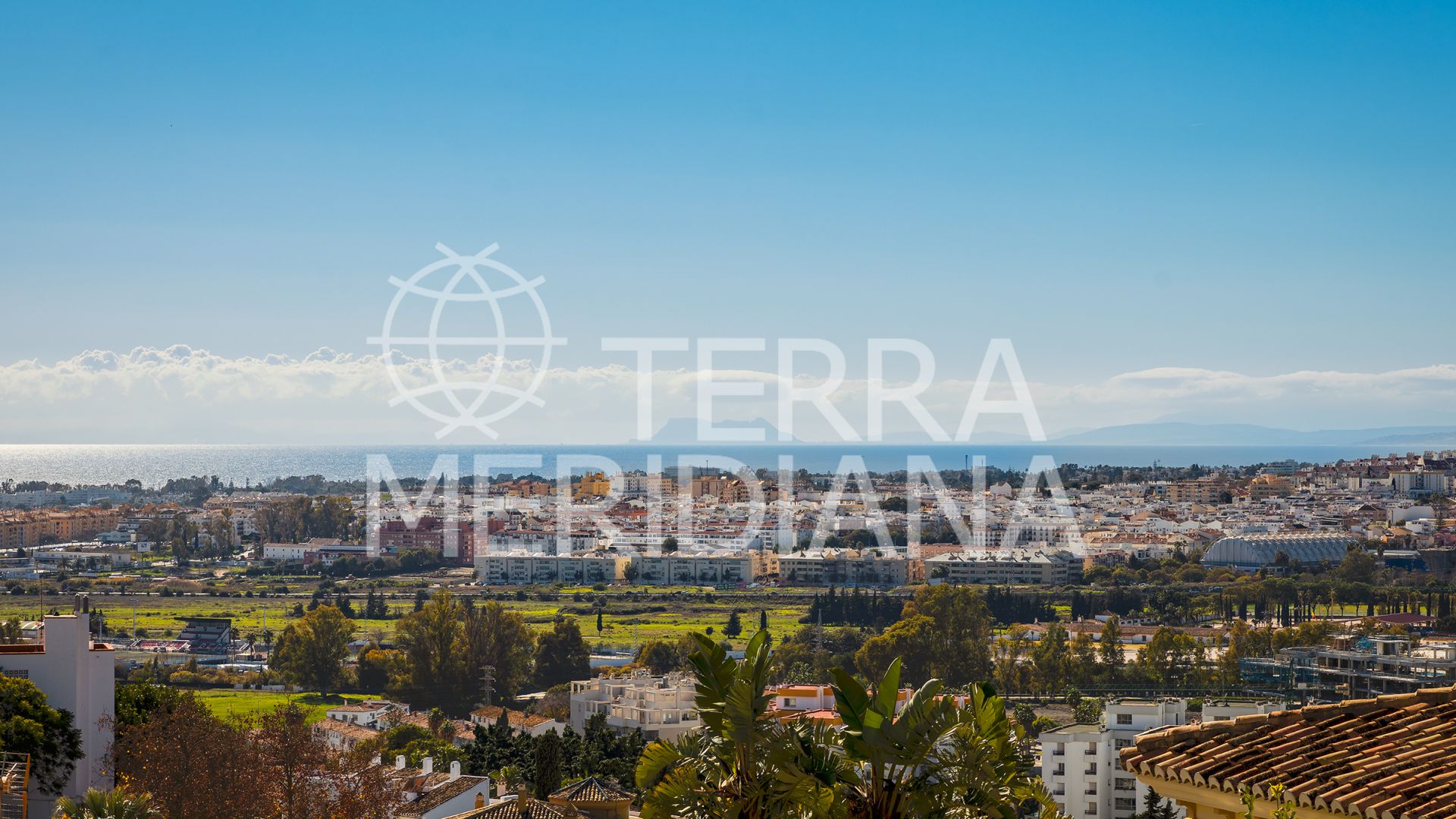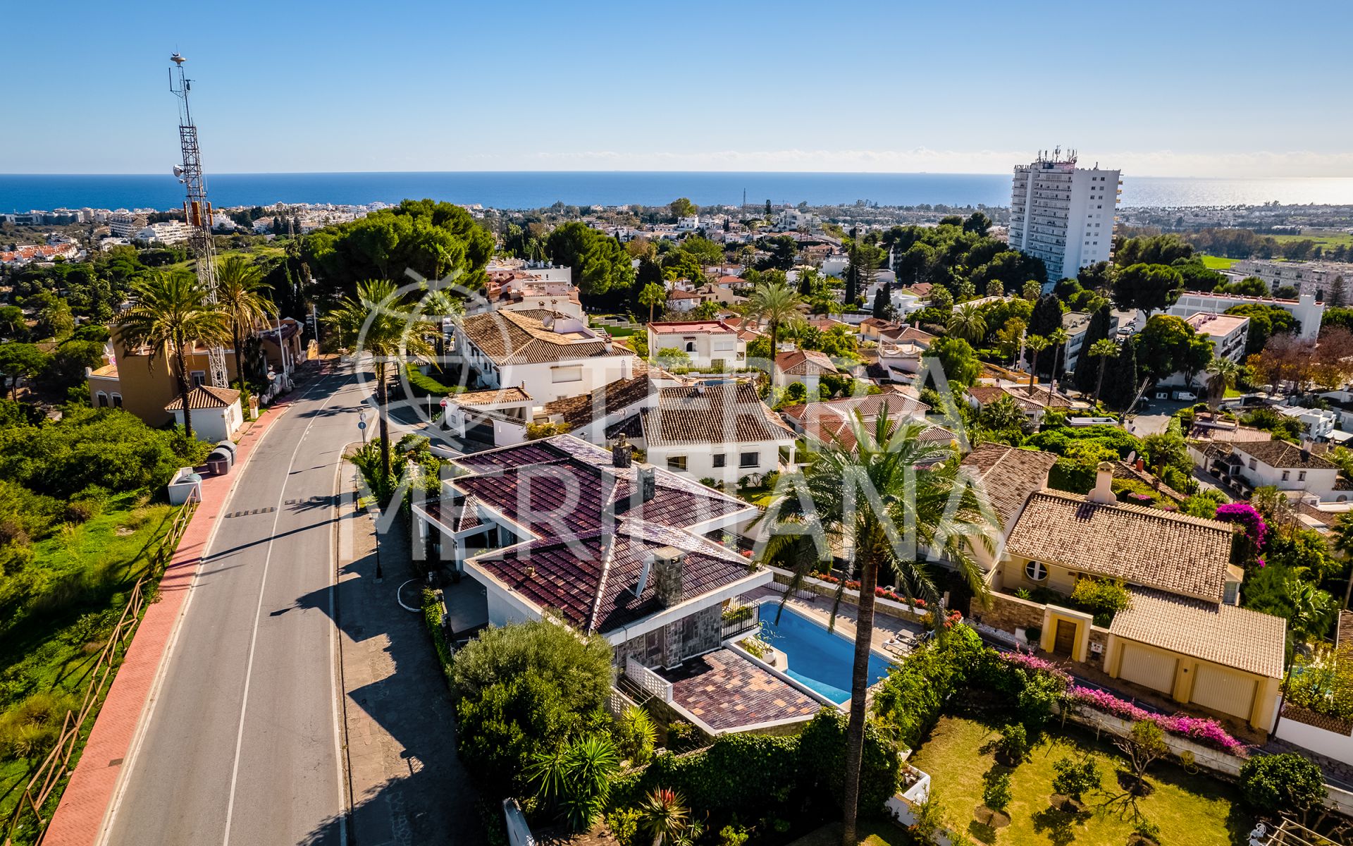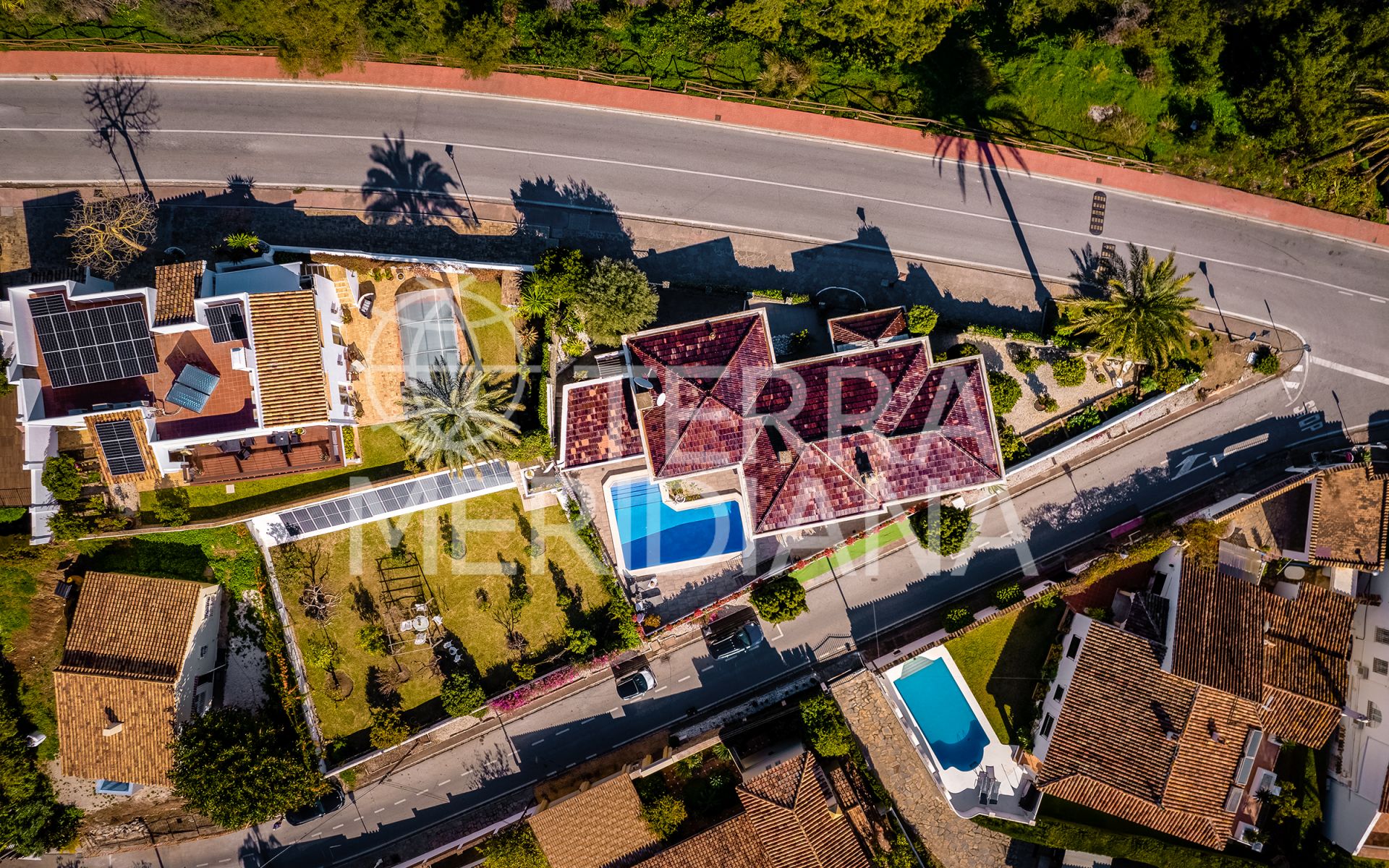 Fantastic villa with panoramic sea views walking distance to amenities in Nueva Andalucia. Built on three levels, property comprises, on entrance level: en-suite master bedroom; living/dining room with fireplace and access to the terraces enjoying the panoramic sea views; fully equipped kitchen with laundry room & dirty kitchen with separate entrance; guest toilet. Middle floor: double sitting room with fireplace and access to the heated swimming pool & bbq area; an office; 2 bedrooms sharing a bathroom; and a guest toilet. Basement: en-suite bedroom; garage with space for 4 cars; 2 large storages; a tool workshop; a wine cellar; the machinery room. Extra features include: alarm system; underfloor heating in the bathrooms; solar panels for the whole electric system. A property with lots of potential just a 5-minute drive (or 25-minute walk) to the beach and Puerto Banús.