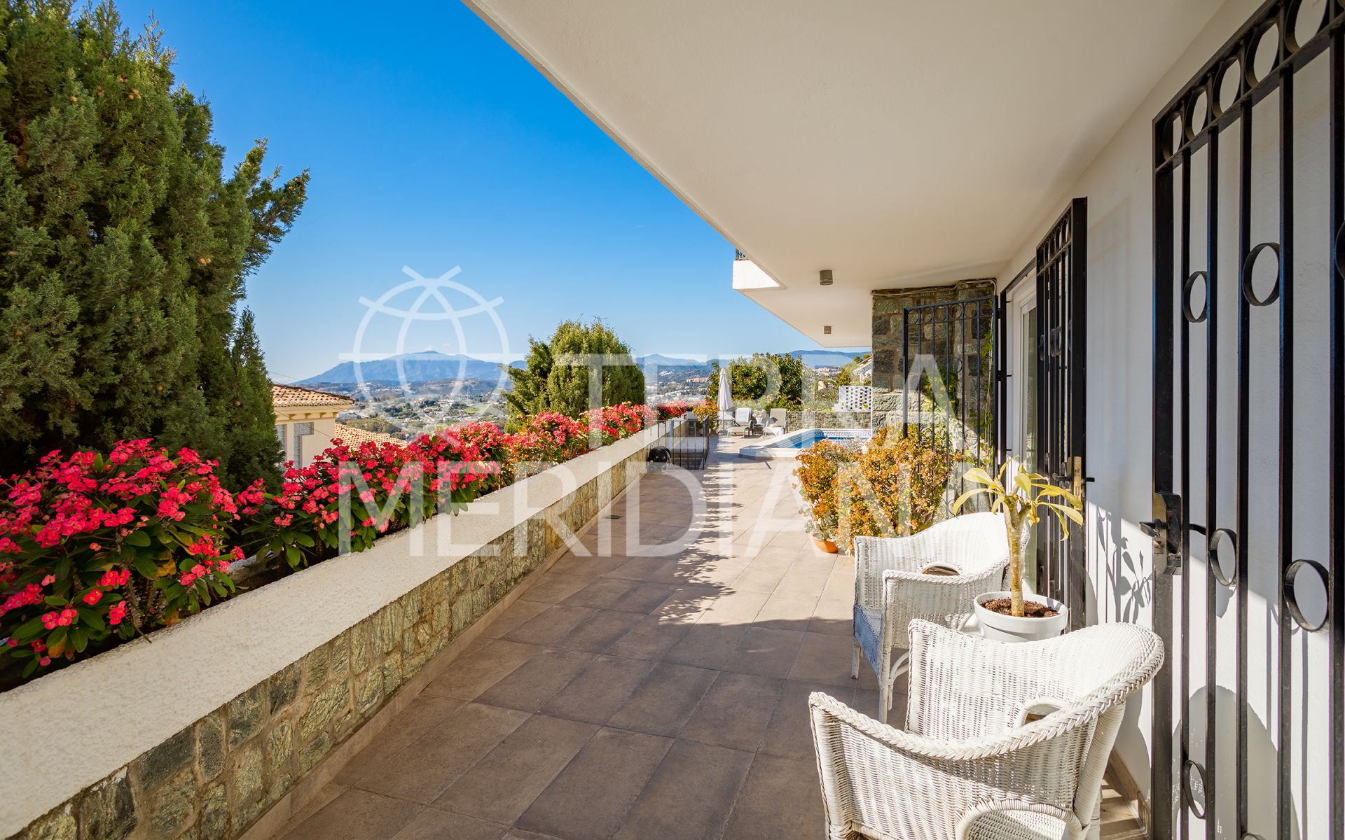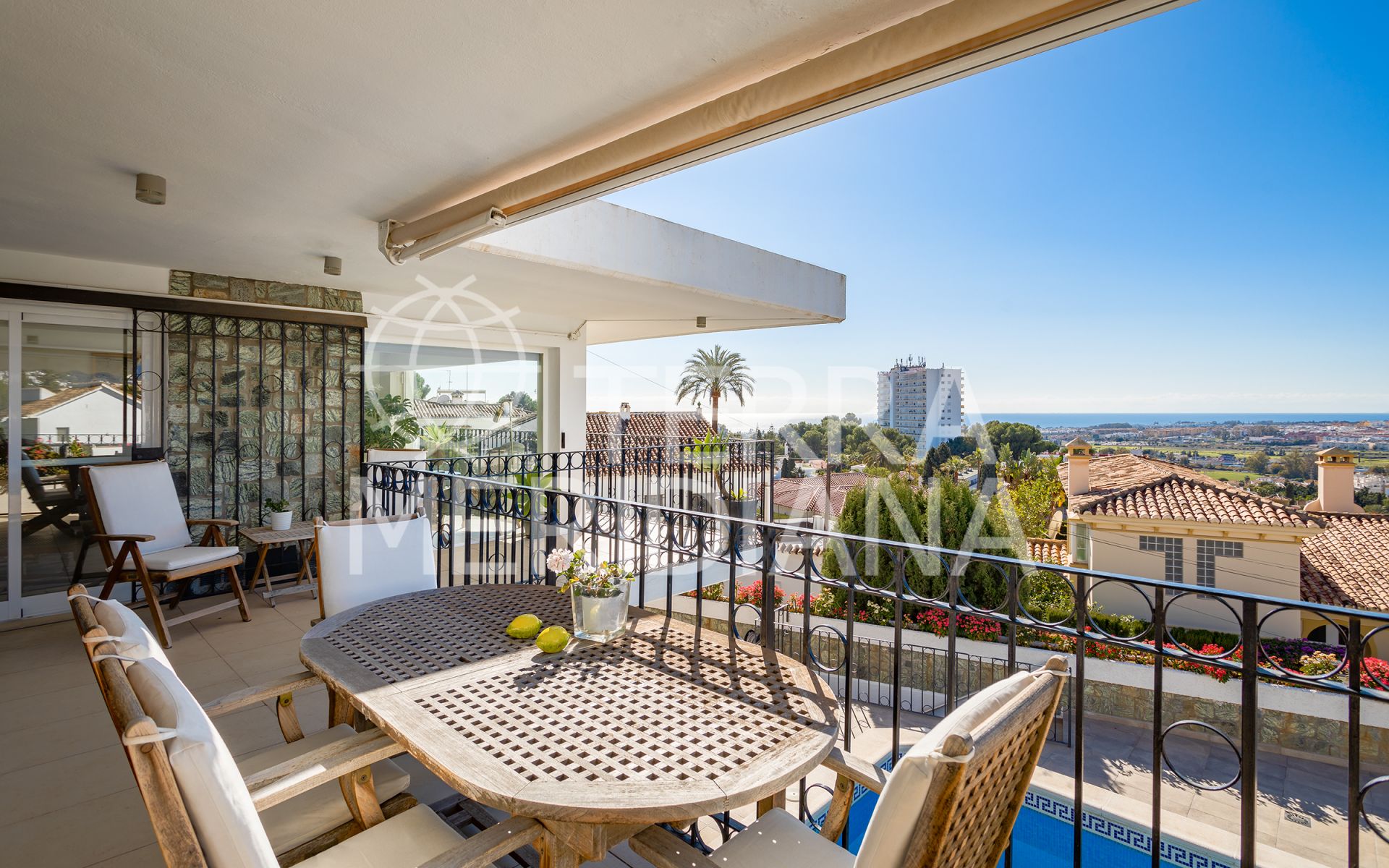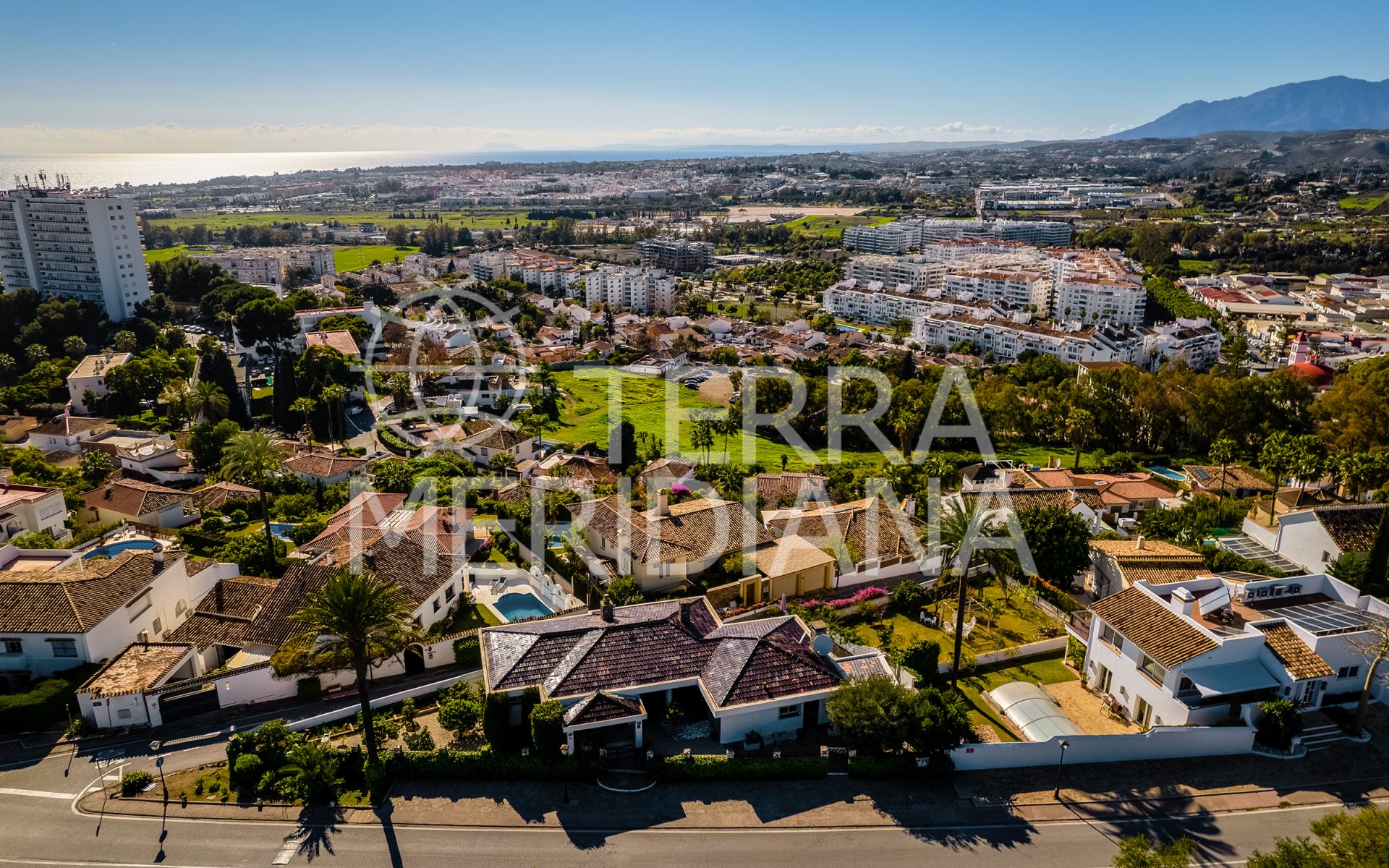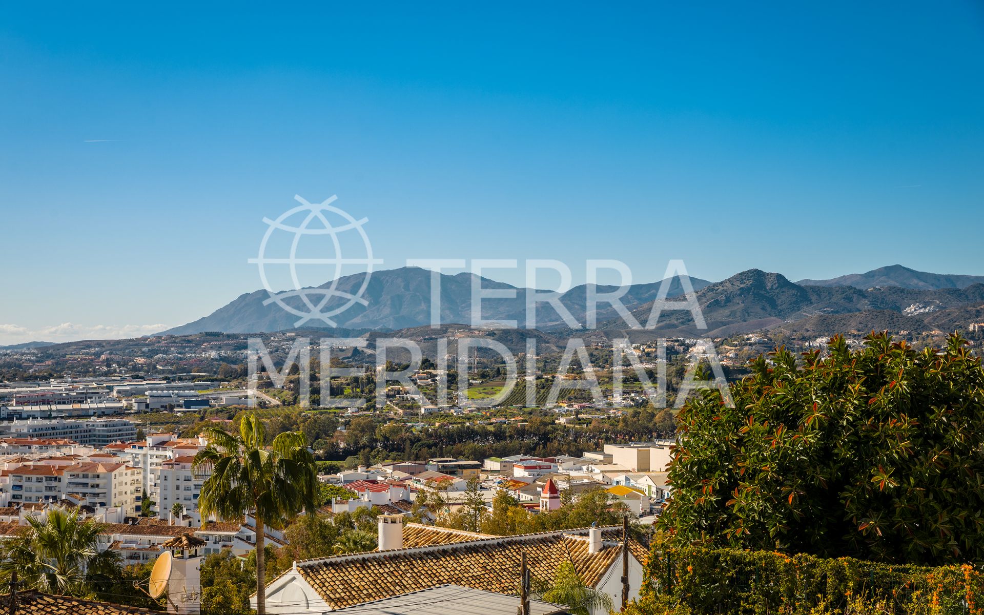 Fantastic villa with panoramic sea views walking distance to amenities in Nueva Andalucia. Built on three levels, property comprises, on entrance level: en-suite master bedroom; living/dining room with fireplace and access to the terraces enjoying the panoramic sea views; fully equipped kitchen with laundry room & dirty kitchen with separate entrance; guest toilet. Middle floor: double sitting room with fireplace and access to the heated swimming pool & bbq area; an office; 2 bedrooms sharing a bathroom; and a guest toilet. Basement: en-suite bedroom; garage with space for 4 cars; 2 large storages; a tool workshop; a wine cellar; the machinery room. Extra features include: alarm system; underfloor heating in the bathrooms; solar panels for the whole electric system. A property with lots of potential just a 5-minute drive (or 25-minute walk) to the beach and Puerto Banús.