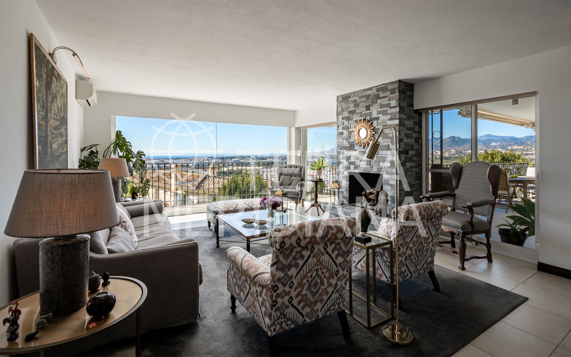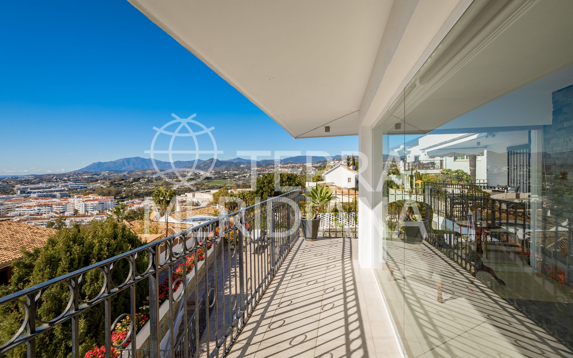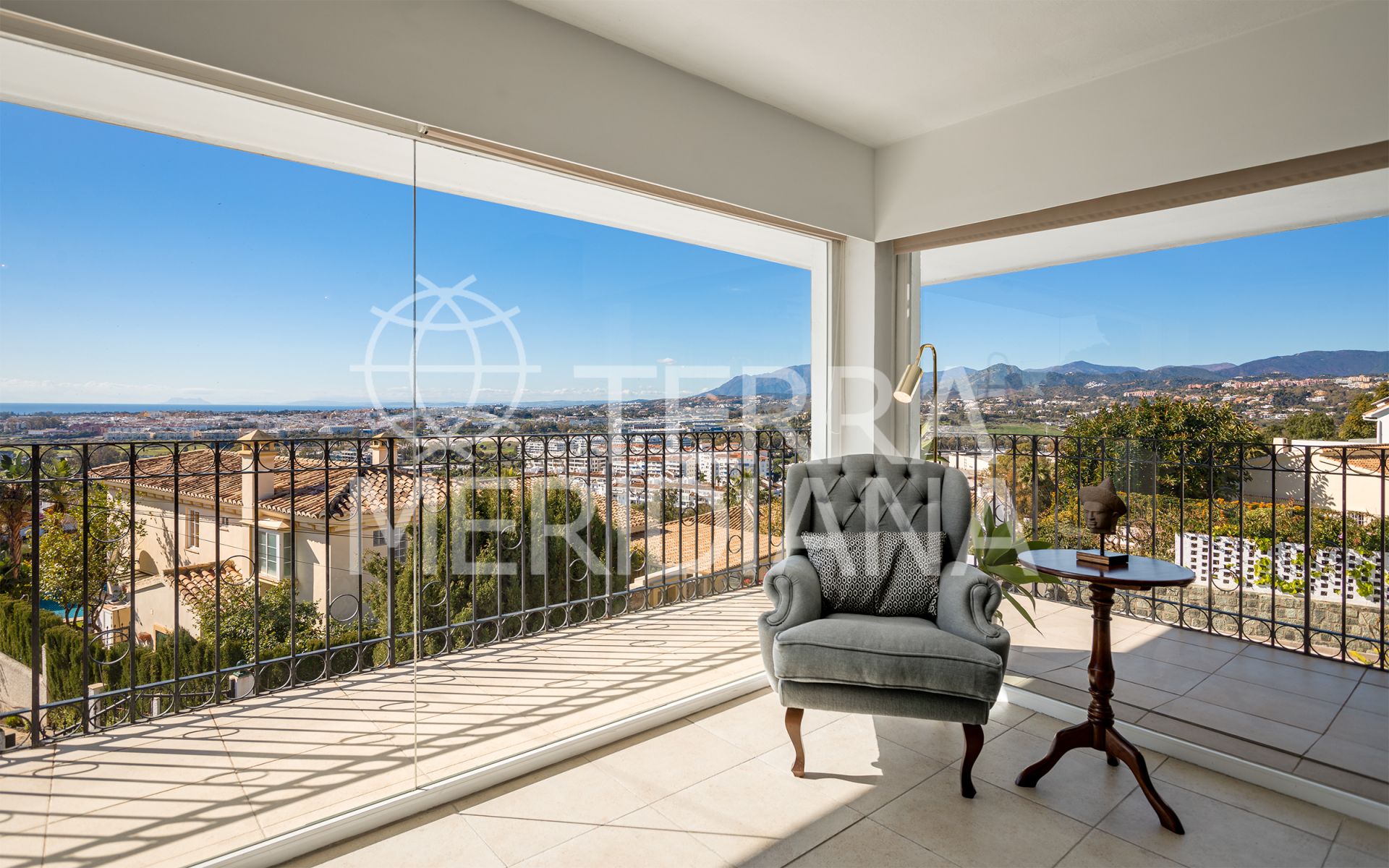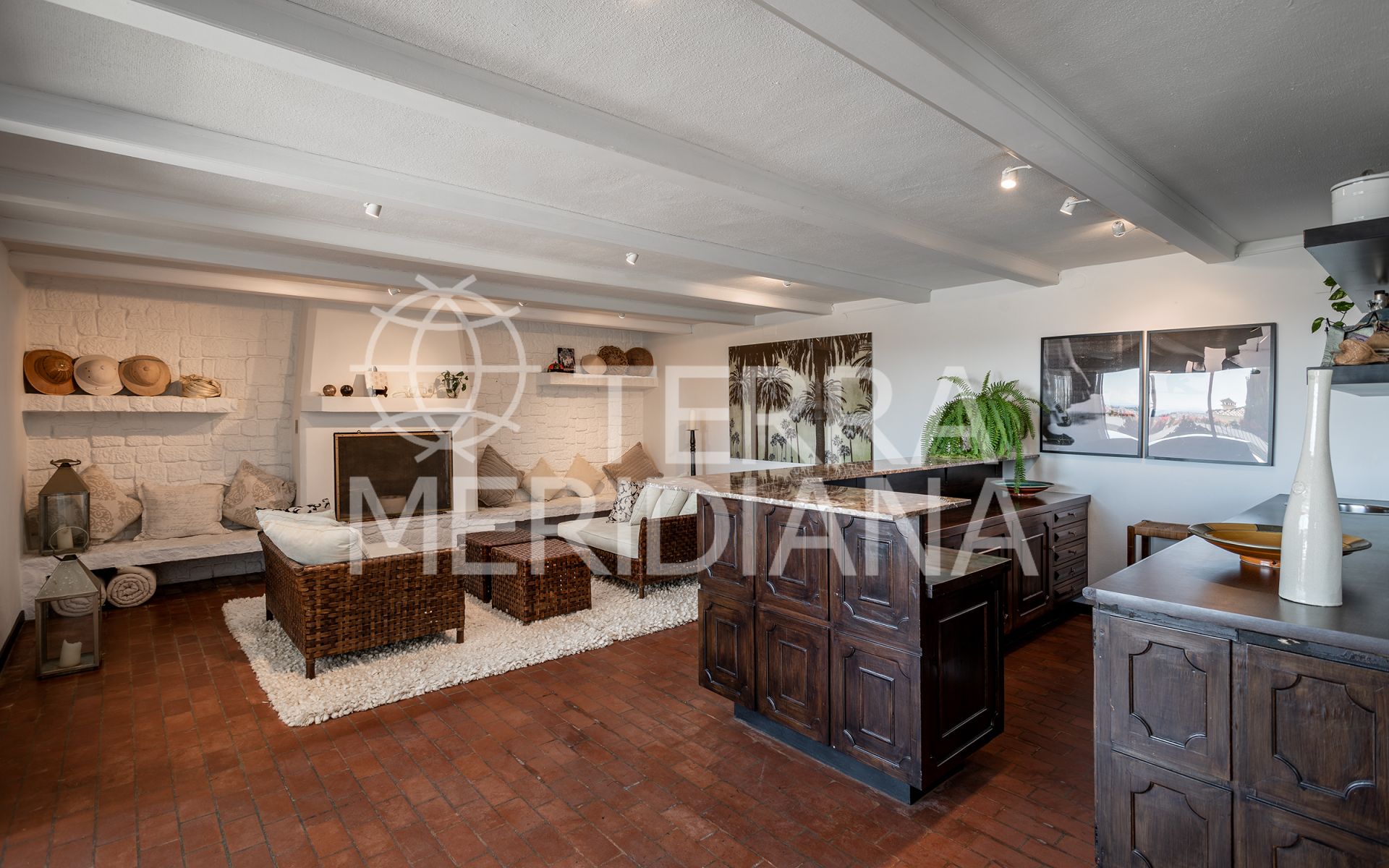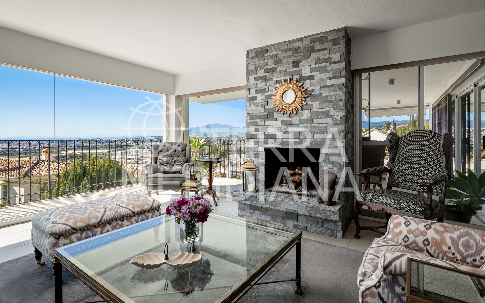 Fantastic villa with panoramic sea views walking distance to amenities in Nueva Andalucia. Built on three levels, property comprises, on entrance level: en-suite master bedroom; living/dining room with fireplace and access to the terraces enjoying the panoramic sea views; fully equipped kitchen with laundry room & dirty kitchen with separate entrance; guest toilet. Middle floor: double sitting room with fireplace and access to the heated swimming pool & bbq area; an office; 2 bedrooms sharing a bathroom; and a guest toilet. Basement: en-suite bedroom; garage with space for 4 cars; 2 large storages; a tool workshop; a wine cellar; the machinery room. Extra features include: alarm system; underfloor heating in the bathrooms; solar panels for the whole electric system. A property with lots of potential just a 5-minute drive (or 25-minute walk) to the beach and Puerto Banús.