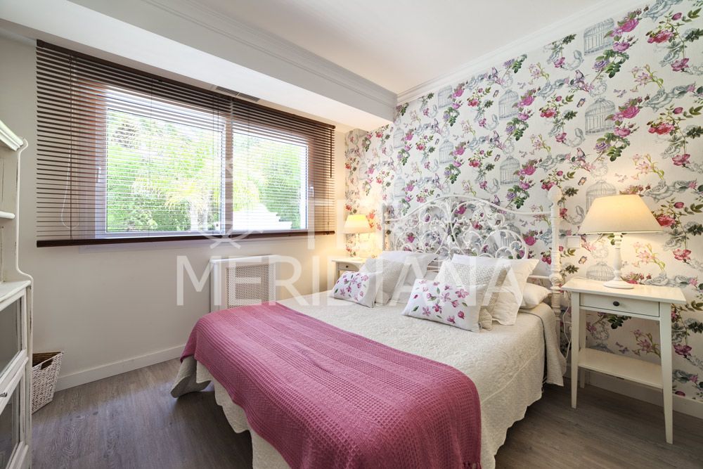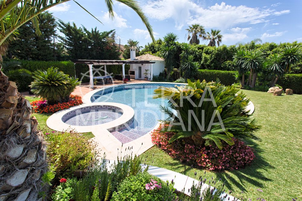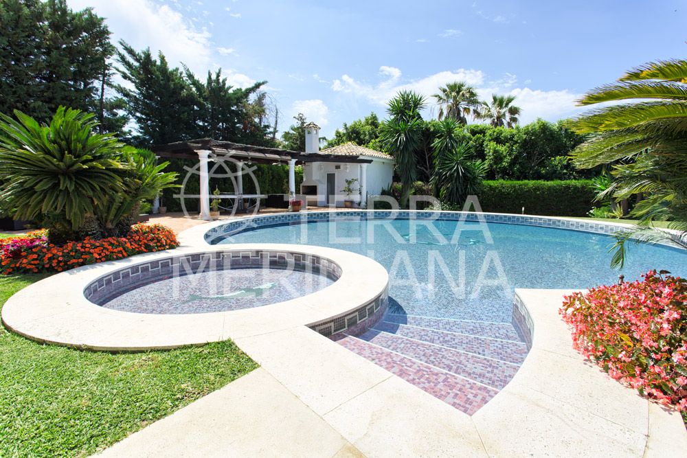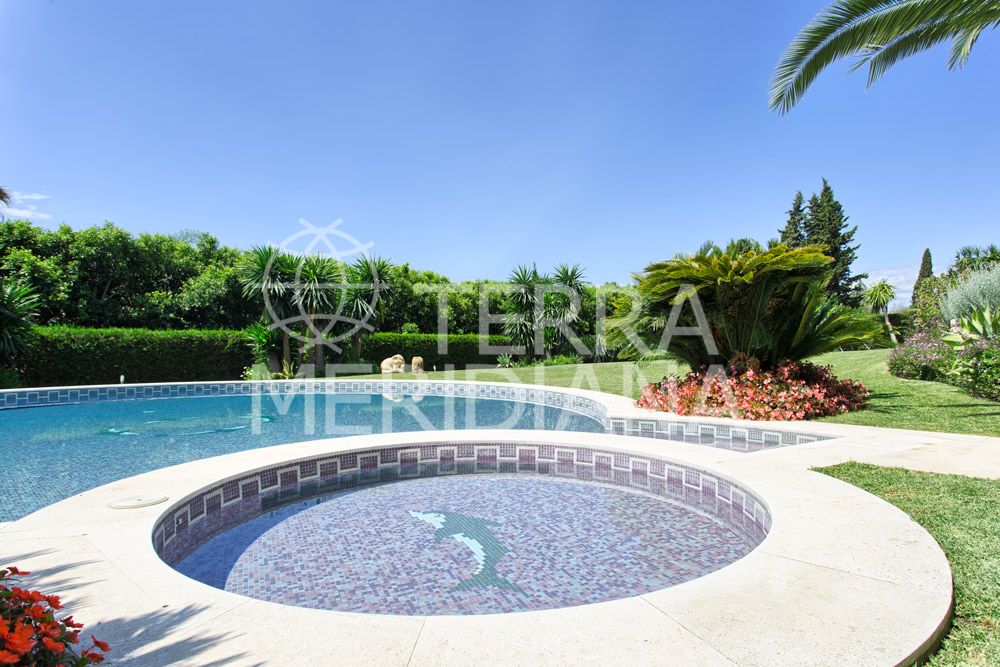 Heated pool of 120 m2, free of chlorine and with salt water treatment, surrounded by tropical gardens with palm trees, flowers, jasmine, roses and bougainvilleas.