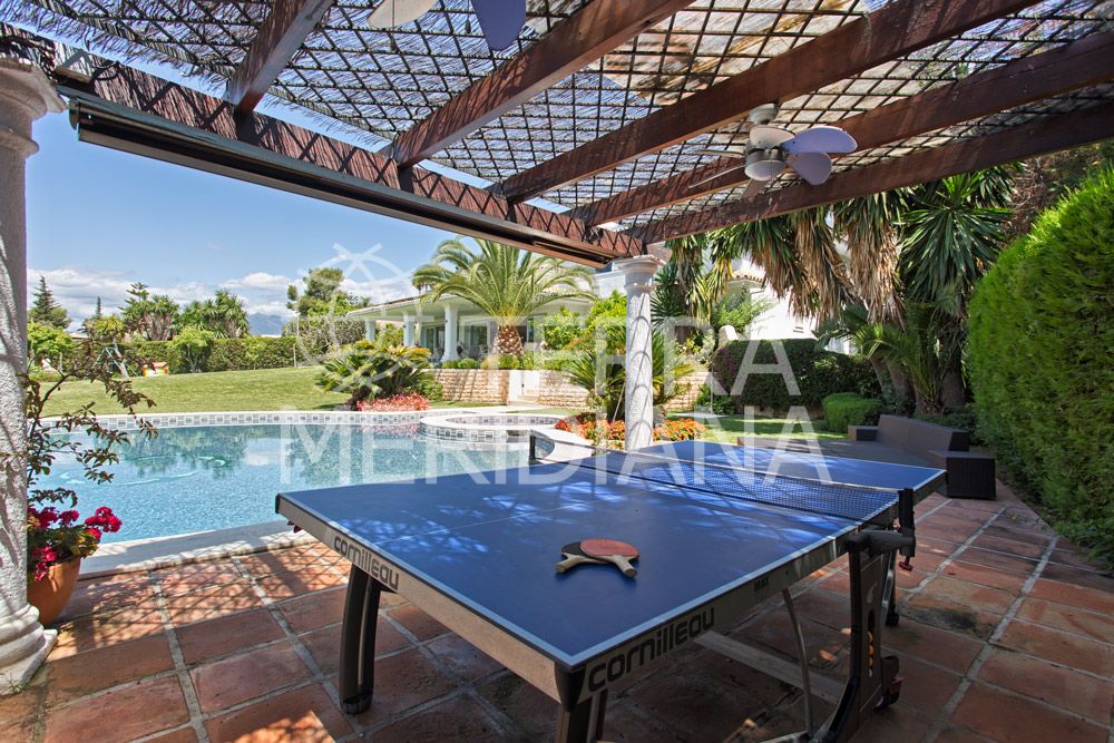 Entertainment and leisure: ping-pong tables, TV room with direct access to the garden and pool, three dining areas and a large gazebo by the pool.