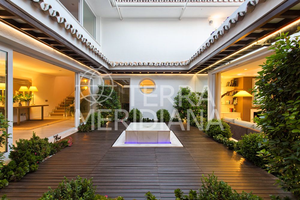 85 m2 lounge with fireplace, open to dining room and modern central patio with fountain and wooden floor.