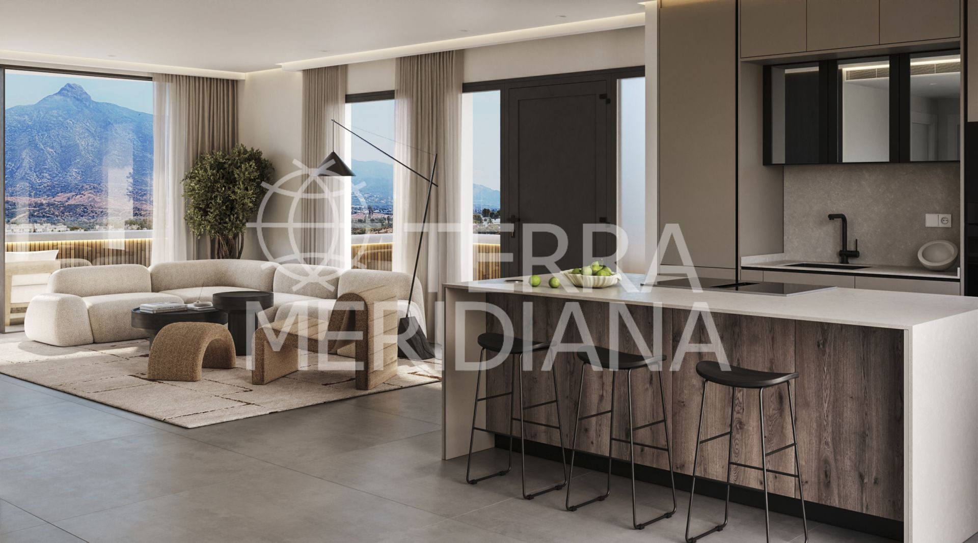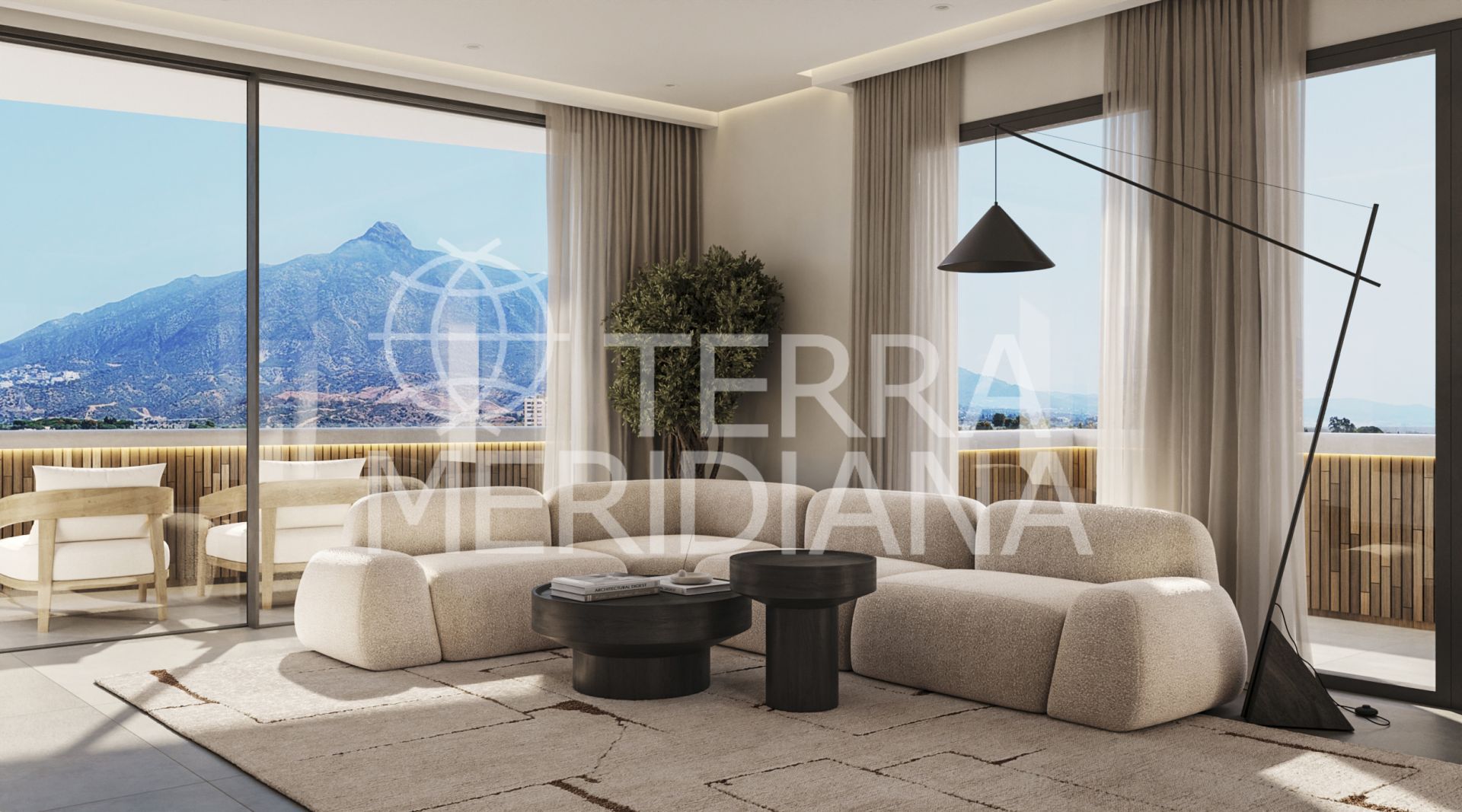 Incredible opportunity to purchase a two bedroom penthouse in the gated community of Jardines de Andalucía, Nueva Andalucia. This property has been renovated to the highest standard, with a spacious and bright open plan kitchen and living/dining area. There is one guest bedroom and bathroom, plus a large master en-suite. All the rooms have direct access to a private terrace with incredible views of La Concha Mountain and sea views. Other features include; fully fitted wardrobes, air-conditioning, electric blinds, one private parking space and storeroom. The complex itself is close to all leisure amenities, golf courses and beaches, making it a great holiday rental or year round home. There are several units for sale with options for reform or key ready apartment.