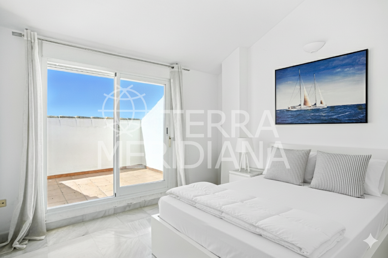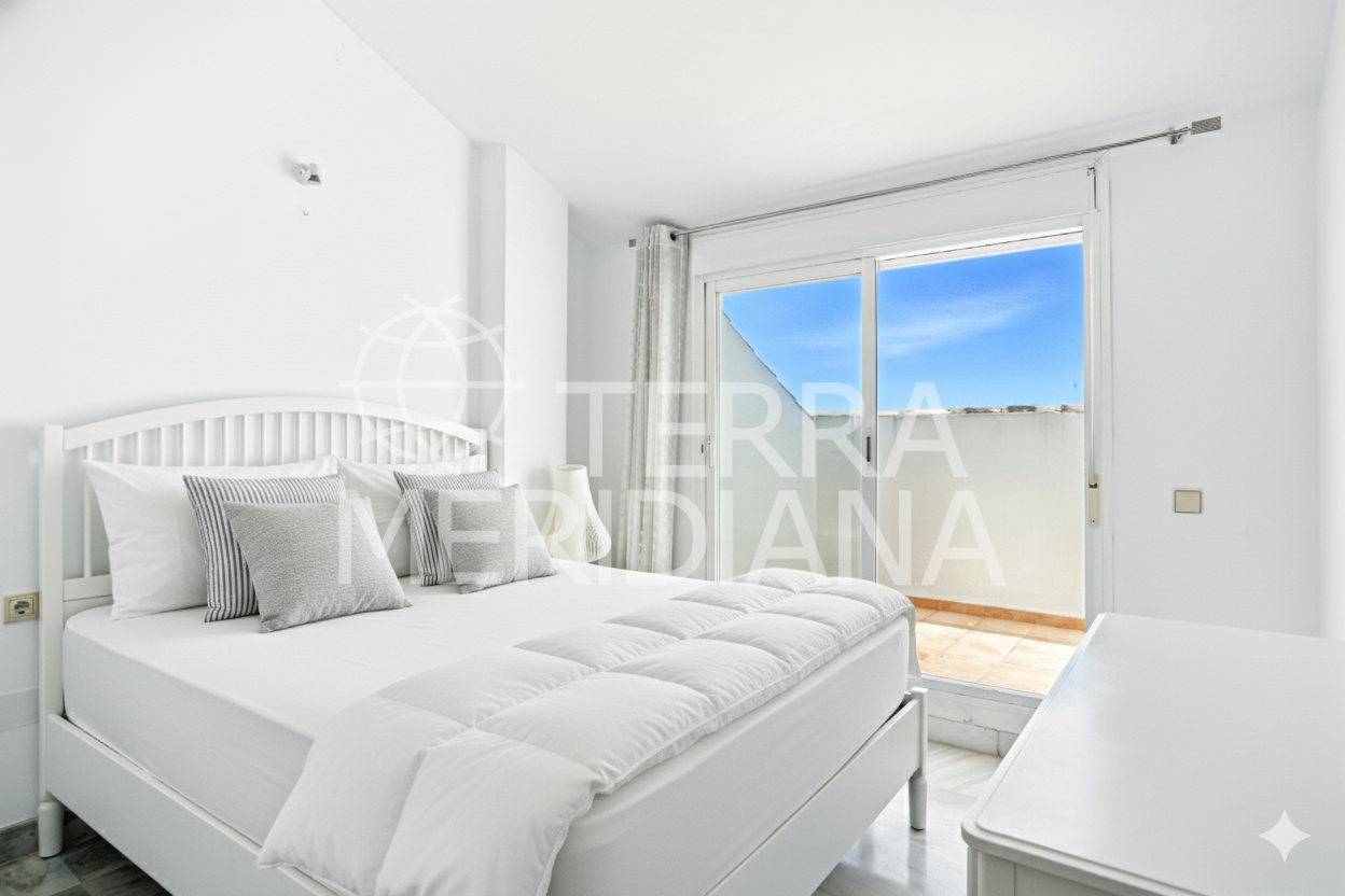Beautiful south-facing apartment with magnificent sea views, located in the sought-after community of Pinos de Nagüeles, in Marbella’s prestigious Golden Mile. Within walking distance to the beach, shops, restaurants, cafés, and the promenade, and just a short drive to golf courses and international schools. This charming corner property enjoys a prime position and consists of three bedrooms and three bathrooms, with the master bedroom en suite. The two upstairs bedrooms each have their own private terrace. There is also a bright and spacious living-dining area and a main private terrace, perfect for relaxing or dining outdoors. The kitchen is fully equipped and designed for functionality, complete with a separate laundry room. The property offers the perfect combination of comfort and location, set within a gated development featuring 24-hour security, beautifully maintained gardens, a paddle/tennis court, clubhouse, and a large communal swimming pool. Additional features include marble flooring, air conditioning, an elevator, an underground parking space conveniently close to the lift, and a bus stop just a few hundred metres from the apartment. The community offers a peaceful yet well-connected environment.