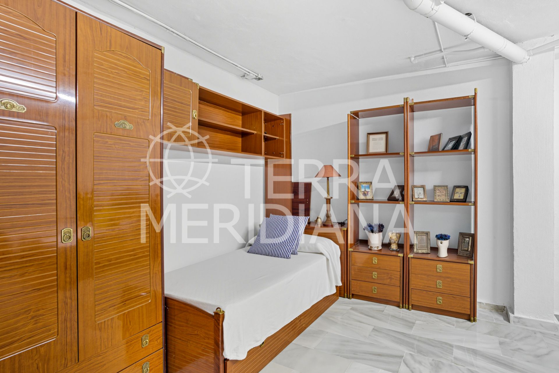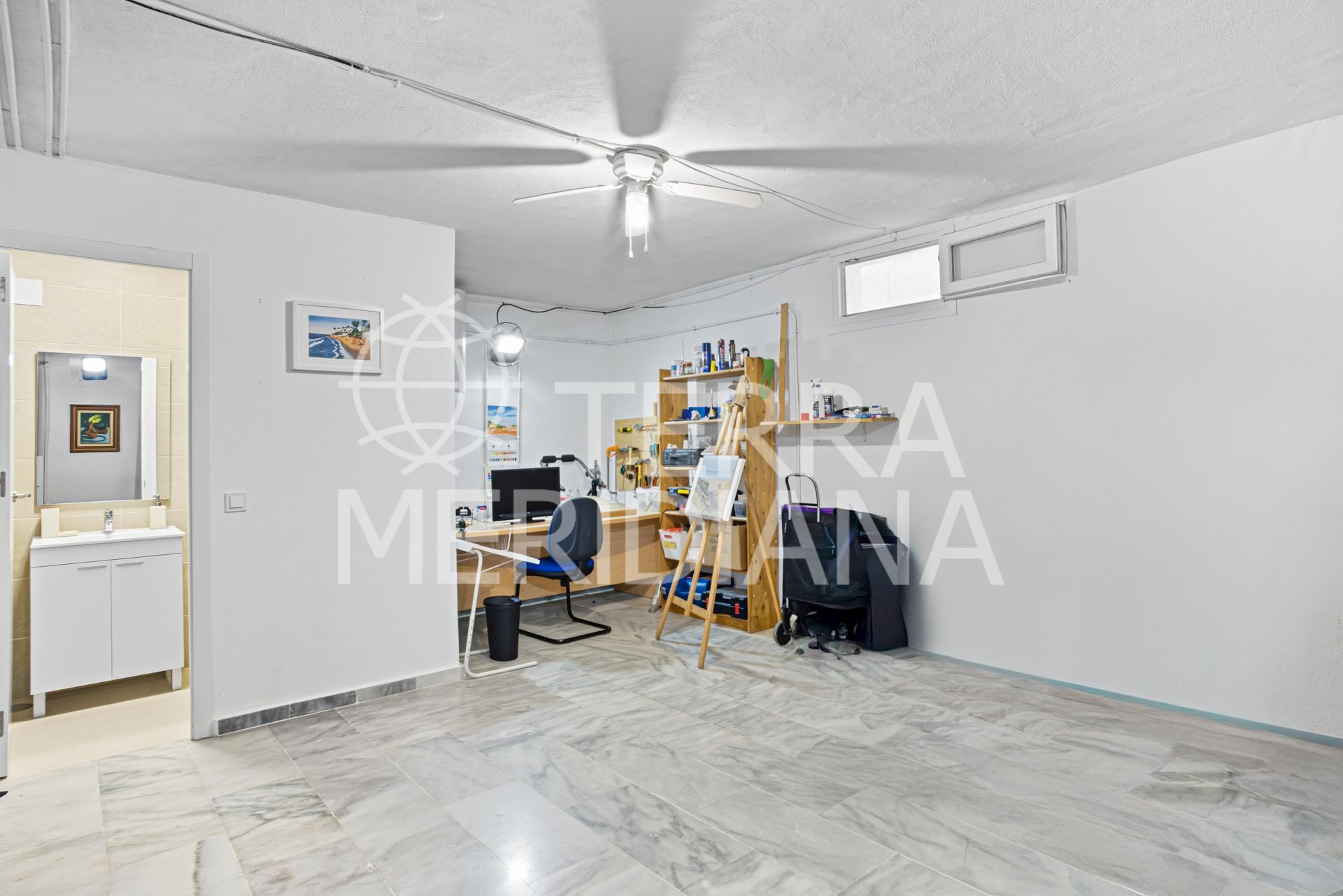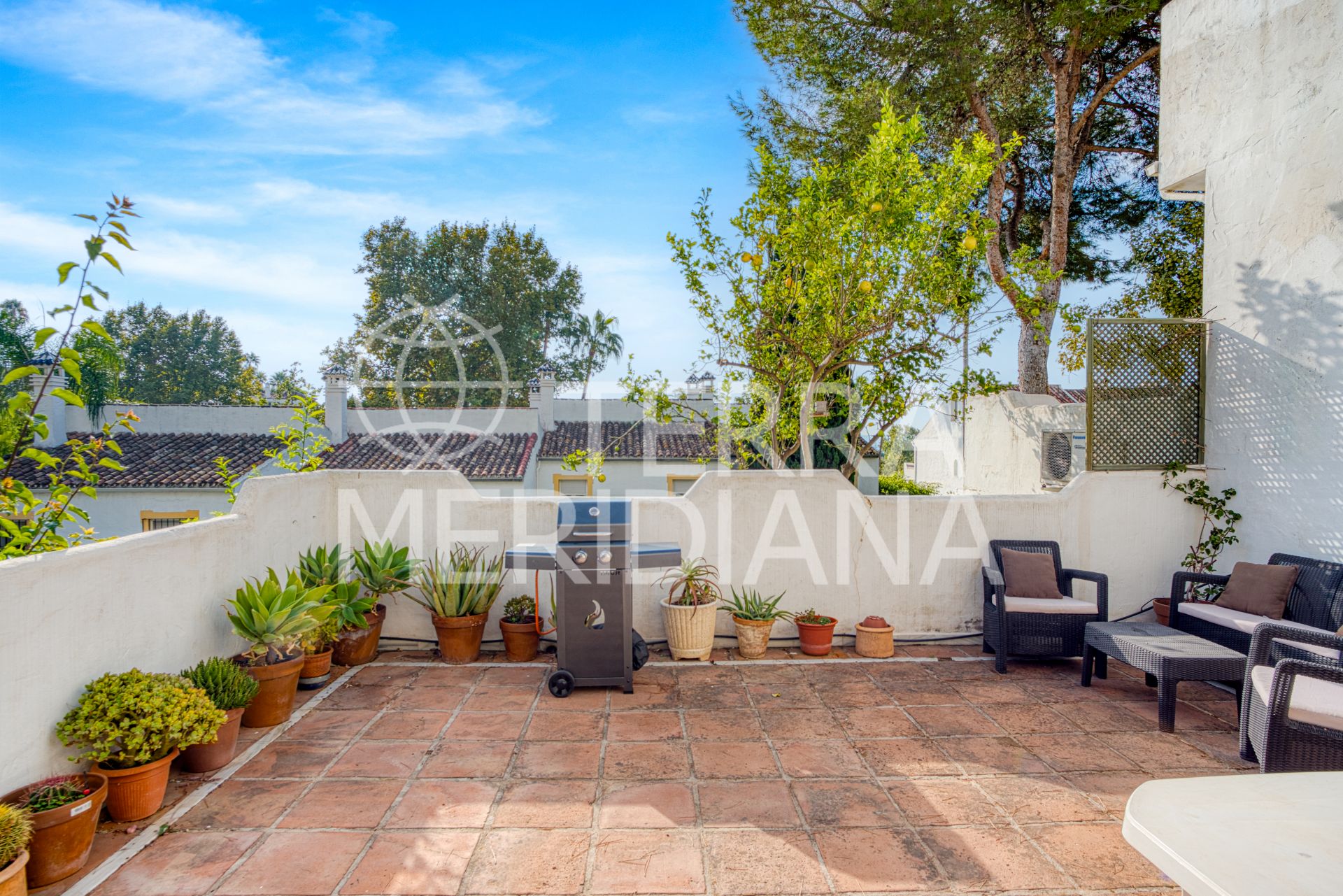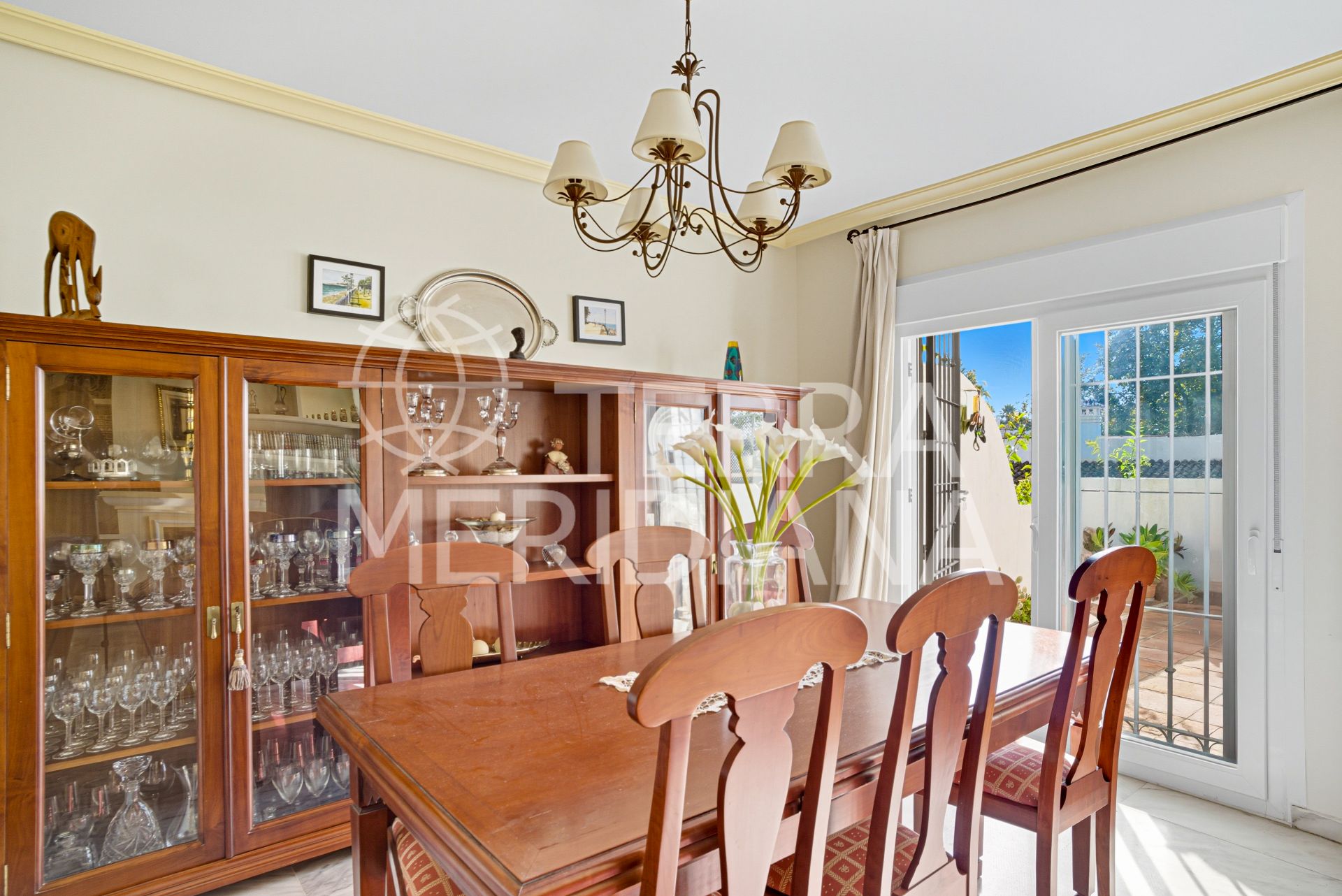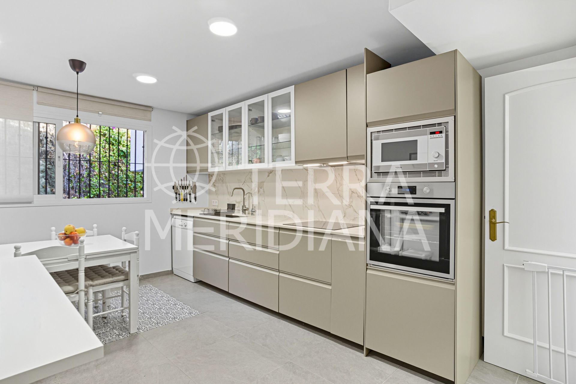 This lovely three-bedroom, south-facing townhouse is set in the sought-after gated community of El Capricho on Marbella’s Golden Mile, offering spacious tropical gardens and two communal swimming pools. Ideally located within walking distance to the beach, bars, and restaurants, and just a short drive from Marbella Center and Puerto Banús, the property combines convenience with charm. The ground floor features a bright living and dining area with a fireplace and access to a generous terrace perfect for outdoor dining, a newly renovated separate kitchen, and a guest toilet. Stairs lead down to a large basement currently used as a bedroom and art studio with its own bathroom. Upstairs, the master suite is accompanied by two guest bedrooms and a family bathroom. Additional highlights include fitted wardrobes, marble floors, and private parking for one car.