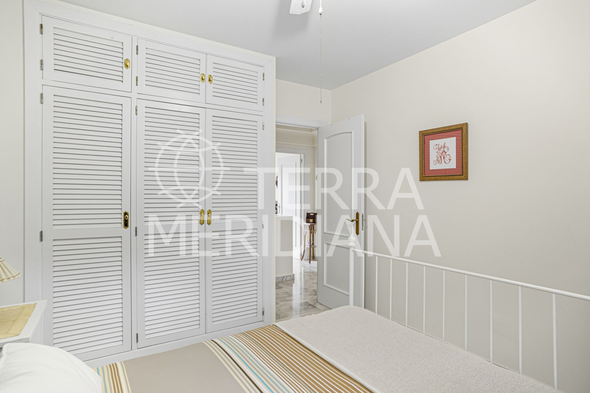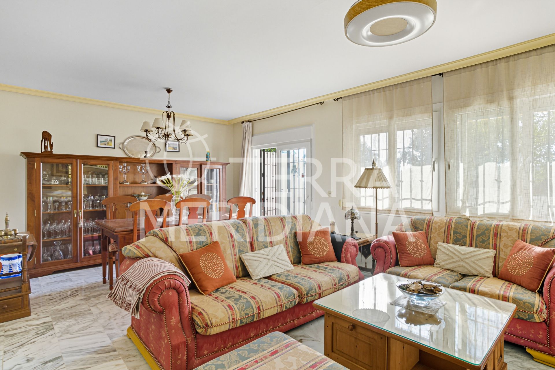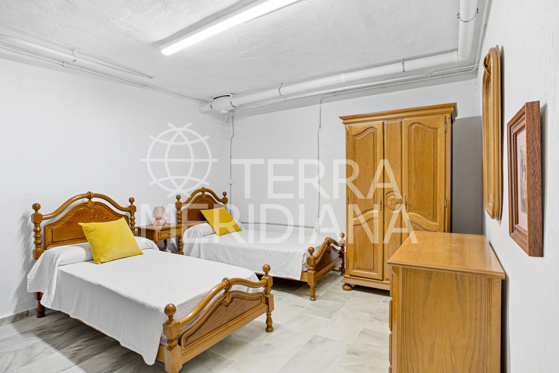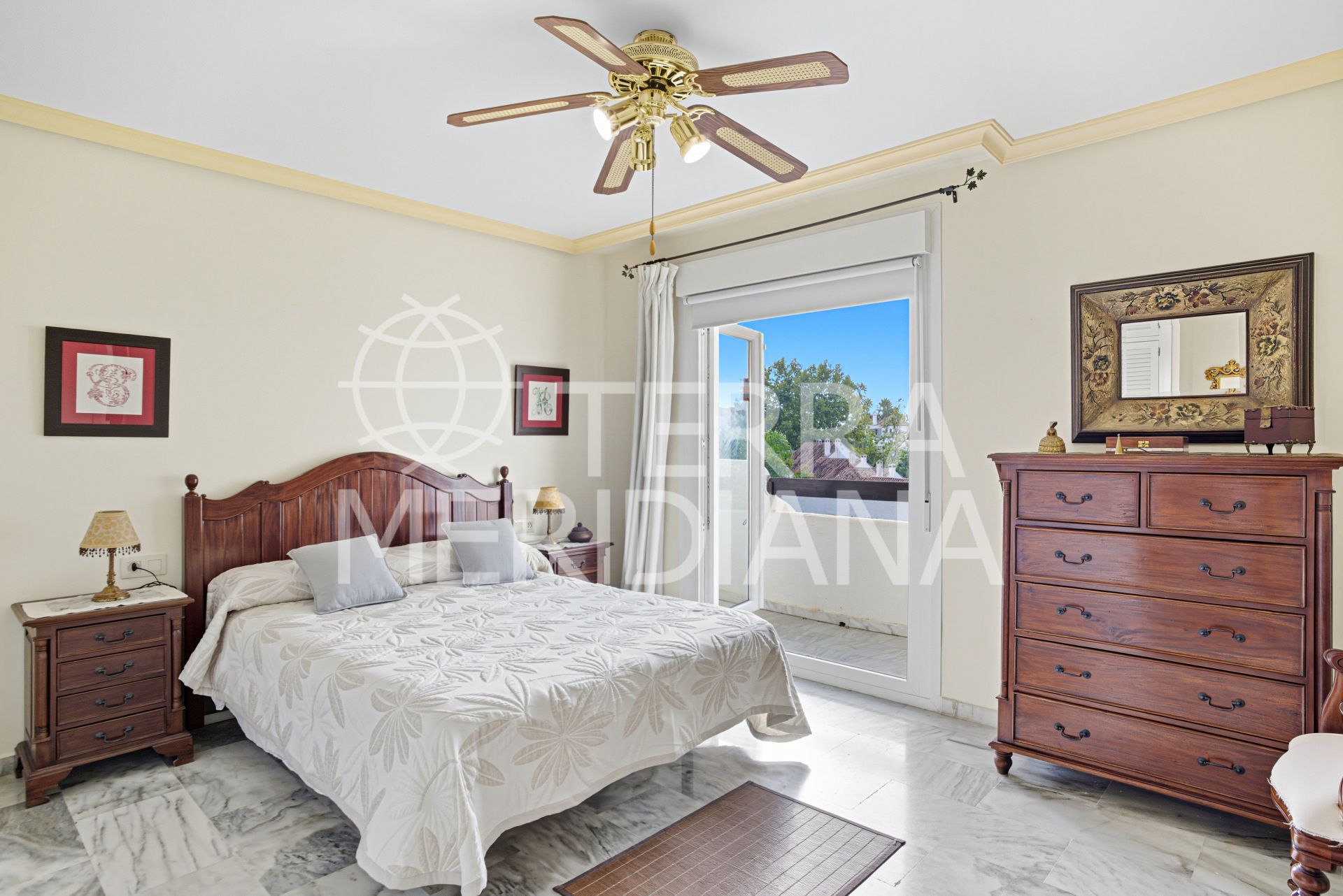 This lovely three-bedroom, south-facing townhouse is set in the sought-after gated community of El Capricho on Marbella’s Golden Mile, offering spacious tropical gardens and two communal swimming pools. Ideally located within walking distance to the beach, bars, and restaurants, and just a short drive from Marbella Center and Puerto Banús, the property combines convenience with charm. The ground floor features a bright living and dining area with a fireplace and access to a generous terrace perfect for outdoor dining, a newly renovated separate kitchen, and a guest toilet. Stairs lead down to a large basement currently used as a bedroom and art studio with its own bathroom. Upstairs, the master suite is accompanied by two guest bedrooms and a family bathroom. Additional highlights include fitted wardrobes, marble floors, and private parking for one car.