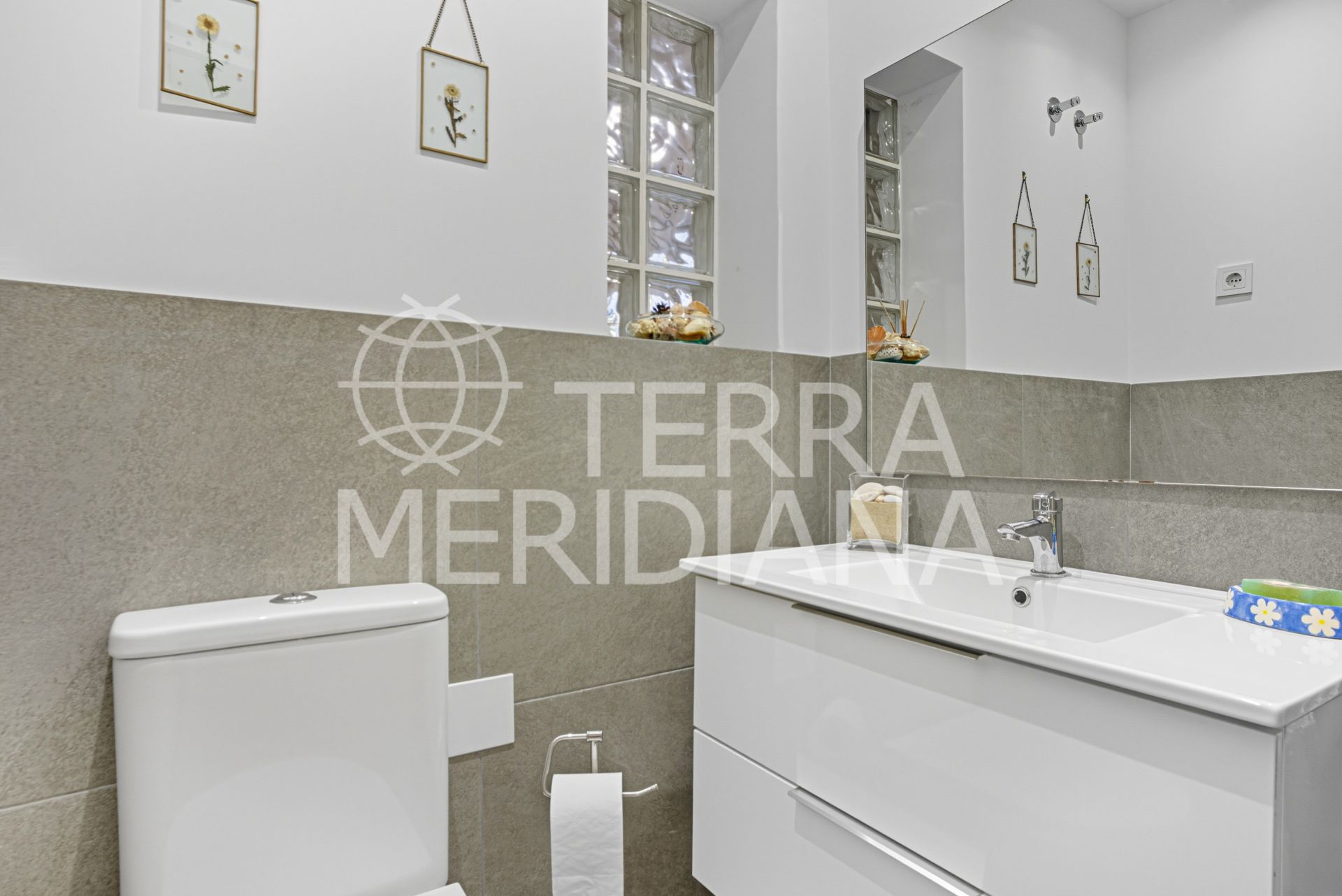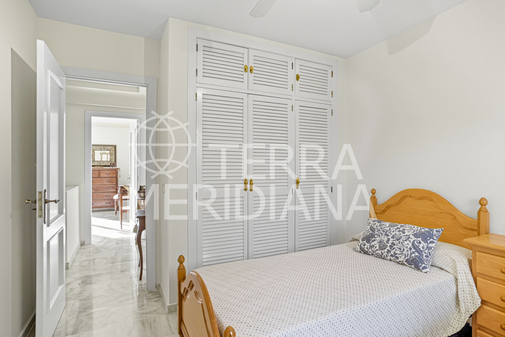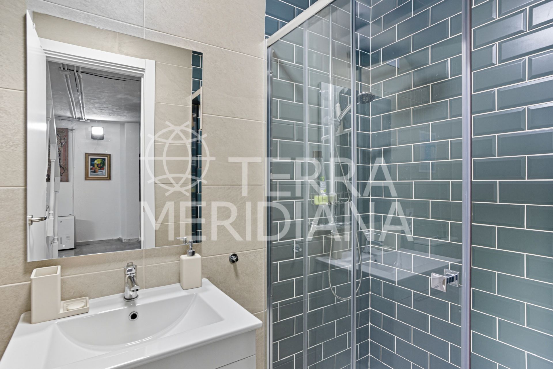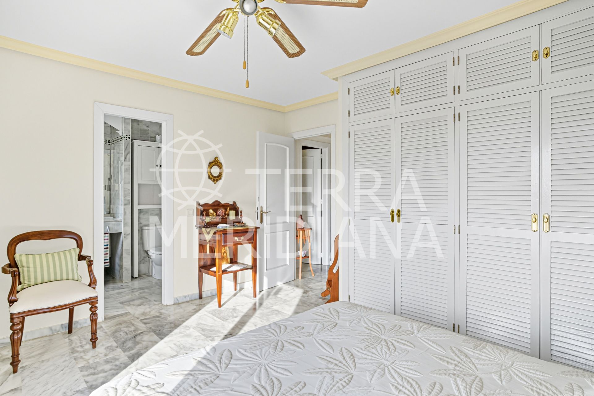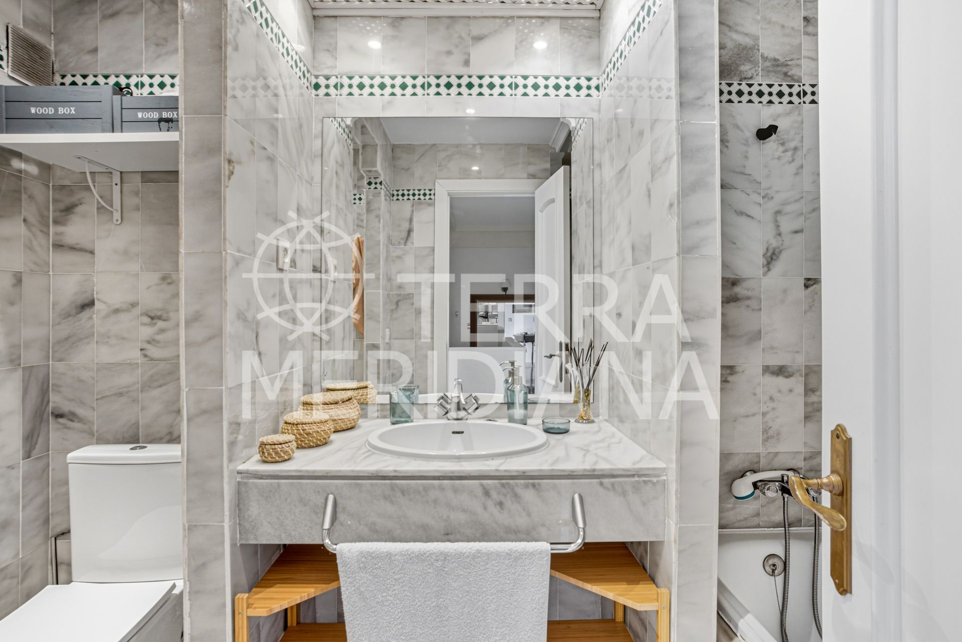 This lovely three-bedroom, south-facing townhouse is set in the sought-after gated community of El Capricho on Marbella’s Golden Mile, offering spacious tropical gardens and two communal swimming pools. Ideally located within walking distance to the beach, bars, and restaurants, and just a short drive from Marbella Center and Puerto Banús, the property combines convenience with charm. The ground floor features a bright living and dining area with a fireplace and access to a generous terrace perfect for outdoor dining, a newly renovated separate kitchen, and a guest toilet. Stairs lead down to a large basement currently used as a bedroom and art studio with its own bathroom. Upstairs, the master suite is accompanied by two guest bedrooms and a family bathroom. Additional highlights include fitted wardrobes, marble floors, and private parking for one car.