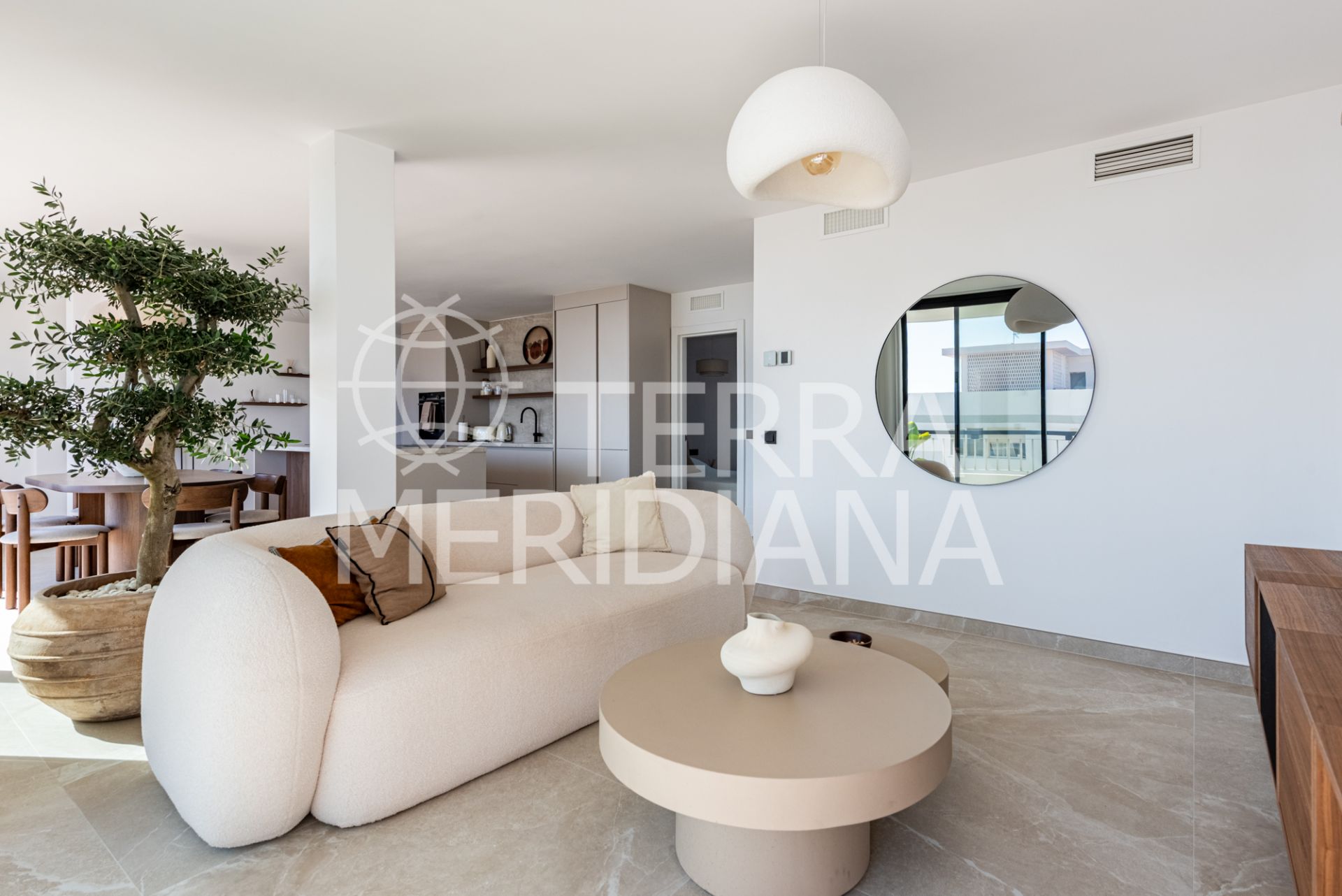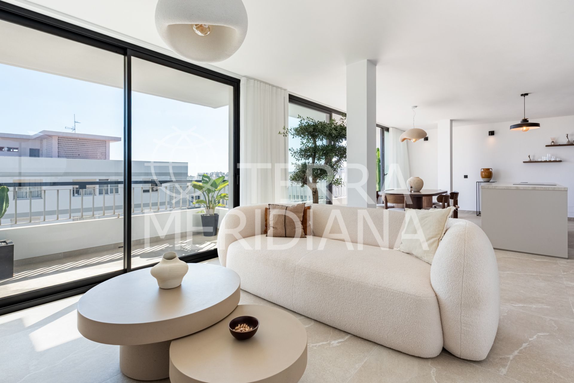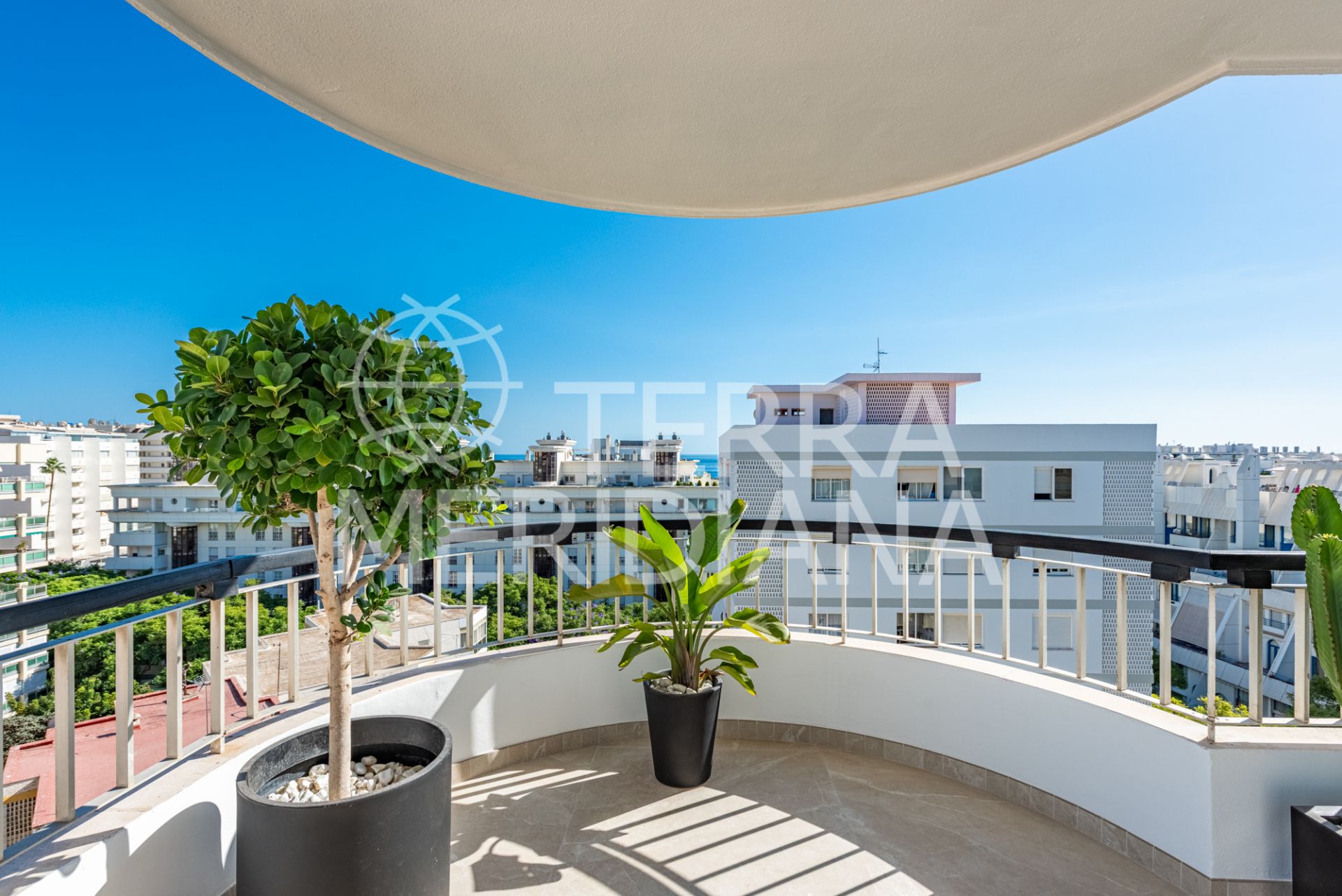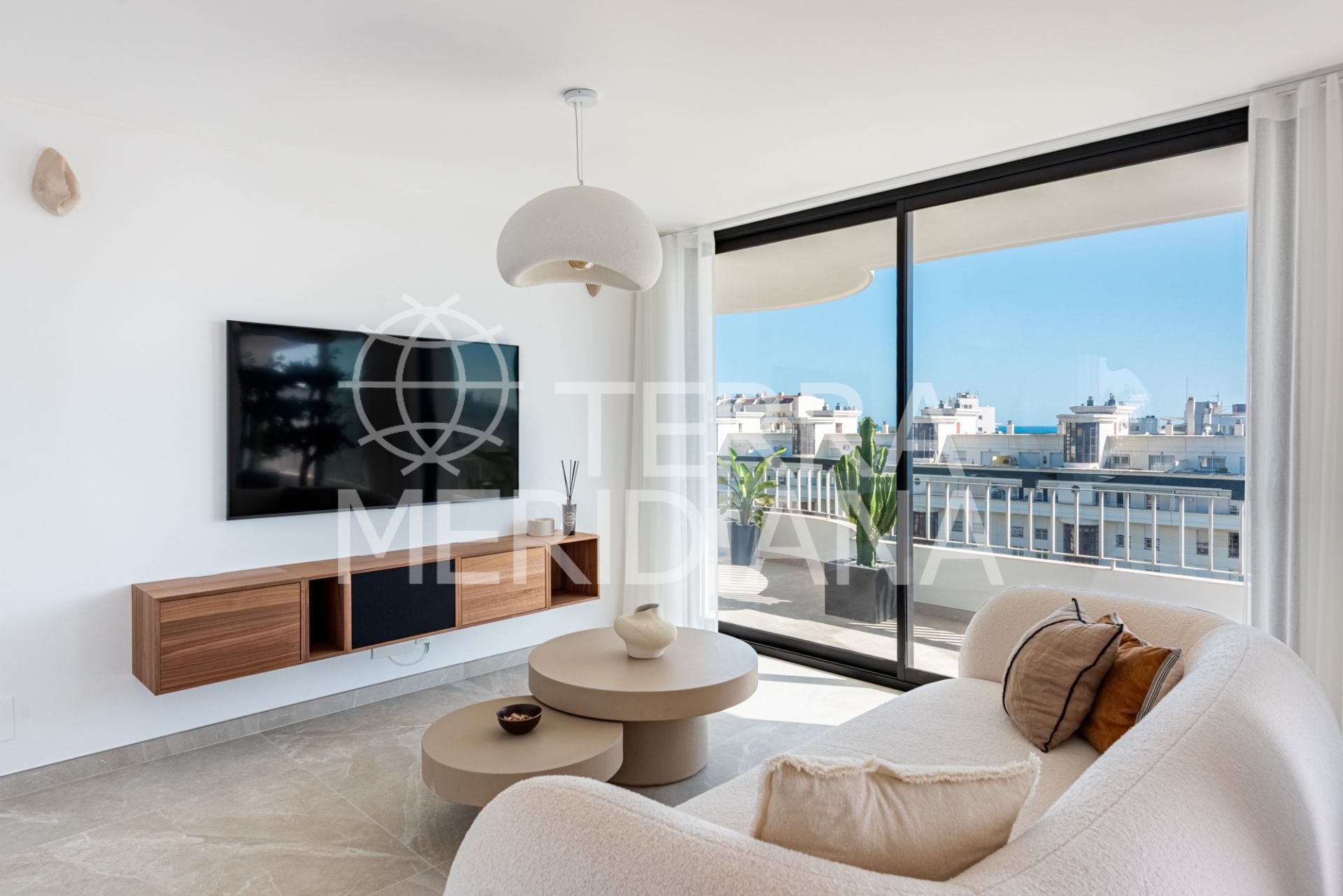 Elegant and beautifully reformed, this three-bedroom, south-facing penthouse is located in the sought-after Playa de la Fontanilla area of Marbella, just a short walk from the beach, shops, bars, restaurants, and Marbella’s charming Old Town. Recently renovated to a high standard, the property features an open-plan kitchen, living and dining room; three bedrooms; two bathrooms; fitted wardrobes; air conditioning; and luxurious underfloor heating in both bathrooms, which also boast self-cleaning toilets. The master bedroom includes an ensuite bathroom, while the remaining two bedrooms share a stylish family bathroom. Situated on the 7th floor with lift access, it offers a generous private terrace with stunning sea views and includes a private indoor parking space—an ideal blend of comfort, convenience, and modern living.