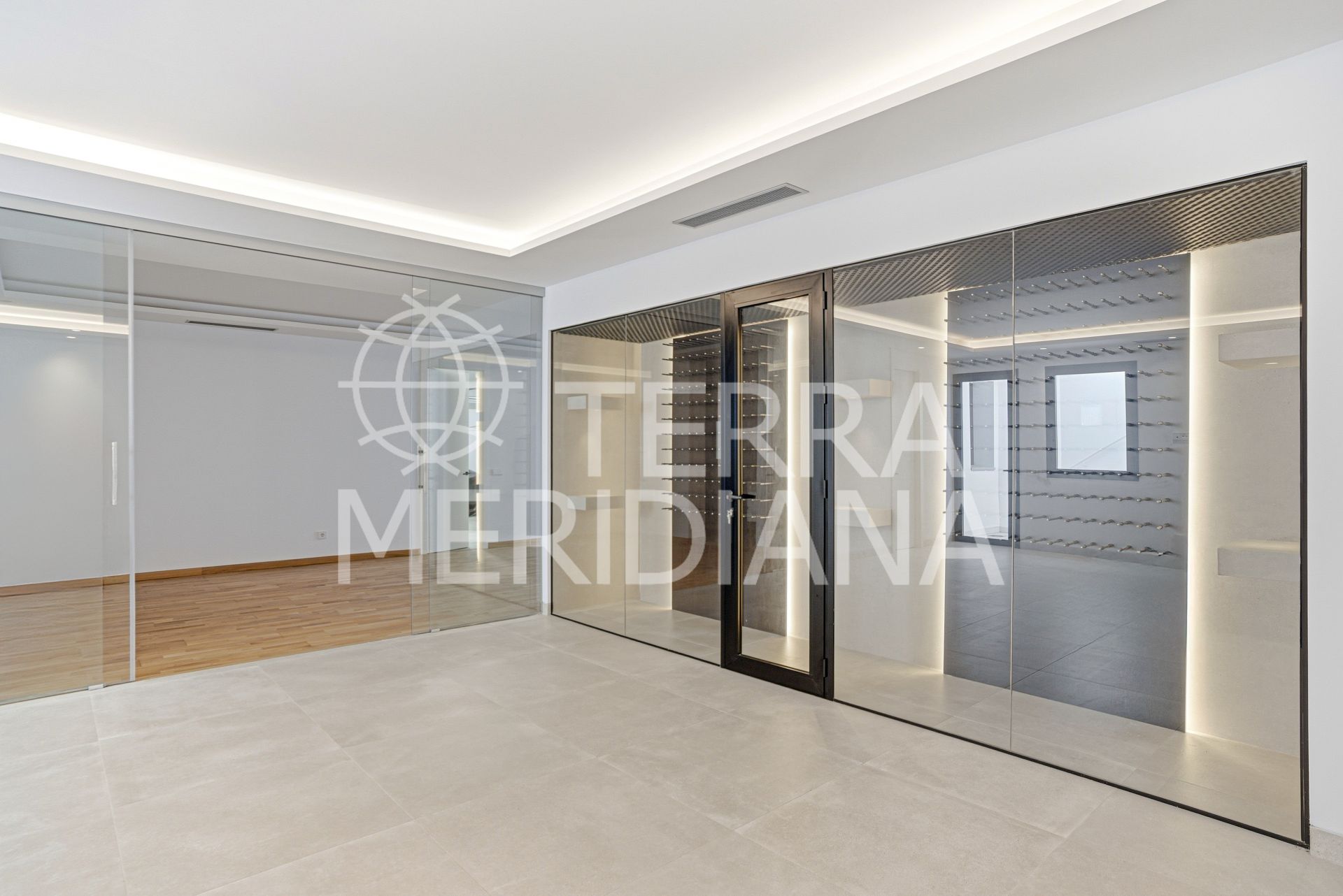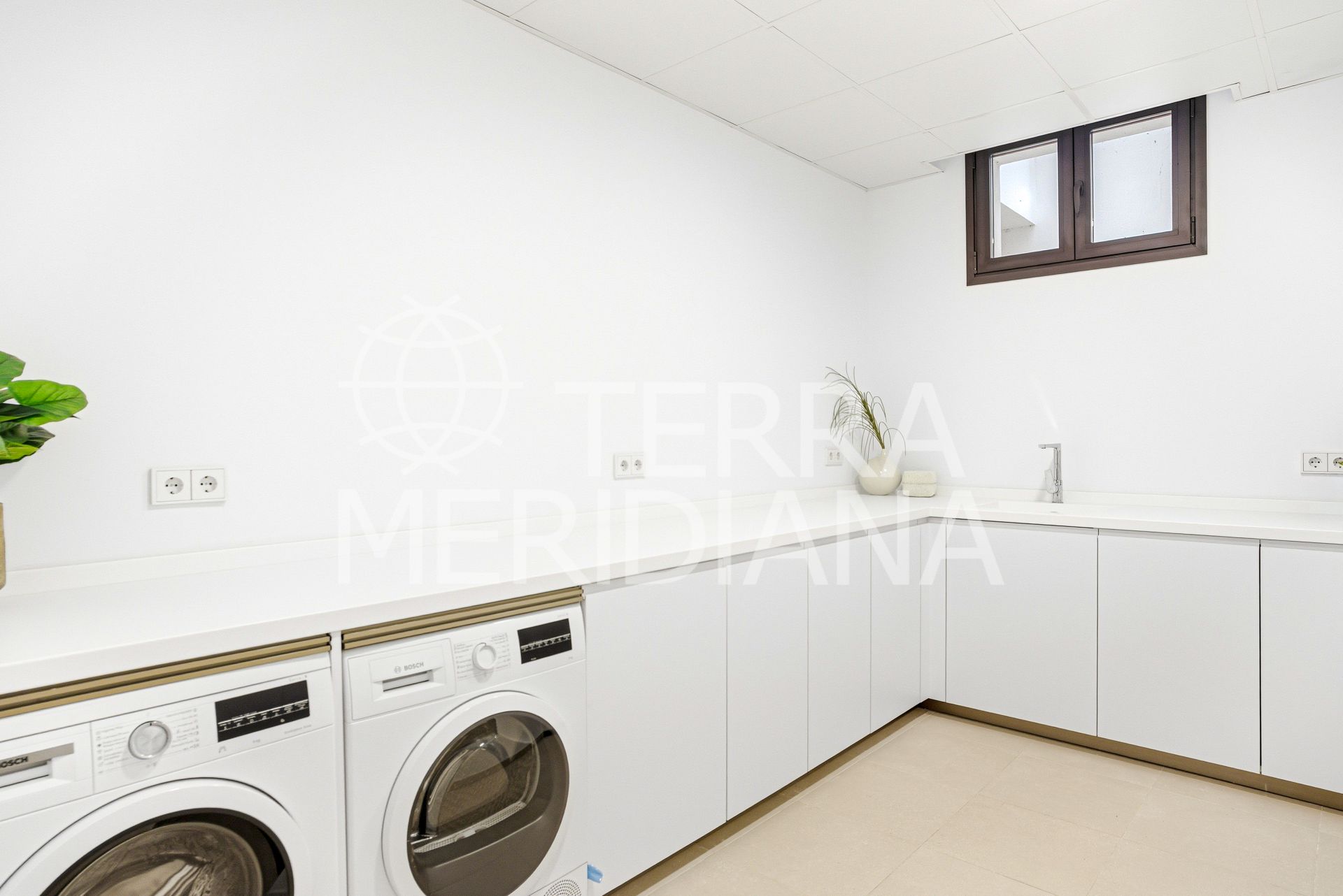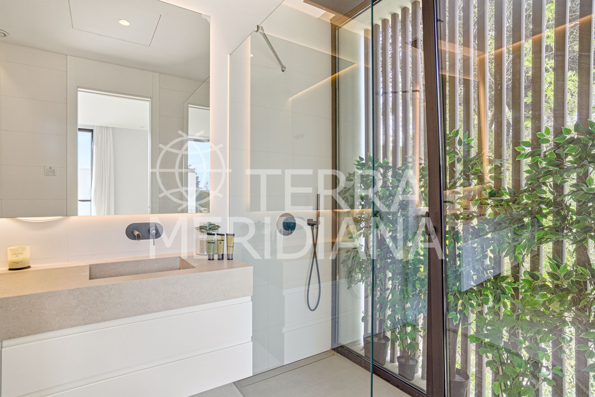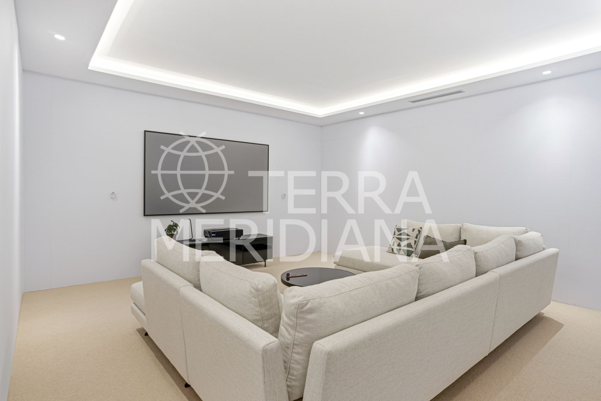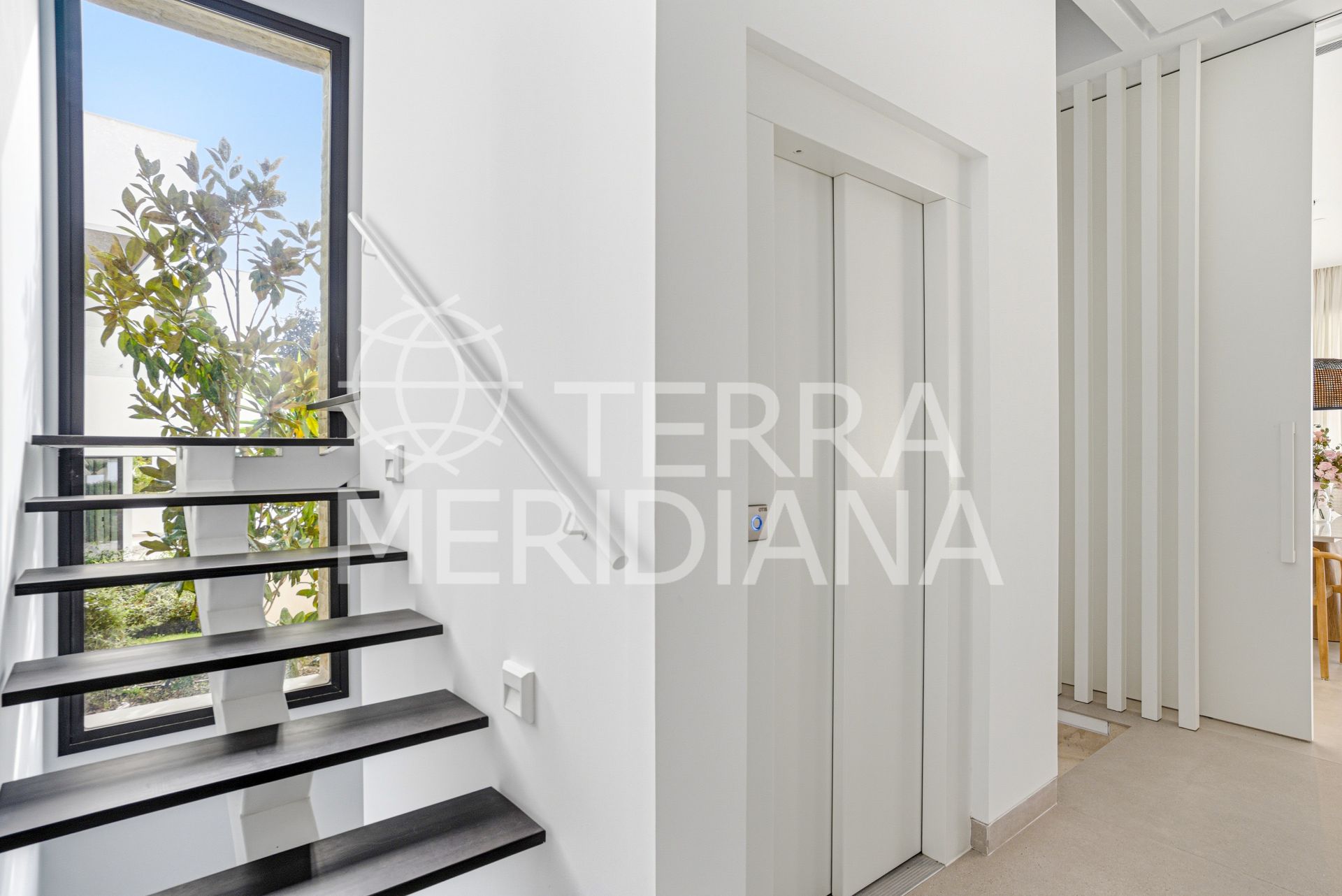 Newly built luxury, southwest-facing villa of exceptional quality, located in an exclusive gated community of just 15 villas with 24-hour security and concierge services. Set within a lush green oasis on the edge of Marbella’s iconic Golden Mile, the property is only metres from the beach and a short walk to Marbella Old Town, bars and restaurants. Built over three levels plus a rooftop solarium, this newly completed villa offers four bedrooms, four bathrooms and two additional WCs. The main living area features an elegant open-plan layout with a designer kitchen equipped with Gaggenau appliances and premium finishes. A private lift connects every floor for maximum comfort and convenience. The villa includes a range of luxury amenities, such as underfloor heating throughout, a domotic smart-home system, solar panels, and a double garage with an electric car charger. The lower level is dedicated to wellness and entertainment, featuring a private hammam and sauna, a temperature-controlled wine cellar, a cinema room, and a multi-functional space ideal for a games room, gym, studio, or additional entertainment area. Outdoor living is exceptional: enjoy a private heated saltwater pool in the garden, and a plunge pool on the rooftop solarium, where beautiful sea views create the perfect backdrop. Both the garden and pool are centrally maintained by the community for effortless, lock-and-go living. A rare opportunity to acquire a turnkey, high-spec villa in one of Marbella’s most prestigious and sought-after beachside locations.
