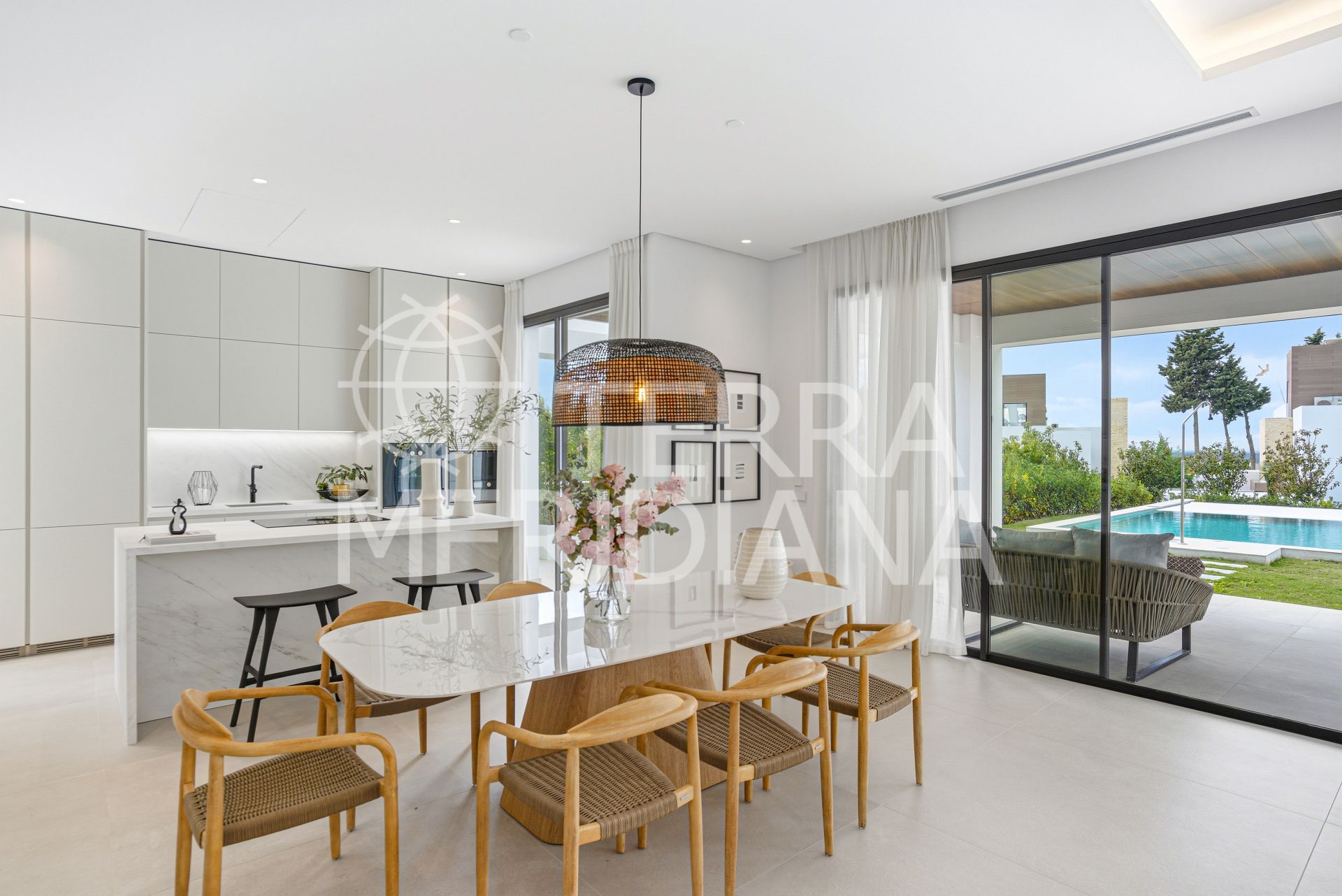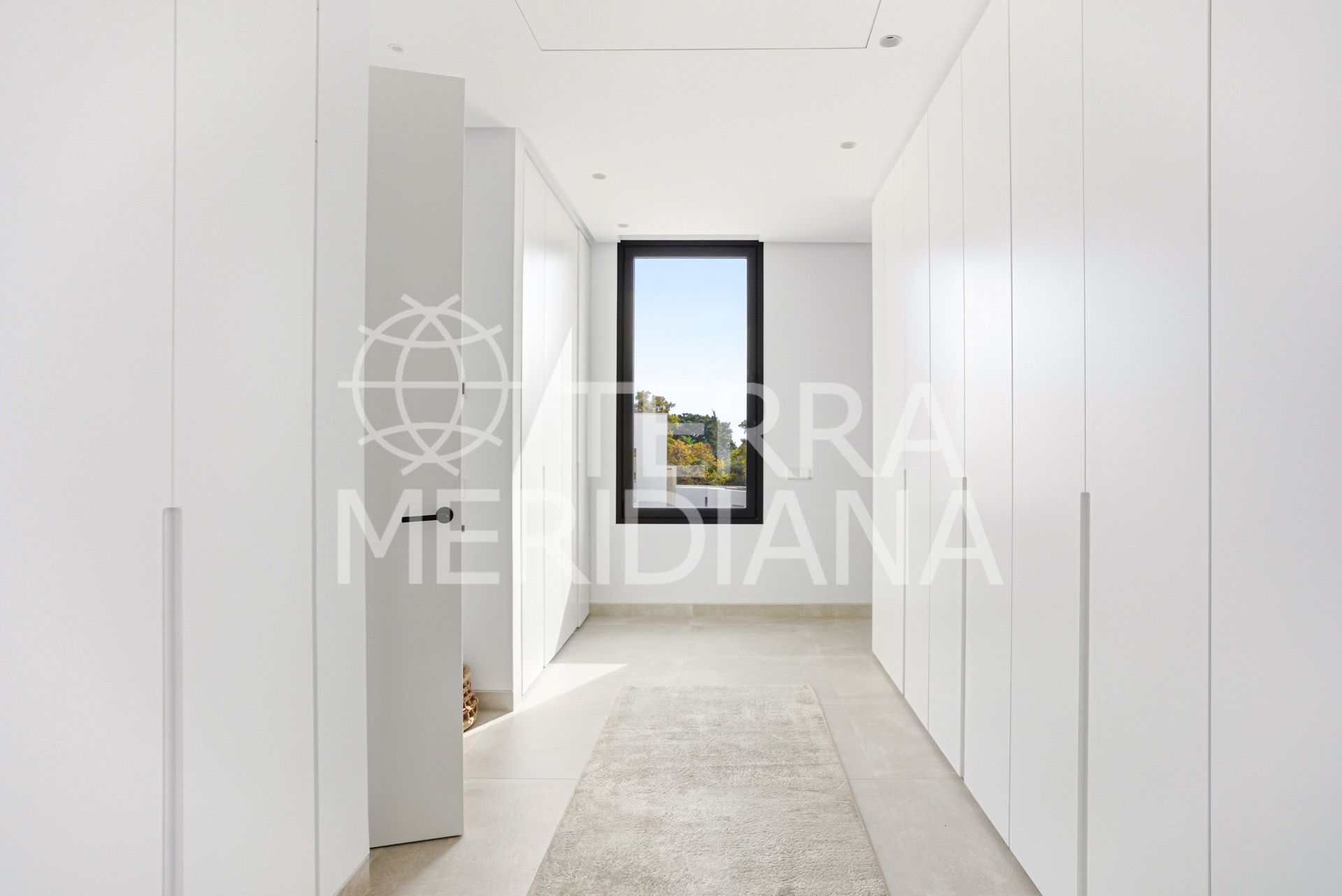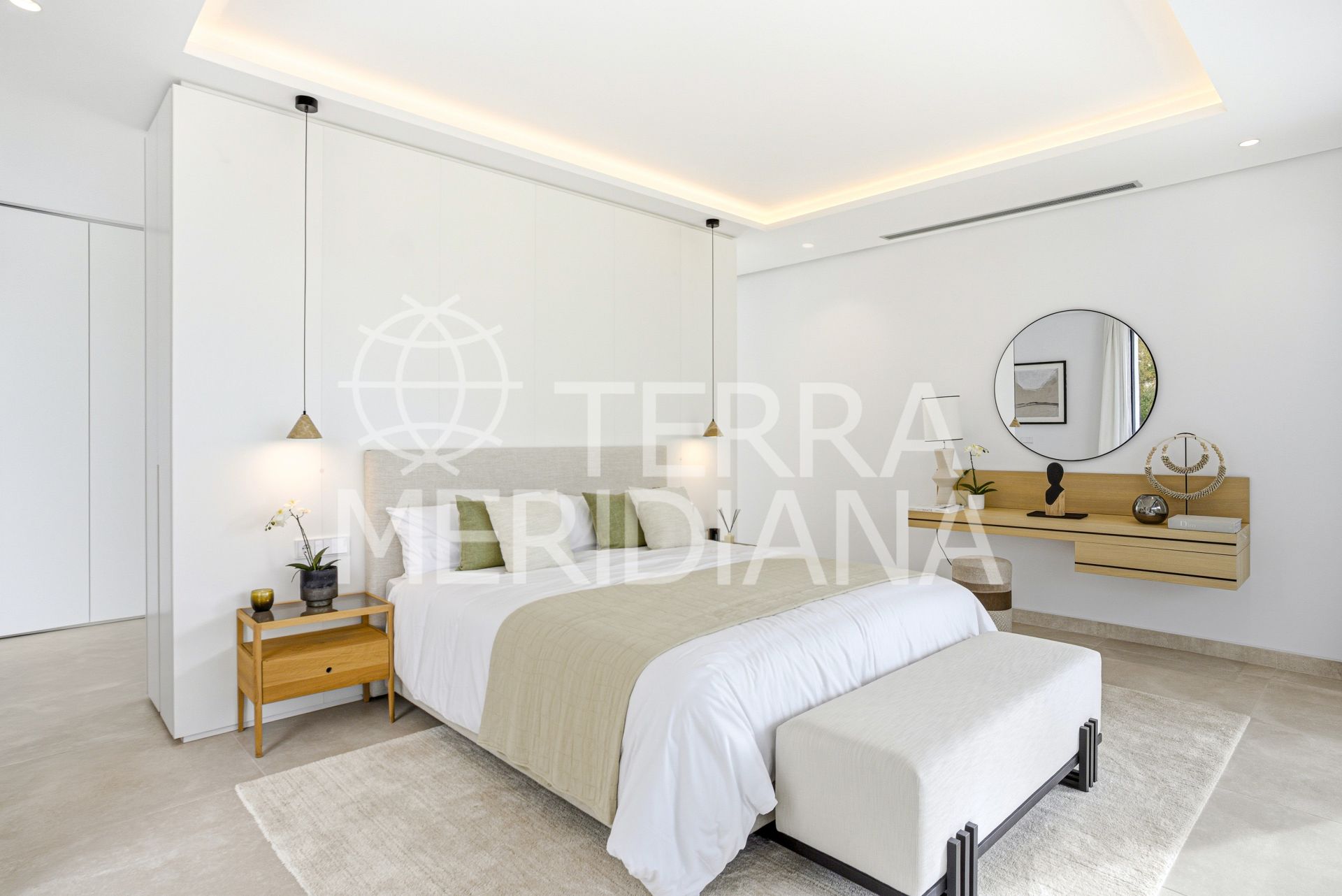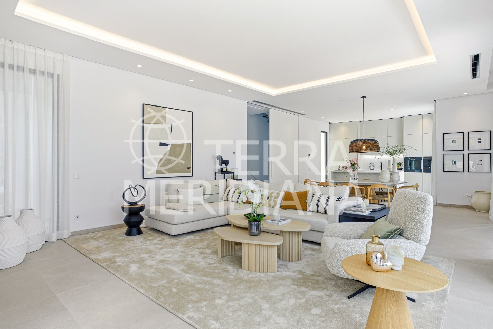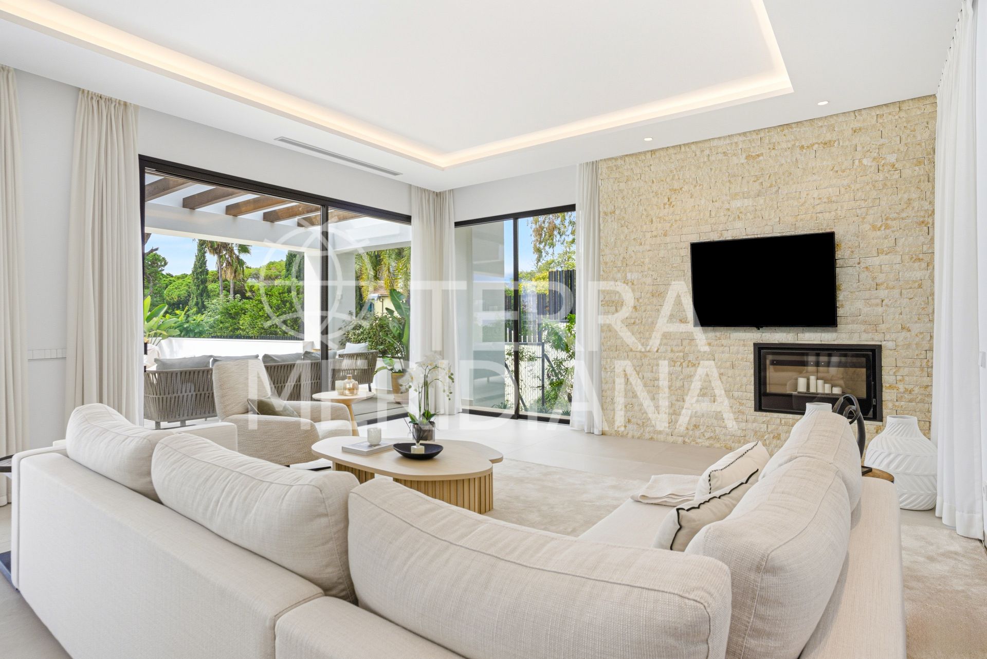 Newly built luxury, southwest-facing villa of exceptional quality, located in an exclusive gated community of just 15 villas with 24-hour security and concierge services. Set within a lush green oasis on the edge of Marbella’s iconic Golden Mile, the property is only metres from the beach and a short walk to Marbella Old Town, bars and restaurants. Built over three levels plus a rooftop solarium, this newly completed villa offers four bedrooms, four bathrooms and two additional WCs. The main living area features an elegant open-plan layout with a designer kitchen equipped with Gaggenau appliances and premium finishes. A private lift connects every floor for maximum comfort and convenience. The villa includes a range of luxury amenities, such as underfloor heating throughout, a domotic smart-home system, solar panels, and a double garage with an electric car charger. The lower level is dedicated to wellness and entertainment, featuring a private hammam and sauna, a temperature-controlled wine cellar, a cinema room, and a multi-functional space ideal for a games room, gym, studio, or additional entertainment area. Outdoor living is exceptional: enjoy a private heated saltwater pool in the garden, and a plunge pool on the rooftop solarium, where beautiful sea views create the perfect backdrop. Both the garden and pool are centrally maintained by the community for effortless, lock-and-go living. A rare opportunity to acquire a turnkey, high-spec villa in one of Marbella’s most prestigious and sought-after beachside locations.