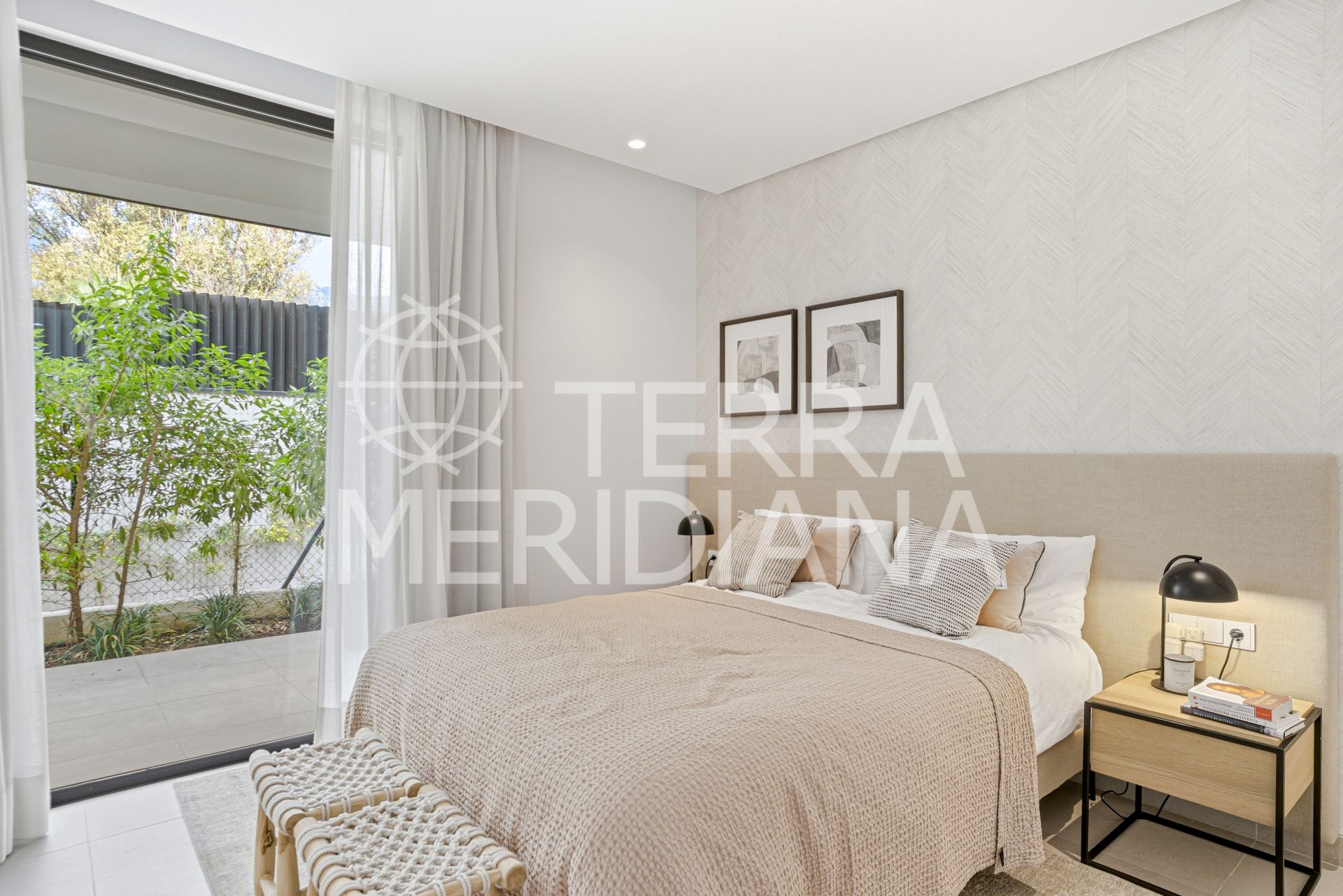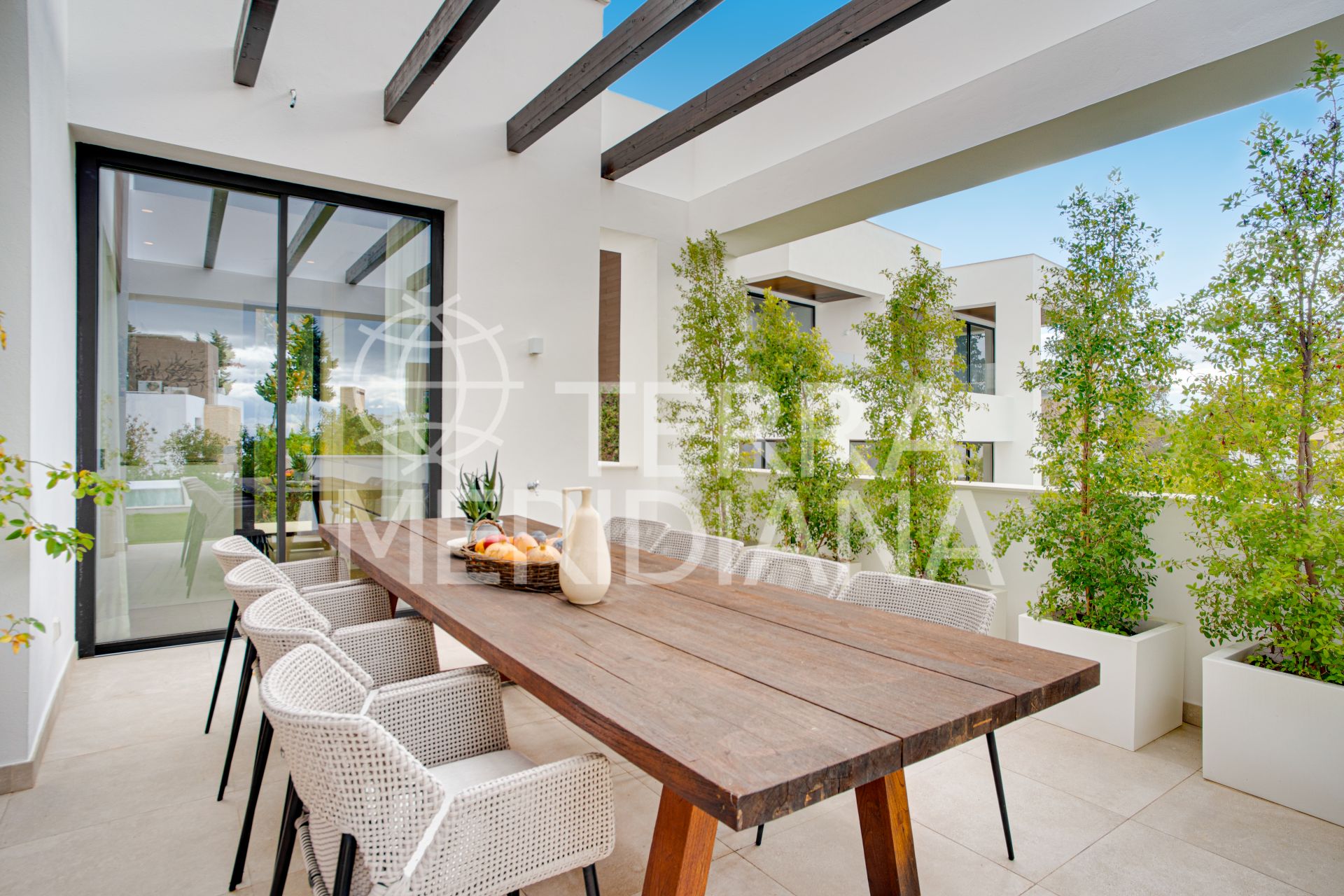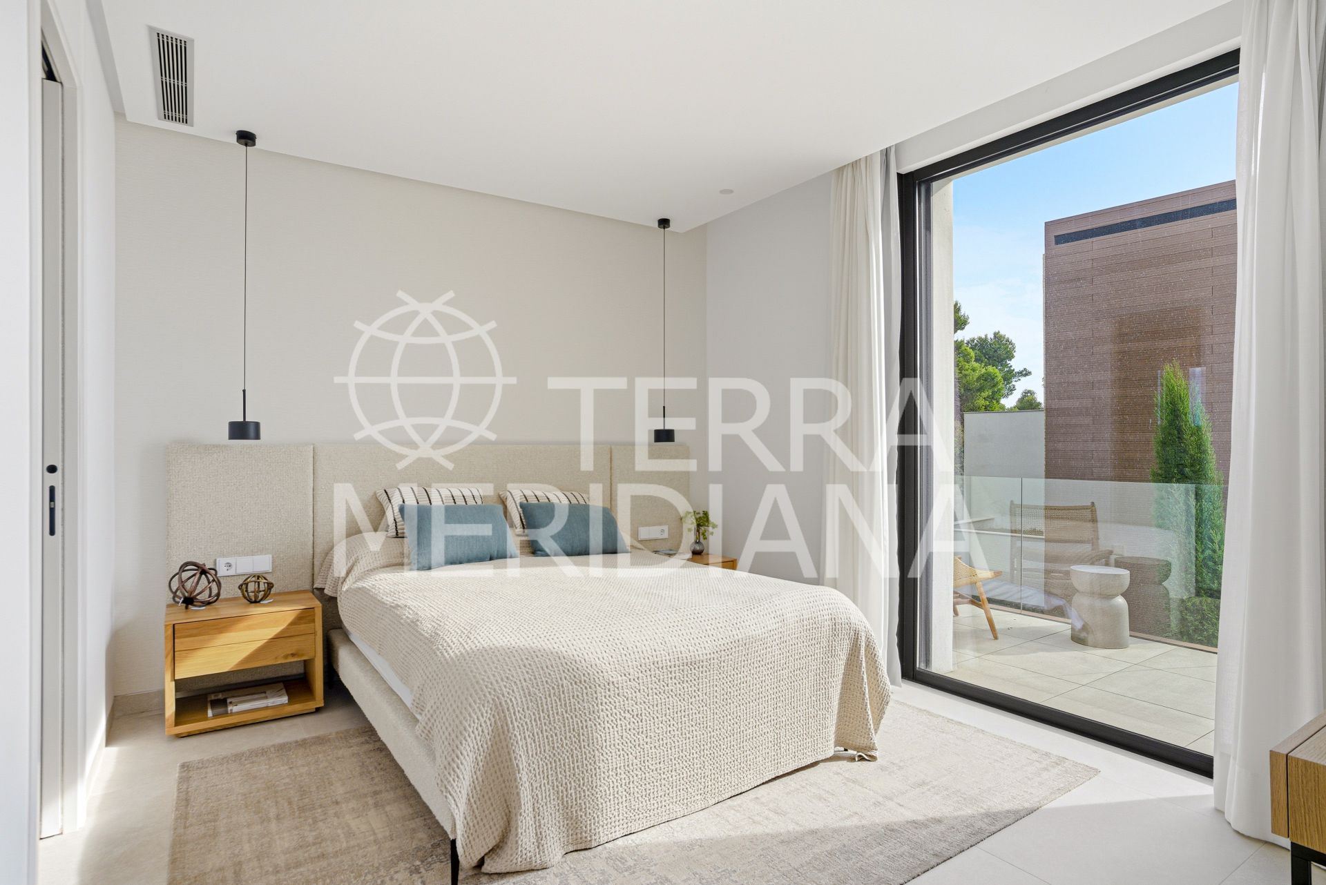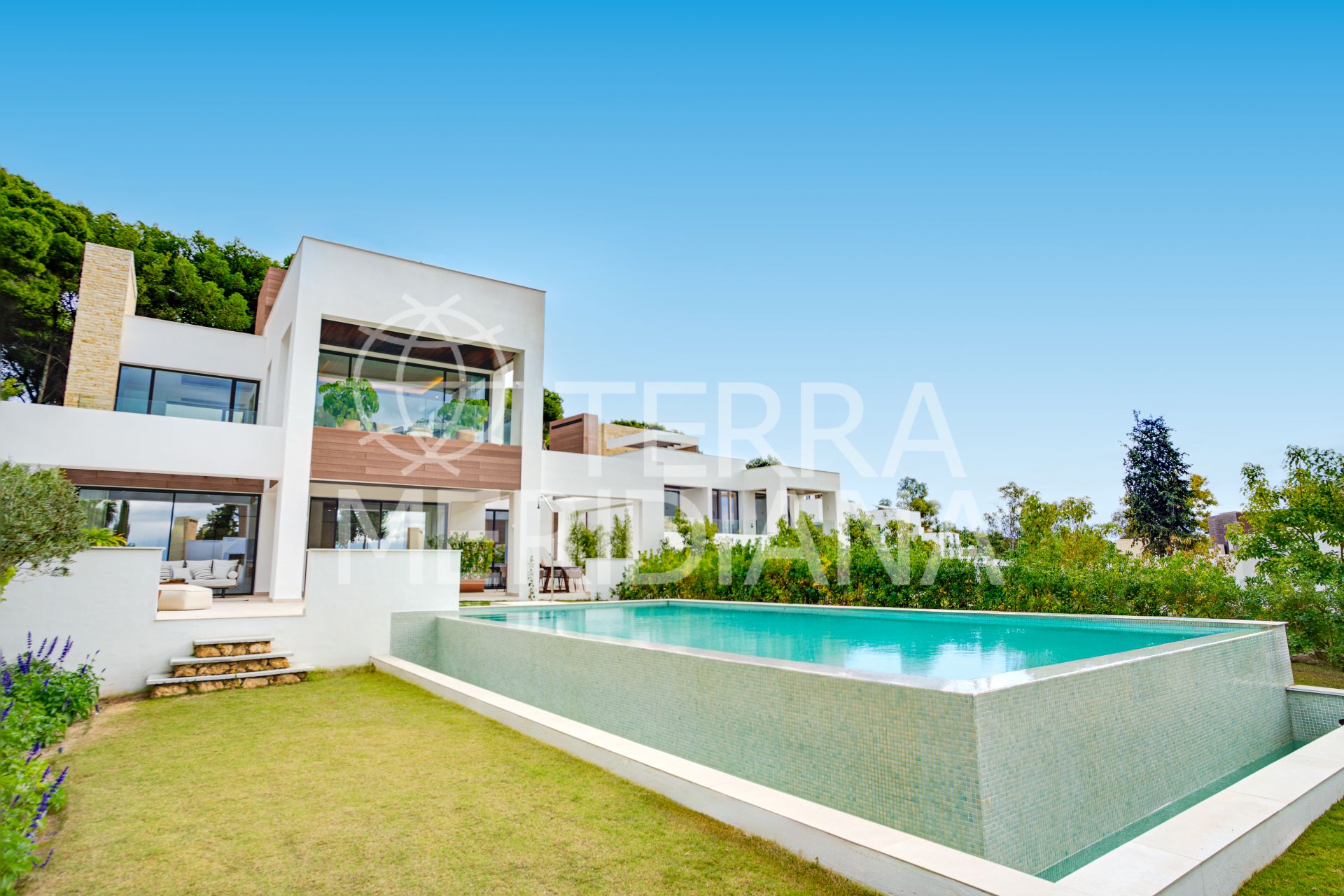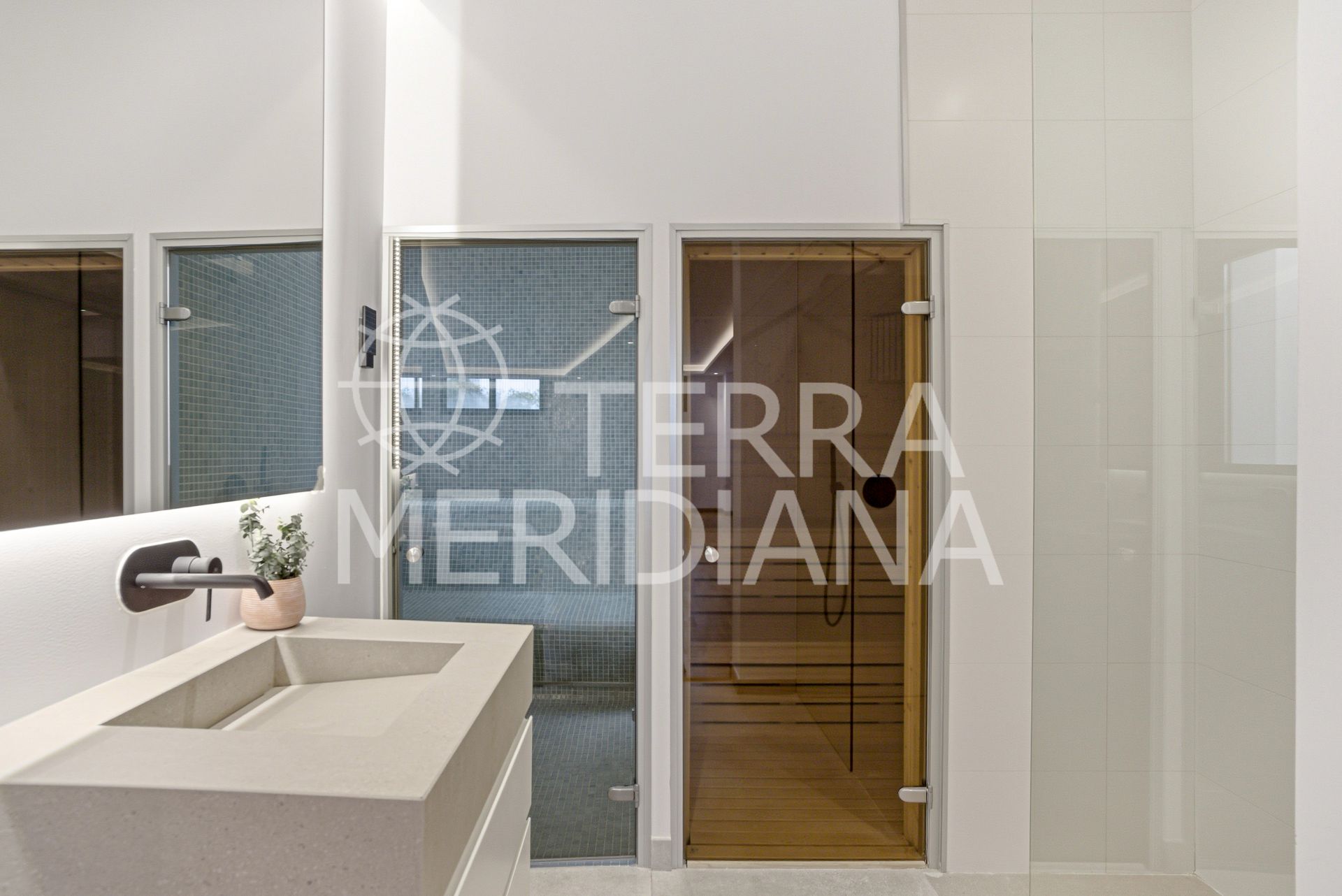 Newly built luxury, southwest-facing villa of exceptional quality, located in an exclusive gated community of just 15 villas with 24-hour security and concierge services. Set within a lush green oasis on the edge of Marbella’s iconic Golden Mile, the property is only metres from the beach and a short walk to Marbella Old Town, bars and restaurants. Built over three levels plus a rooftop solarium, this newly completed villa offers four bedrooms, four bathrooms and two additional WCs. The main living area features an elegant open-plan layout with a designer kitchen equipped with Gaggenau appliances and premium finishes. A private lift connects every floor for maximum comfort and convenience. The villa includes a range of luxury amenities, such as underfloor heating throughout, a domotic smart-home system, solar panels, and a double garage with an electric car charger. The lower level is dedicated to wellness and entertainment, featuring a private hammam and sauna, a temperature-controlled wine cellar, a cinema room, and a multi-functional space ideal for a games room, gym, studio, or additional entertainment area. Outdoor living is exceptional: enjoy a private heated saltwater pool in the garden, and a plunge pool on the rooftop solarium, where beautiful sea views create the perfect backdrop. Both the garden and pool are centrally maintained by the community for effortless, lock-and-go living. A rare opportunity to acquire a turnkey, high-spec villa in one of Marbella’s most prestigious and sought-after beachside locations.