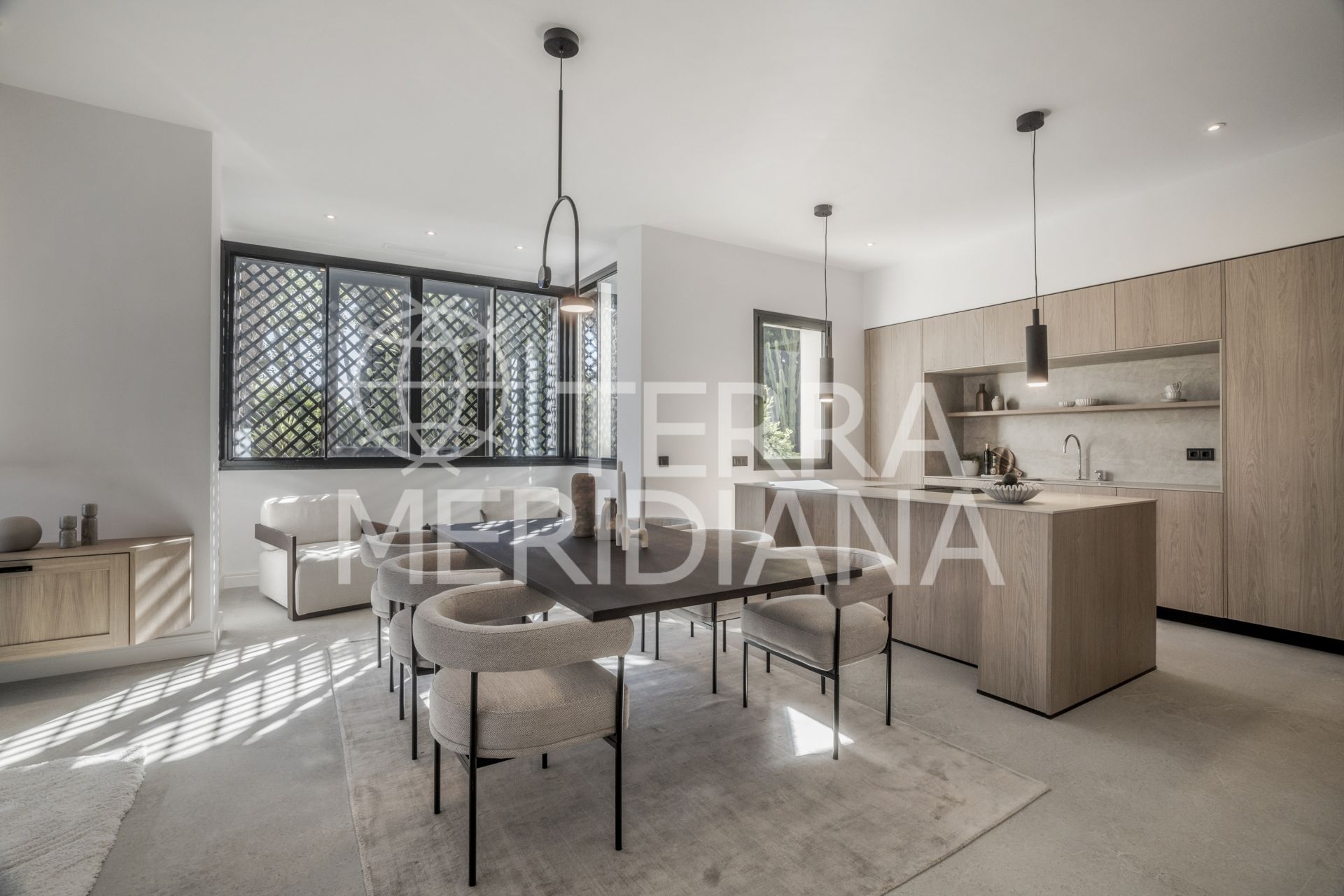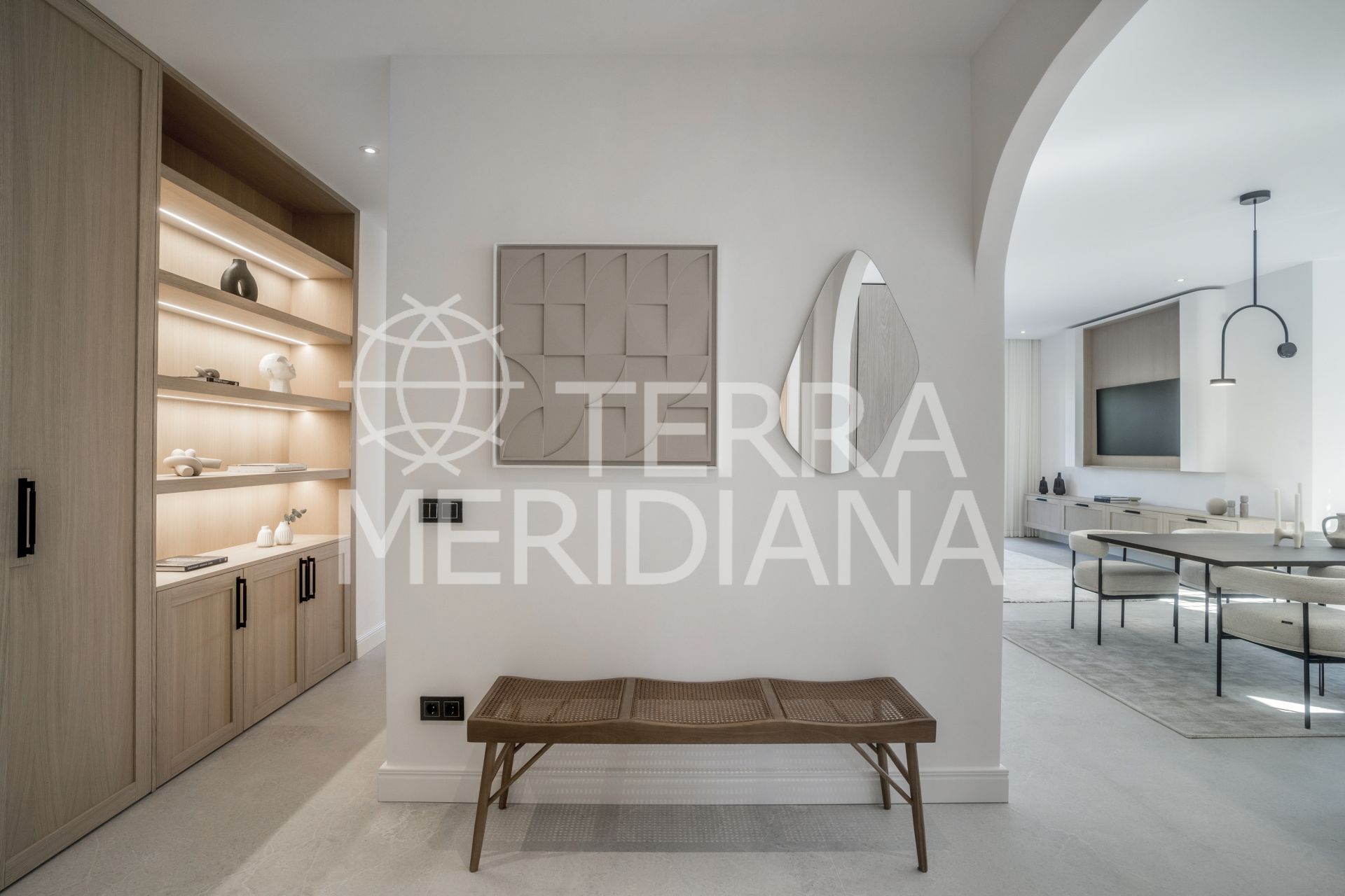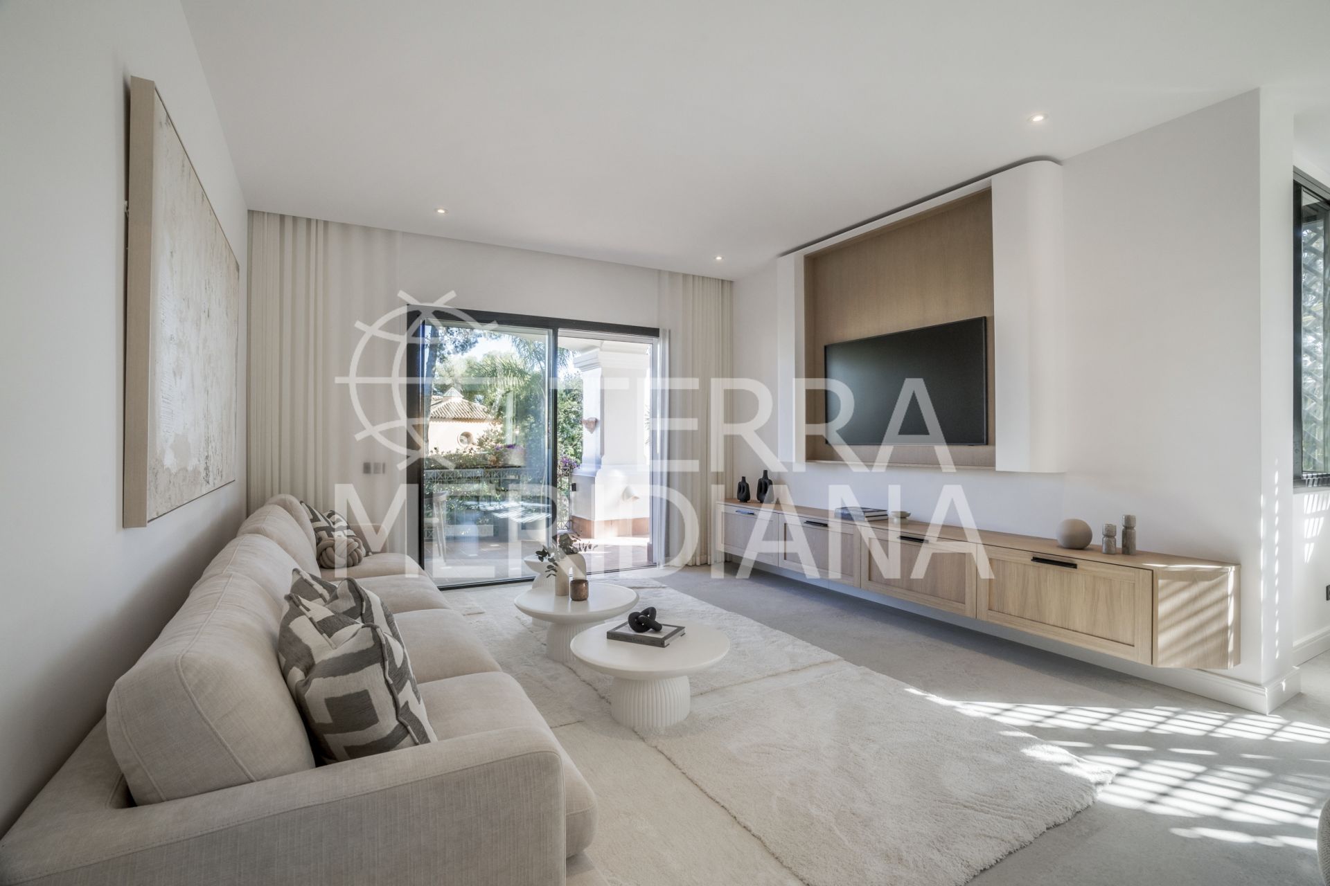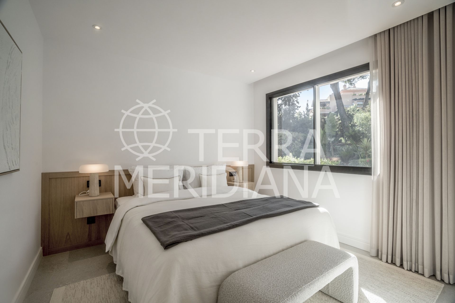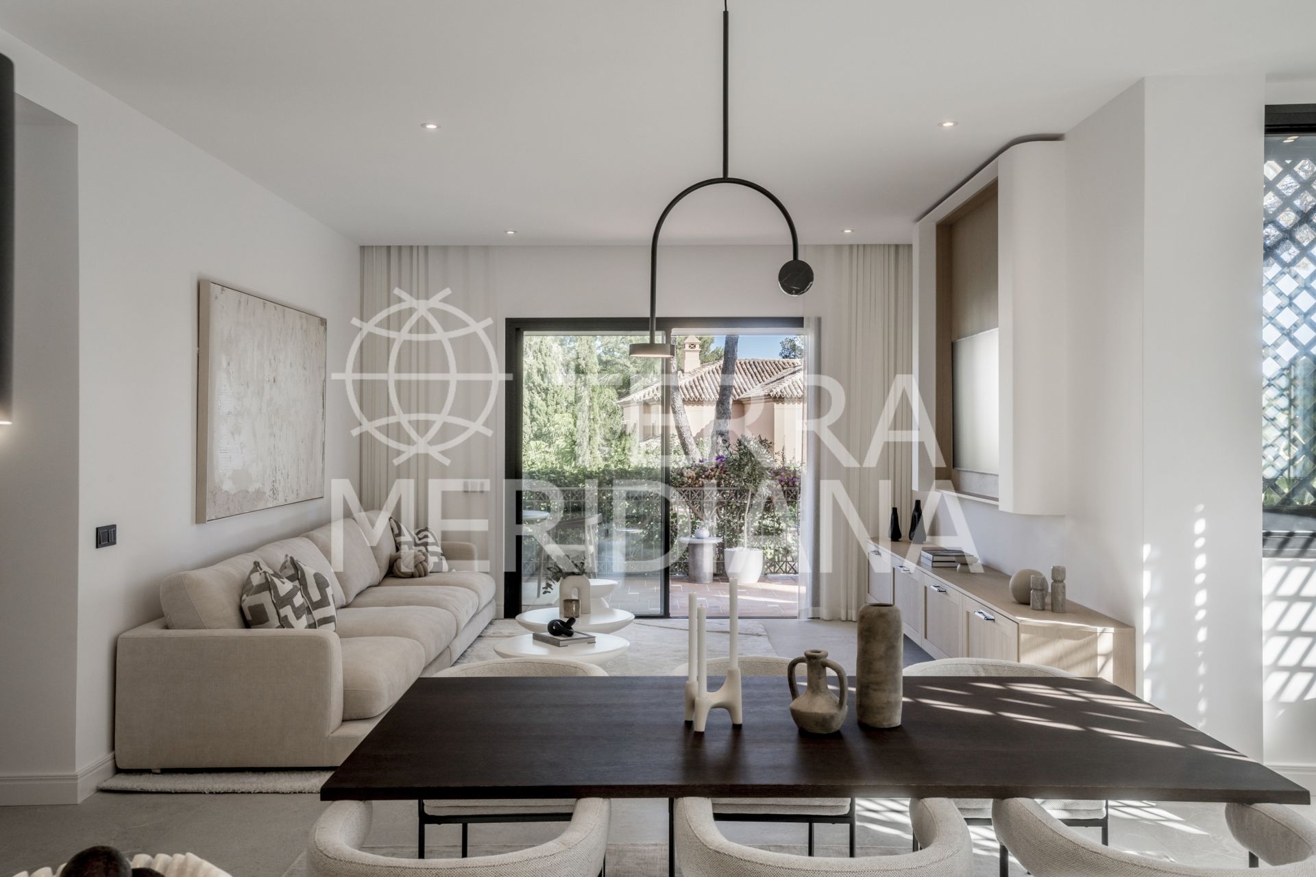 This newly renovated three-bedroom, three-bathroom ground-floor residence is located in the exclusive gated community of Altos Reales, Sierra Blanca. Every detail of this home has been thoughtfully curated to deliver a truly elevated living experience, featuring elegant flooring, high ceilings, custom contemporary wood carpentry, natural fabrics and textures, and an open-concept designer kitchen equipped with premium Miele appliances.