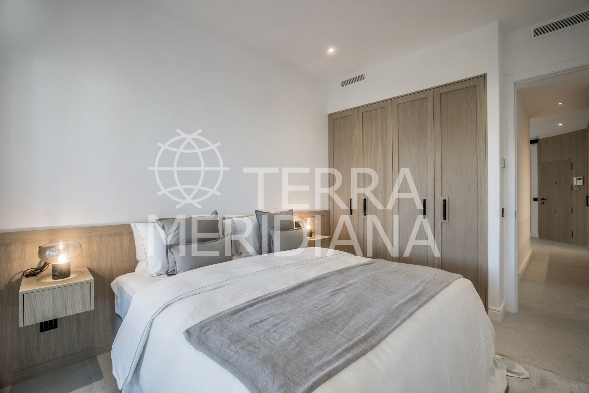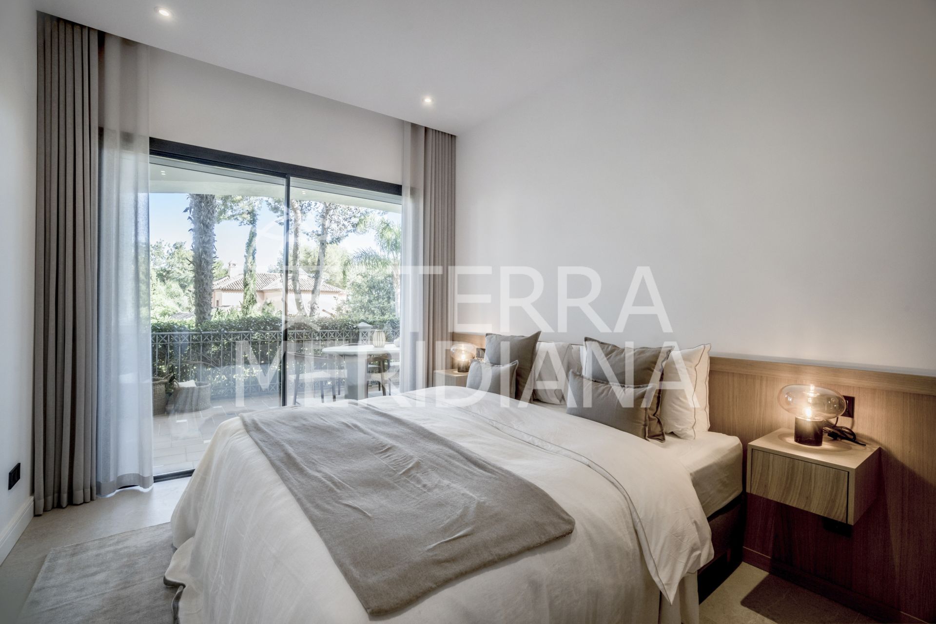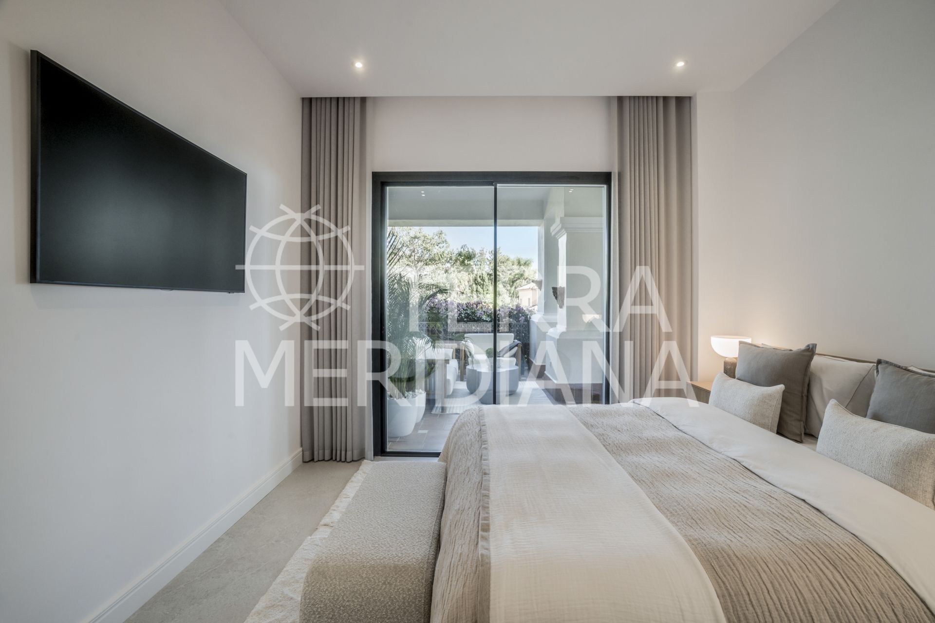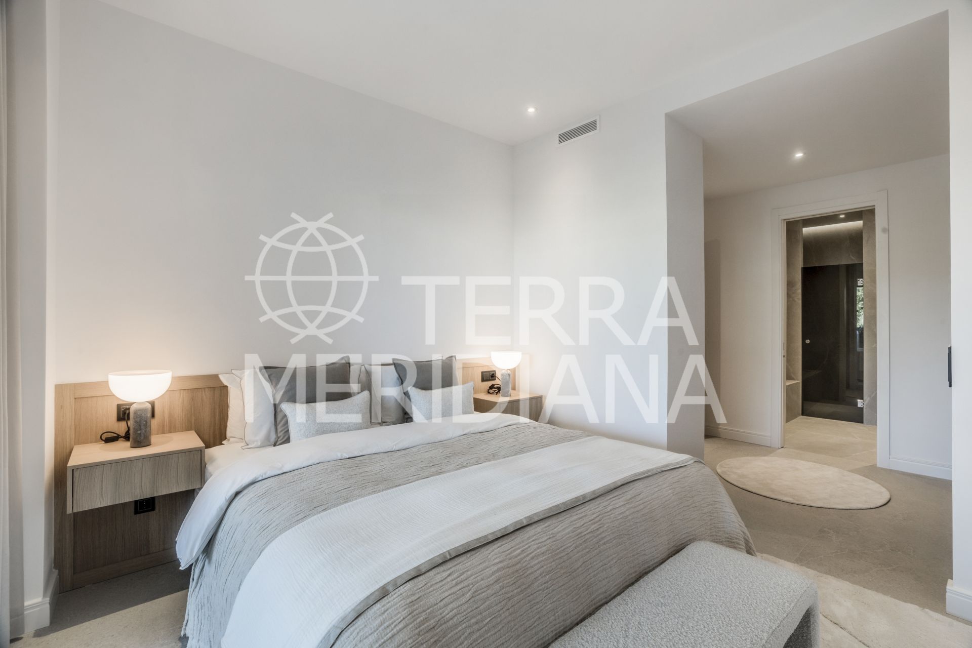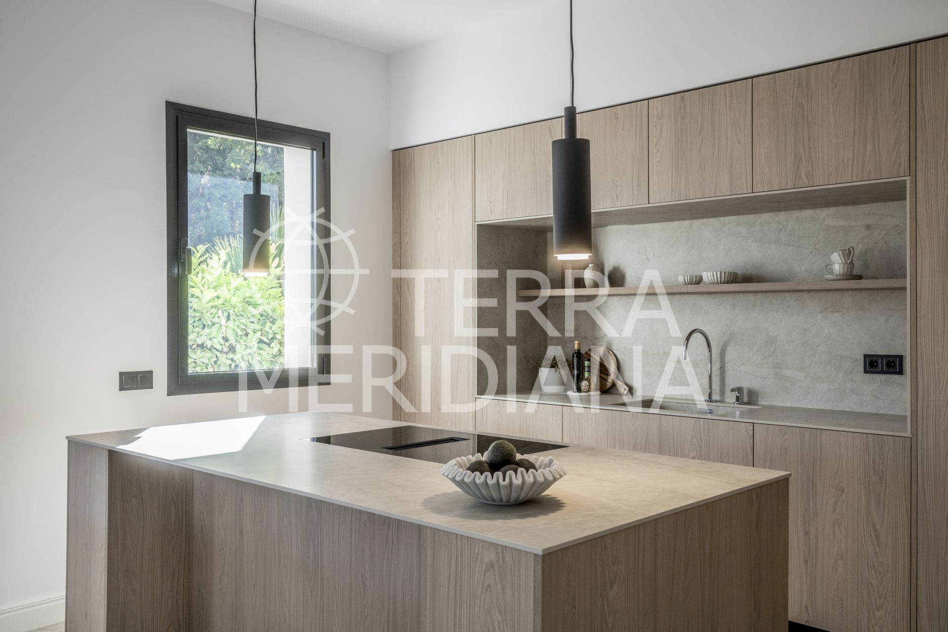 This newly renovated three-bedroom, three-bathroom ground-floor residence is located in the exclusive gated community of Altos Reales, Sierra Blanca. Every detail of this home has been thoughtfully curated to deliver a truly elevated living experience, featuring elegant flooring, high ceilings, custom contemporary wood carpentry, natural fabrics and textures, and an open-concept designer kitchen equipped with premium Miele appliances.