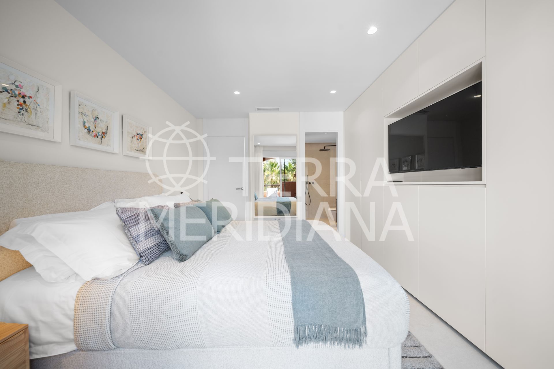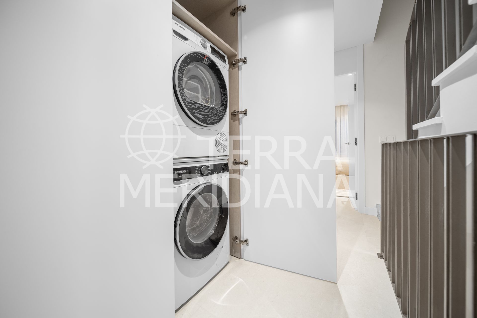 The top floor is dedicated entirely to the master suite, featuring two private terraces—one accessed directly from the bedroom and the other from the landing—ideal for sunbathing, relaxation, or al-fresco dining.
