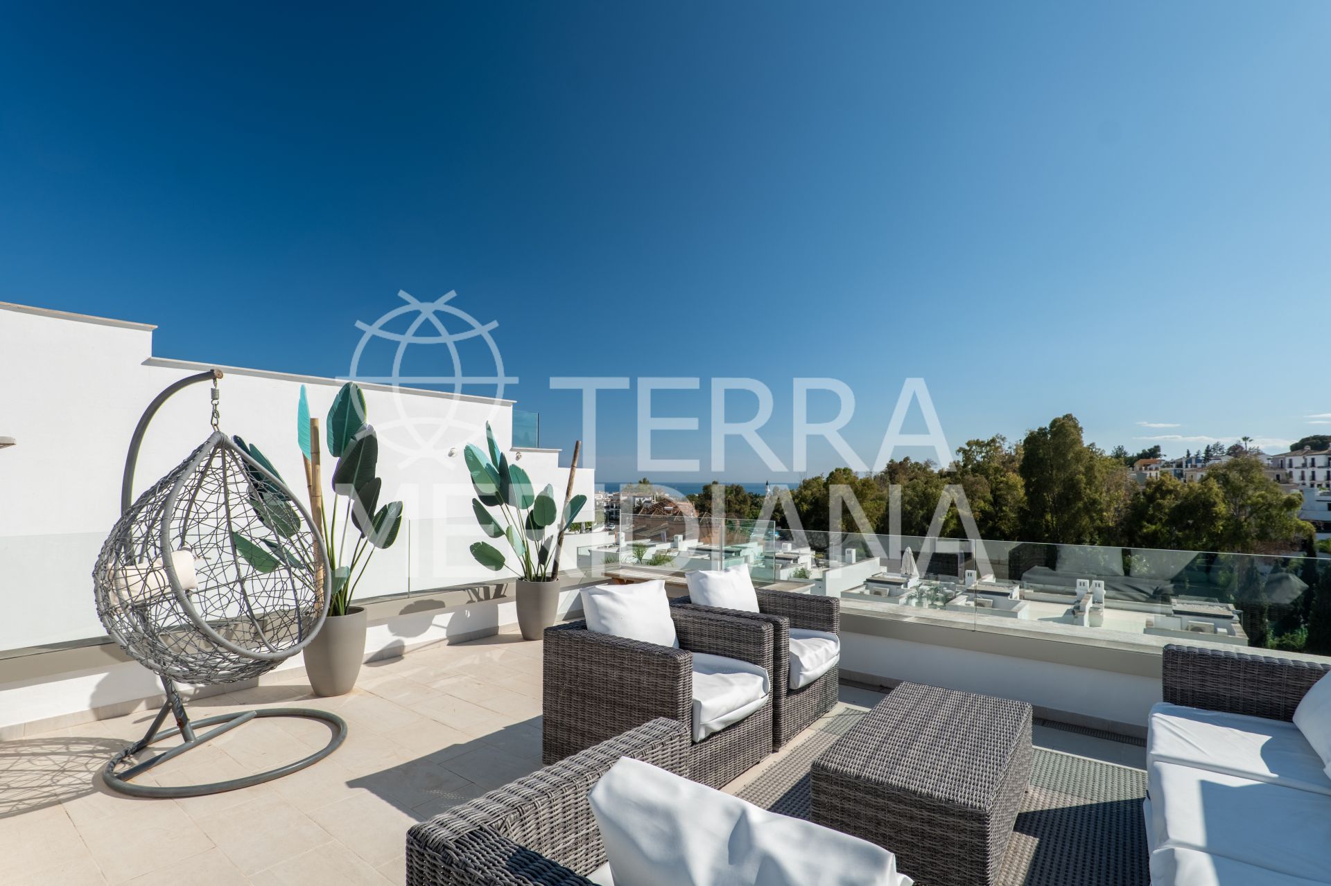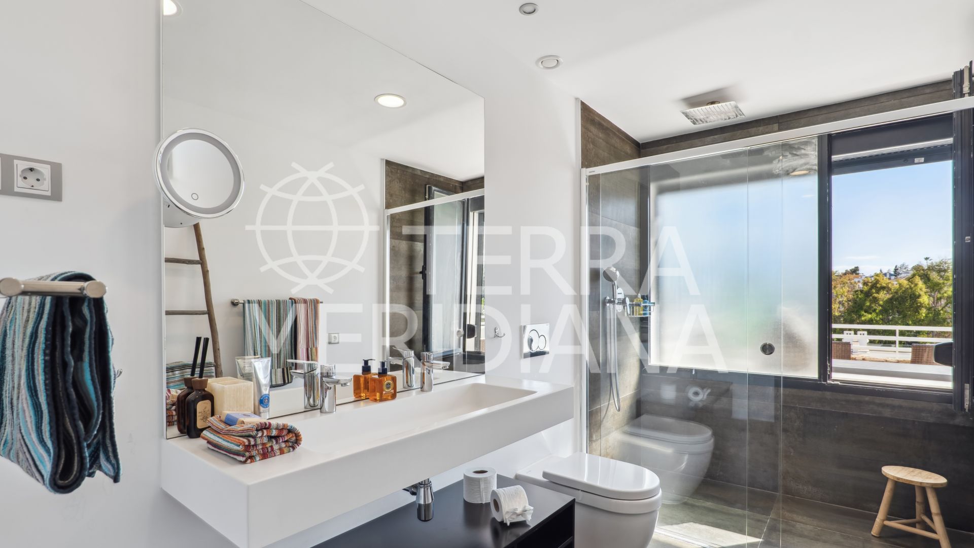 Upstairs, you’ll find three spacious bedrooms, including a master suite with its own terrace and breathtaking views of La Concha mountain and the Mediterranean Sea. On the third floor, a spectacular rooftop terrace awaits—complete with space for a jacuzzi, sun loungers, and lounge areas to soak up the sun all day.