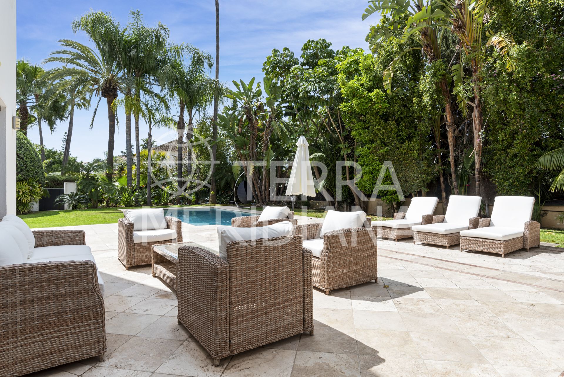 The outdoor area offers a lot of privacy and a mature garden with some large trees. The heated swimming pool is surrounded by a tiled decking with a chill-out area, a bar and barbecue and an outdoor jacuzzi.