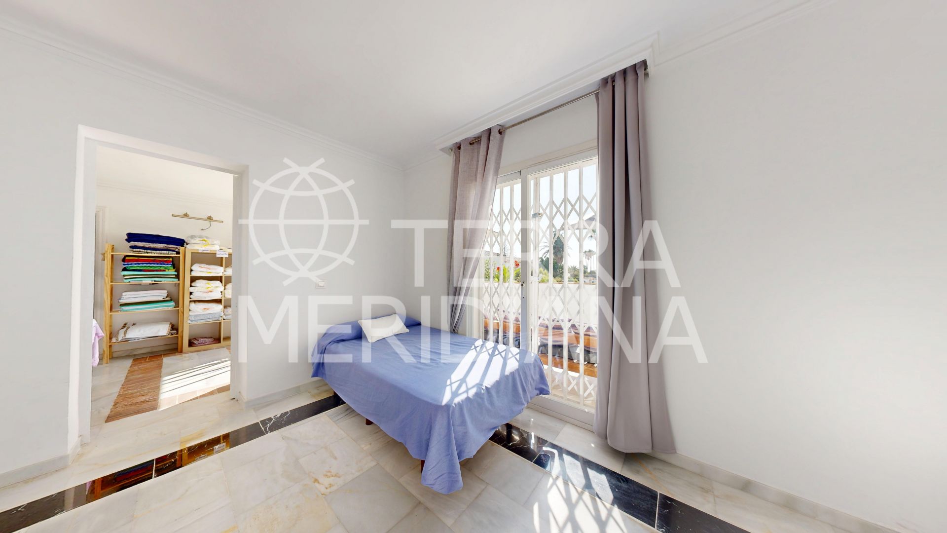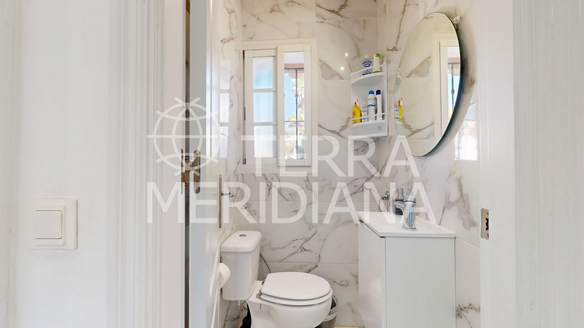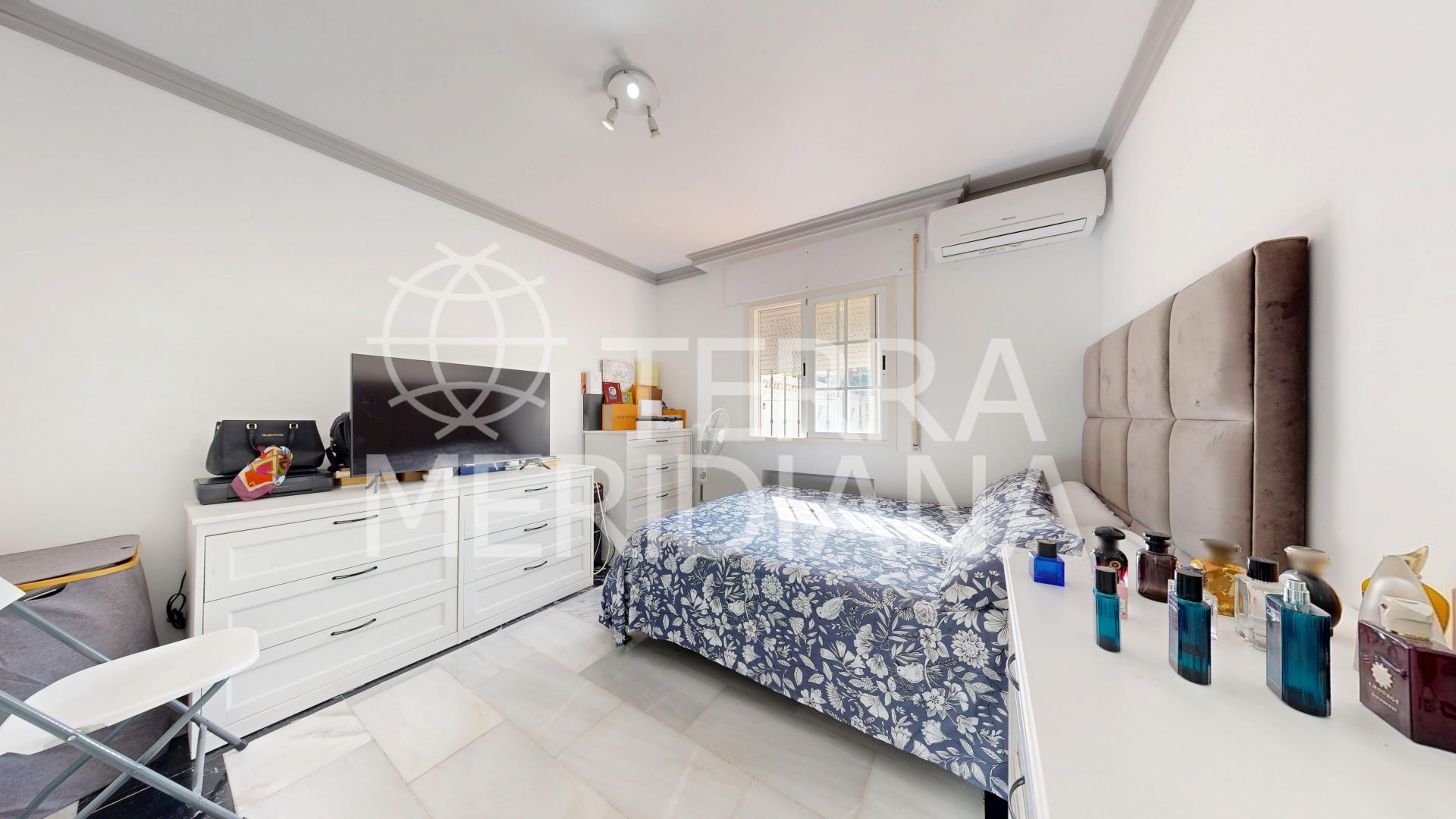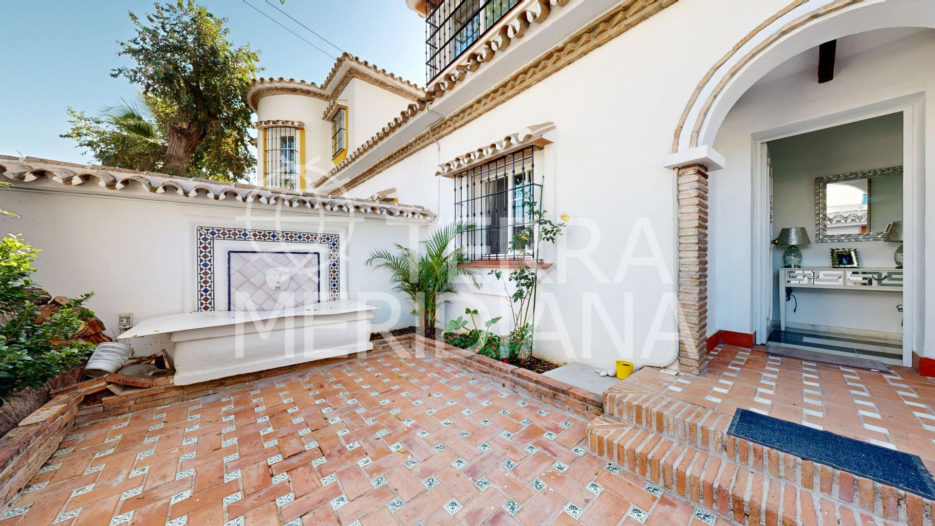 Interiors with Character: A charming Andalusian entrance patio welcomes you. The two-story layout offers generous spaces. The main floor houses the living-dining room with direct access to the garden, an equipped kitchen, and two bedrooms. The upper floor is reserved for the main bedrooms, featuring fitted wardrobes and large private terraces with South/West orientation. Marble flooring enhances the timeless character.