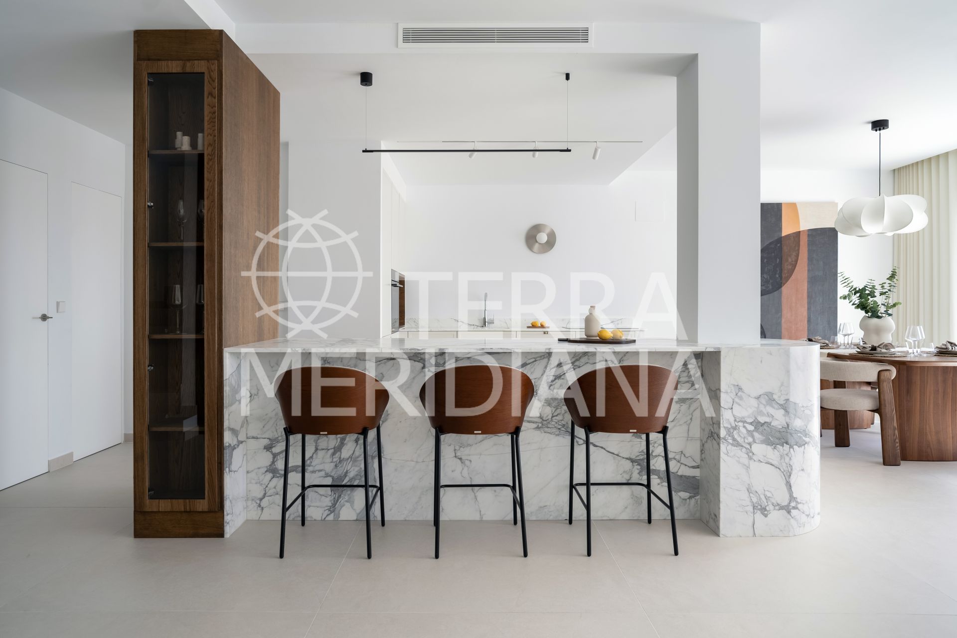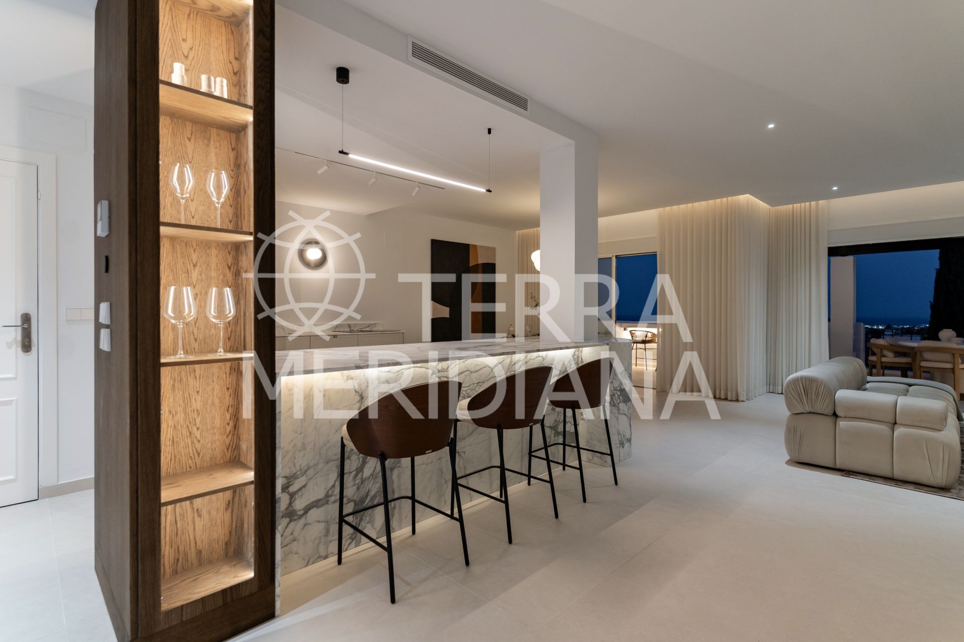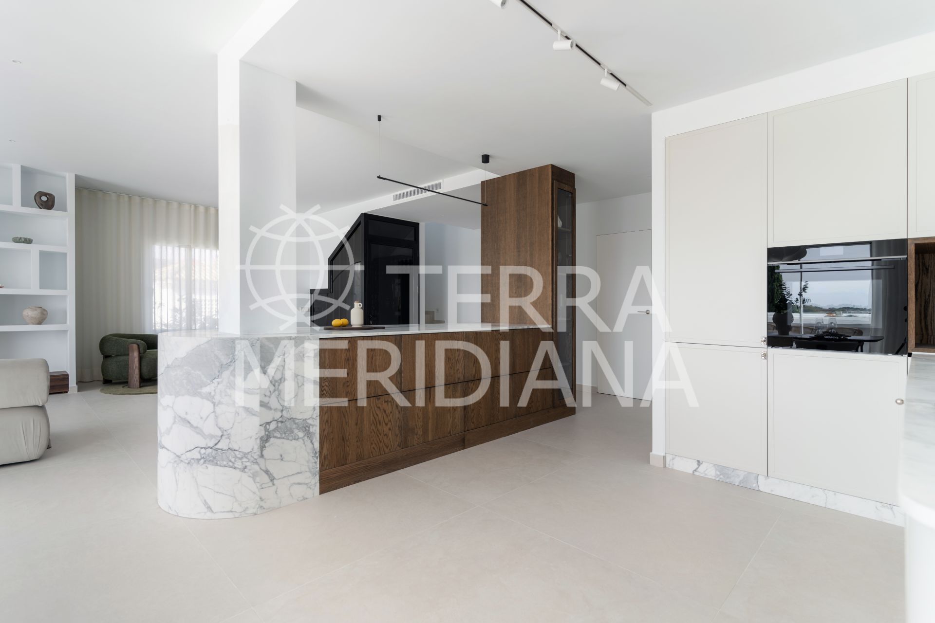 The main floor’s open-plan kitchen, dining, and living space flows directly onto a generous south-facing terrace, perfect for slow mornings or dinners under the stars. The kitchen features elegant Italian marble countertops and a built-in wine bar, while a guest en-suite bedroom with its own terrace offers privacy and comfort for visitors.
