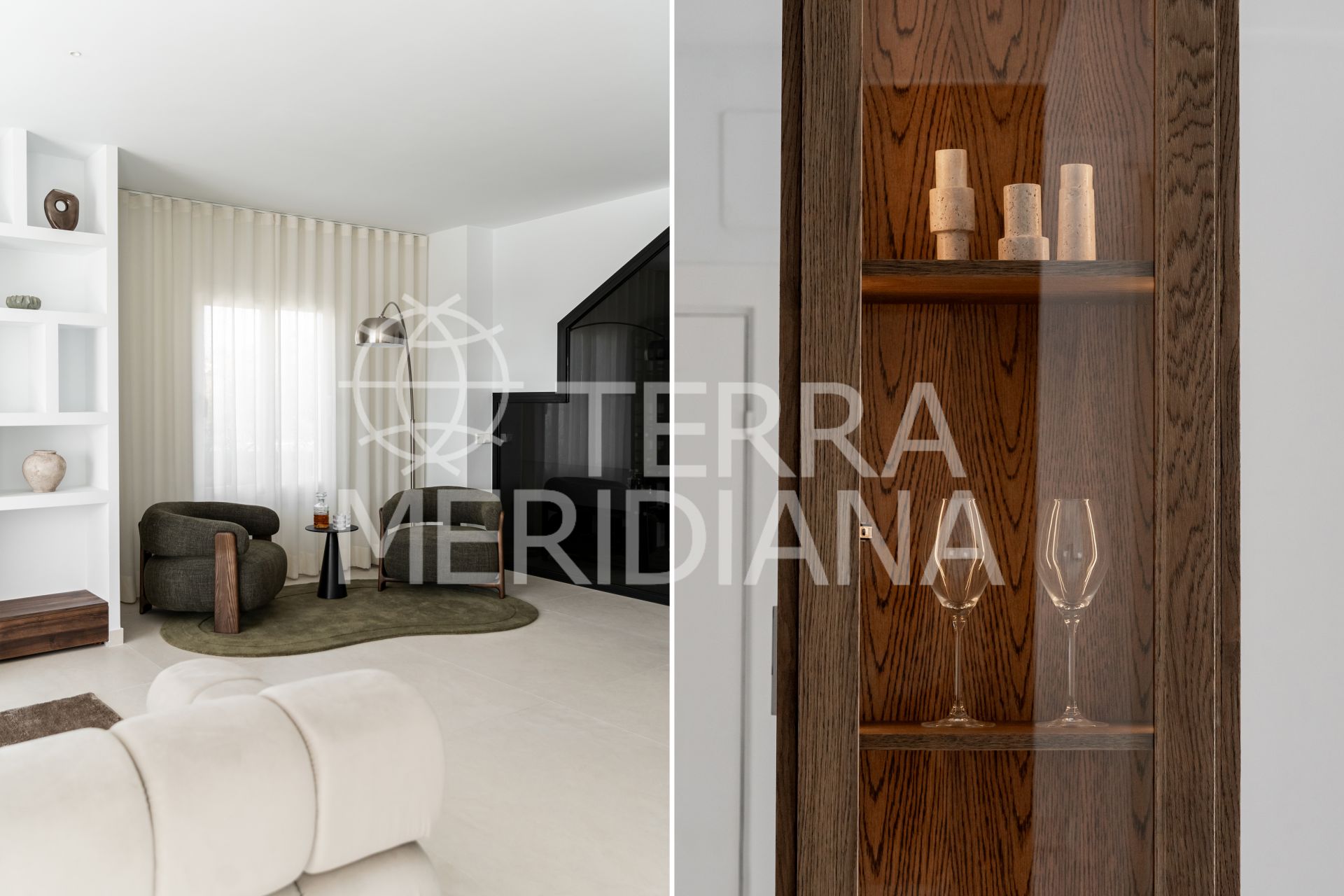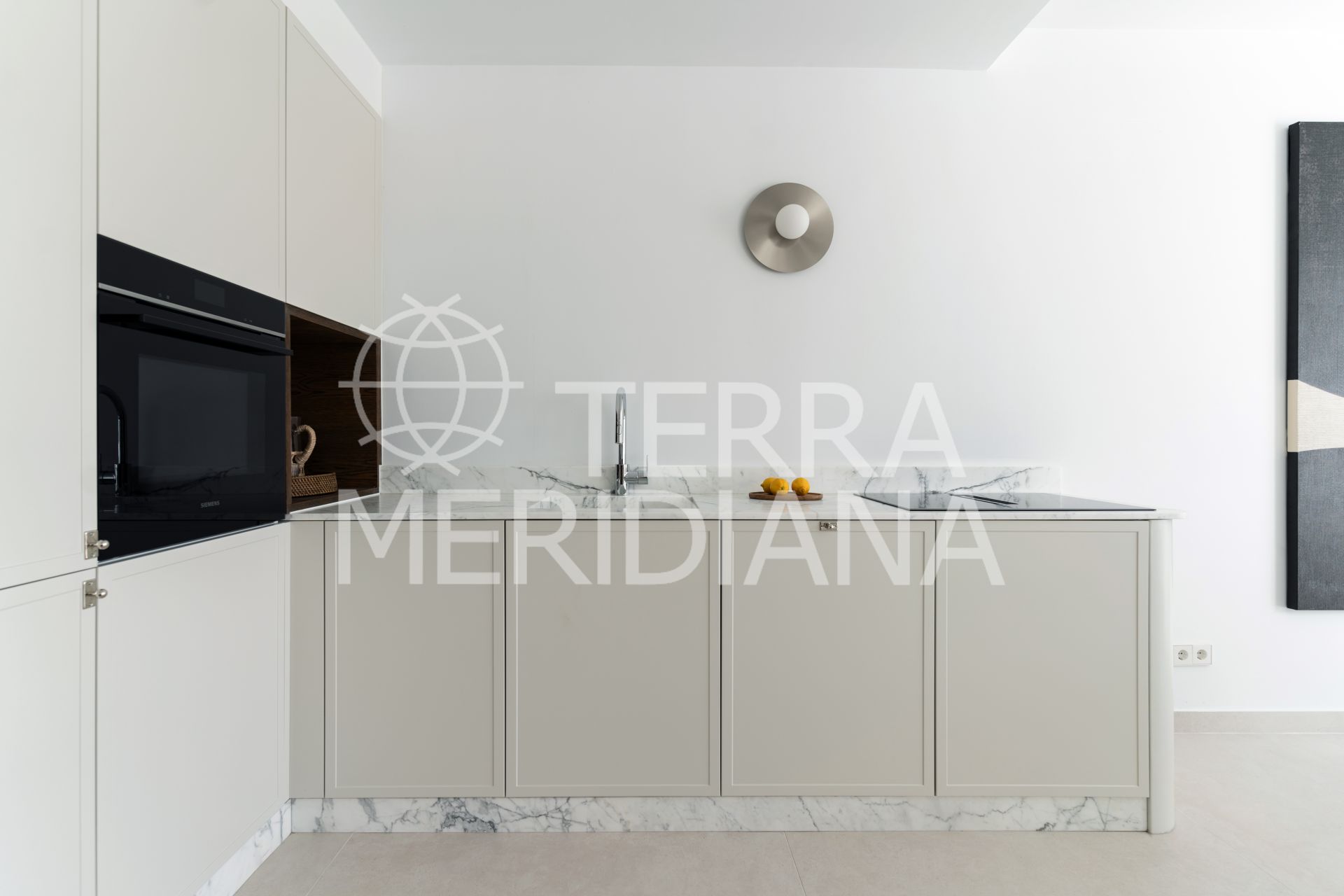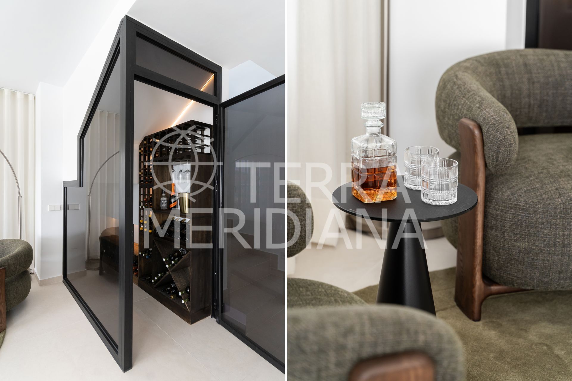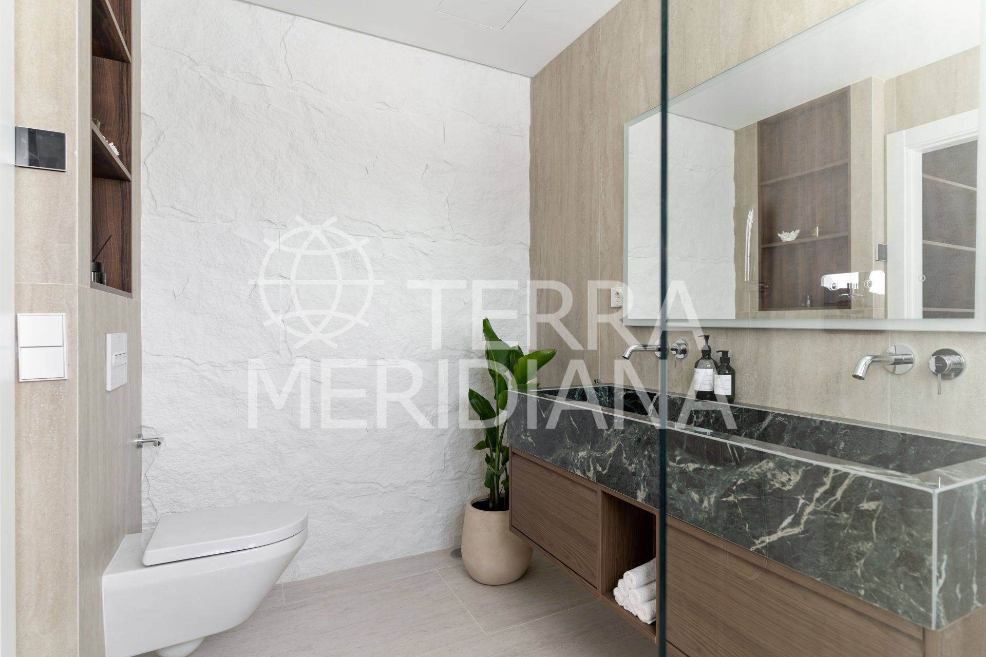 The main floor’s open-plan kitchen, dining, and living space flows directly onto a generous south-facing terrace, perfect for slow mornings or dinners under the stars. The kitchen features elegant Italian marble countertops and a built-in wine bar, while a guest en-suite bedroom with its own terrace offers privacy and comfort for visitors.