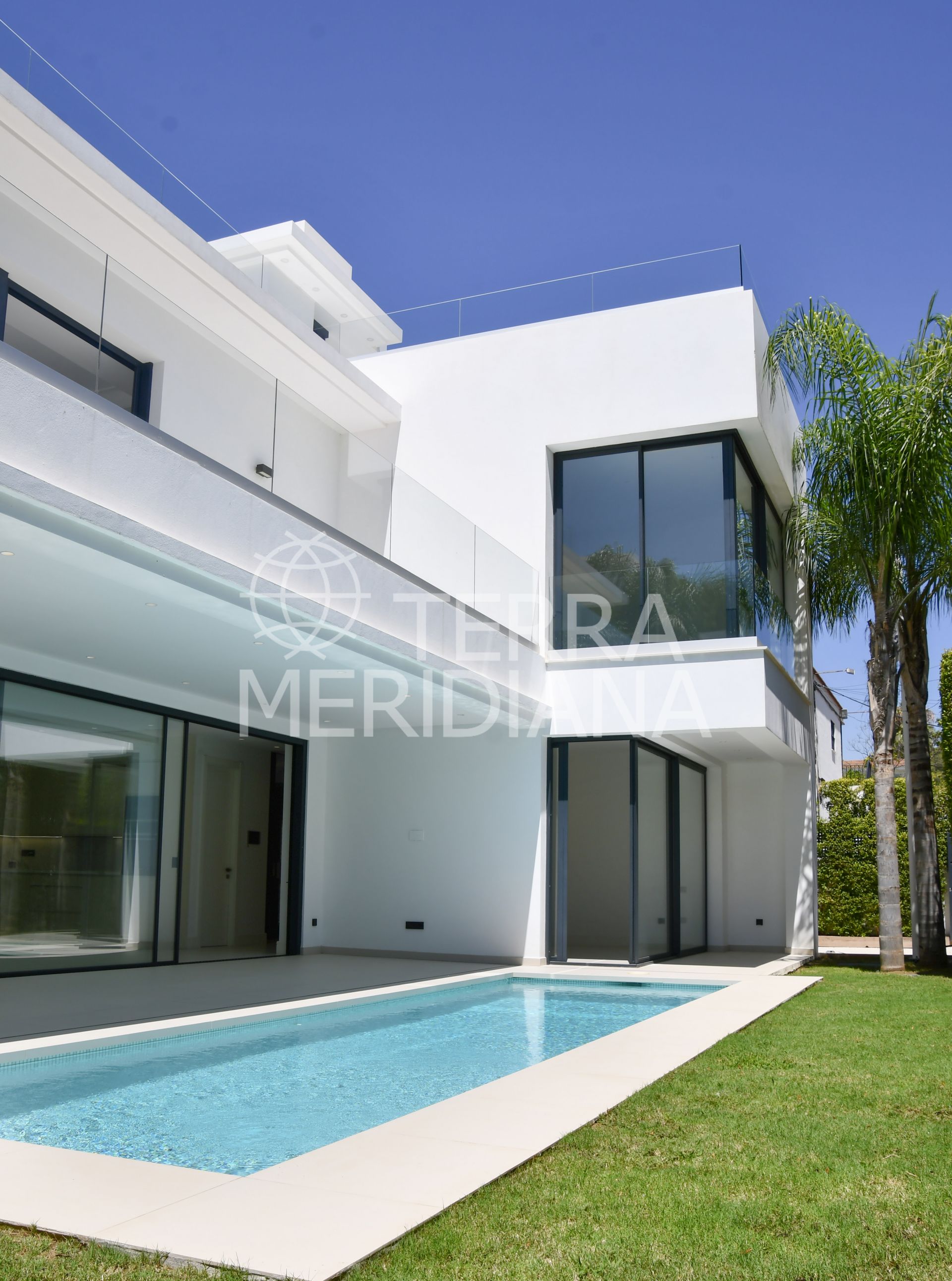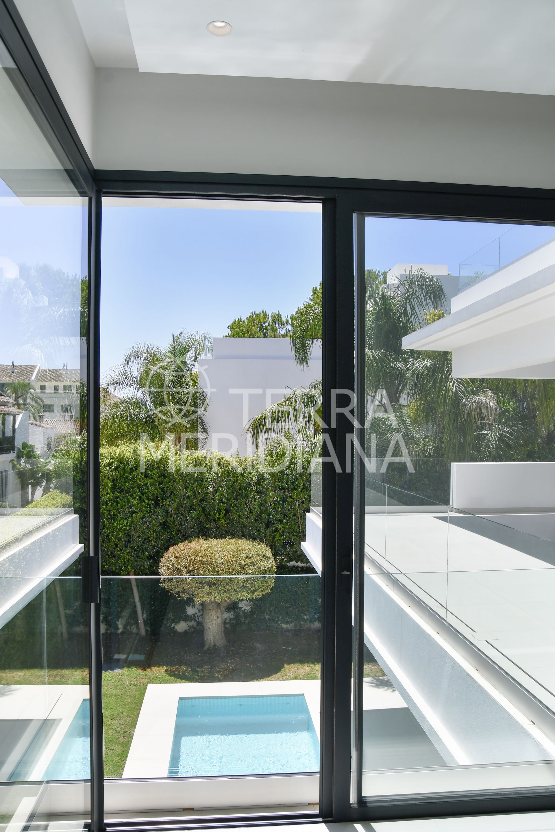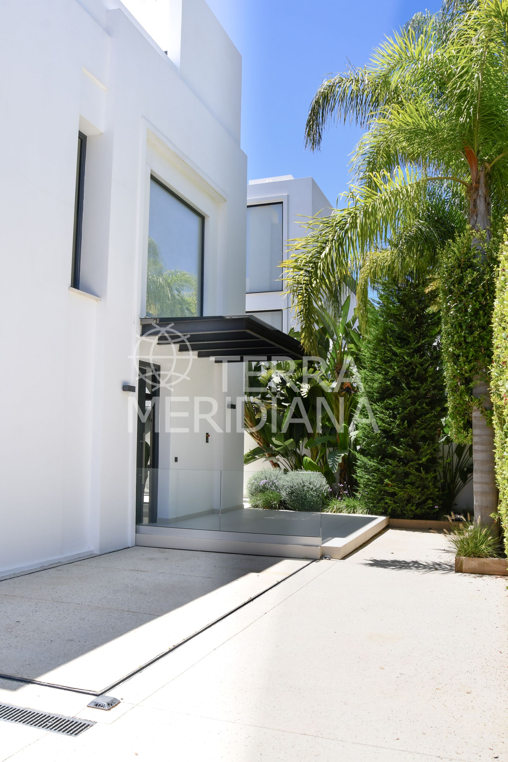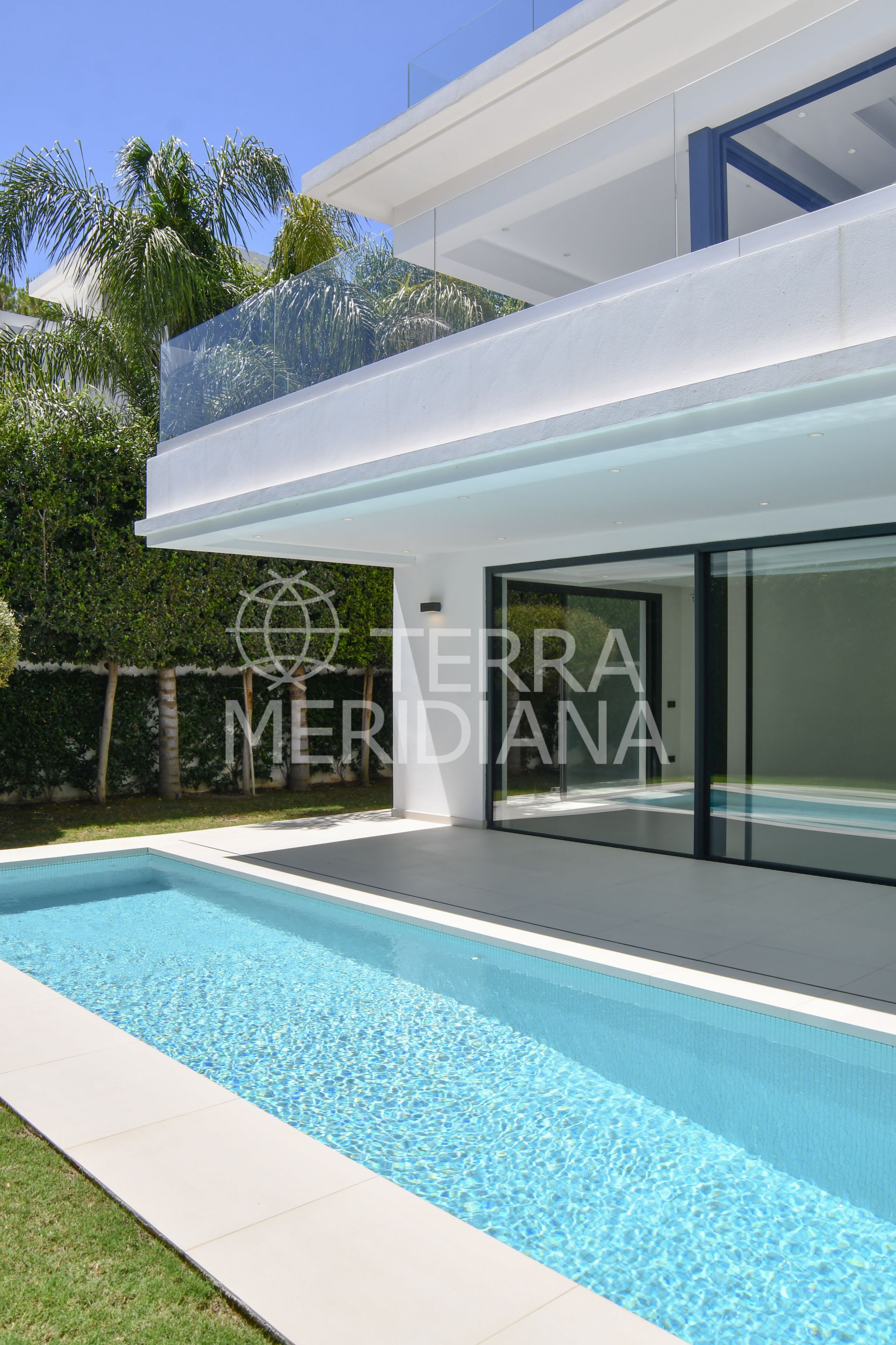 A marvelous new modern villa for sale is located in one of the most luxurious residential areas in Marbella – Golden Mile, in a secure urbanization Rio Verde, just 100 meters from the beach.