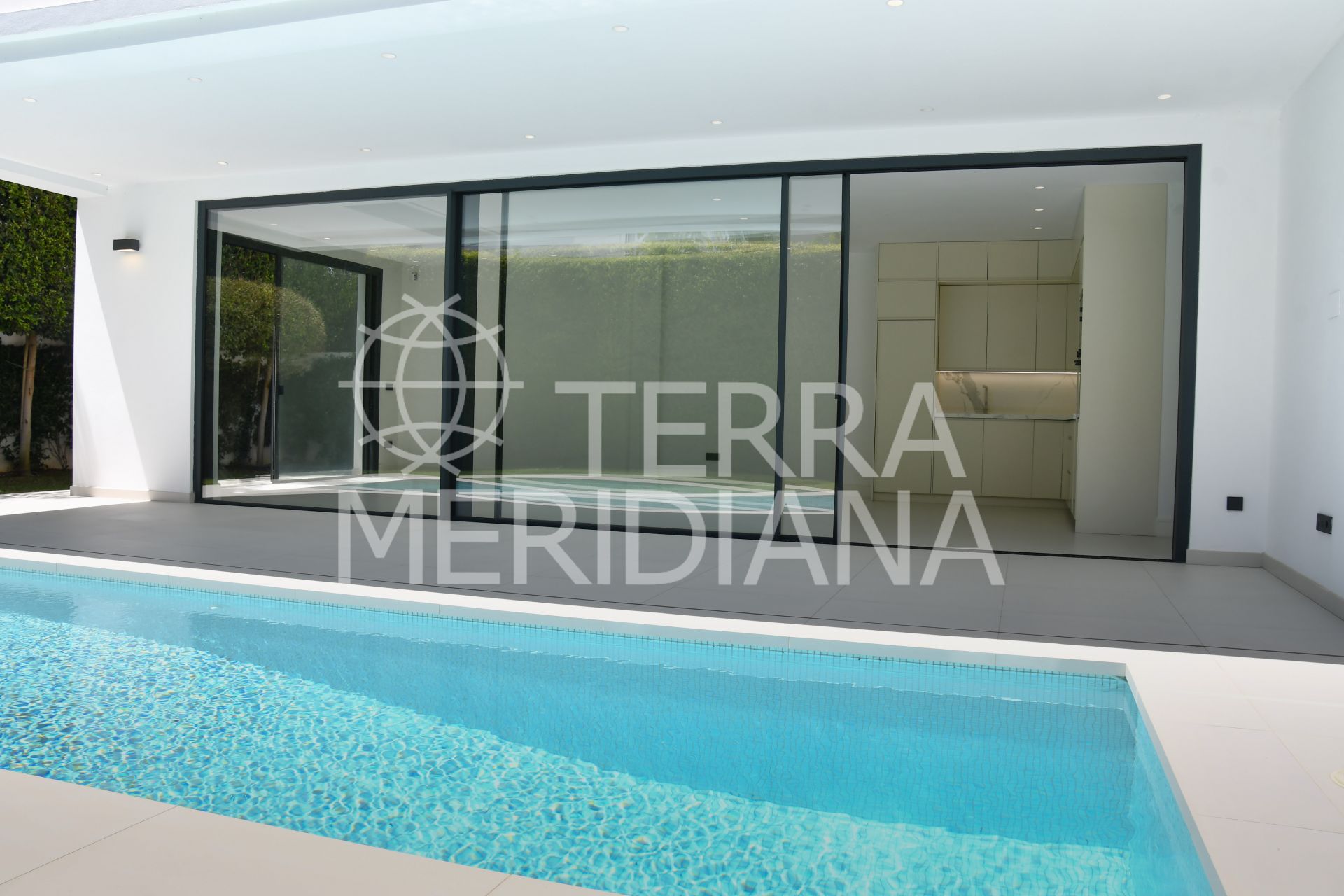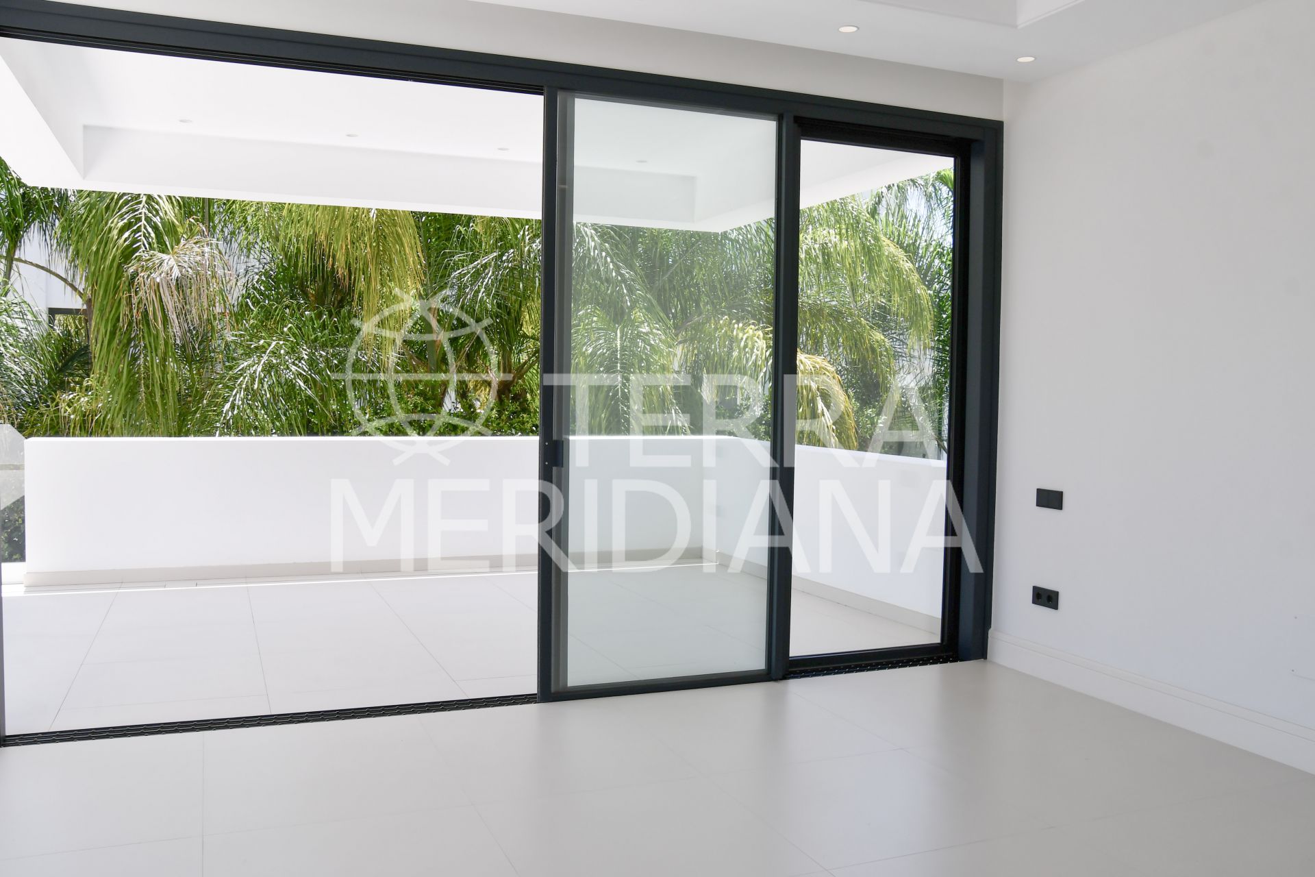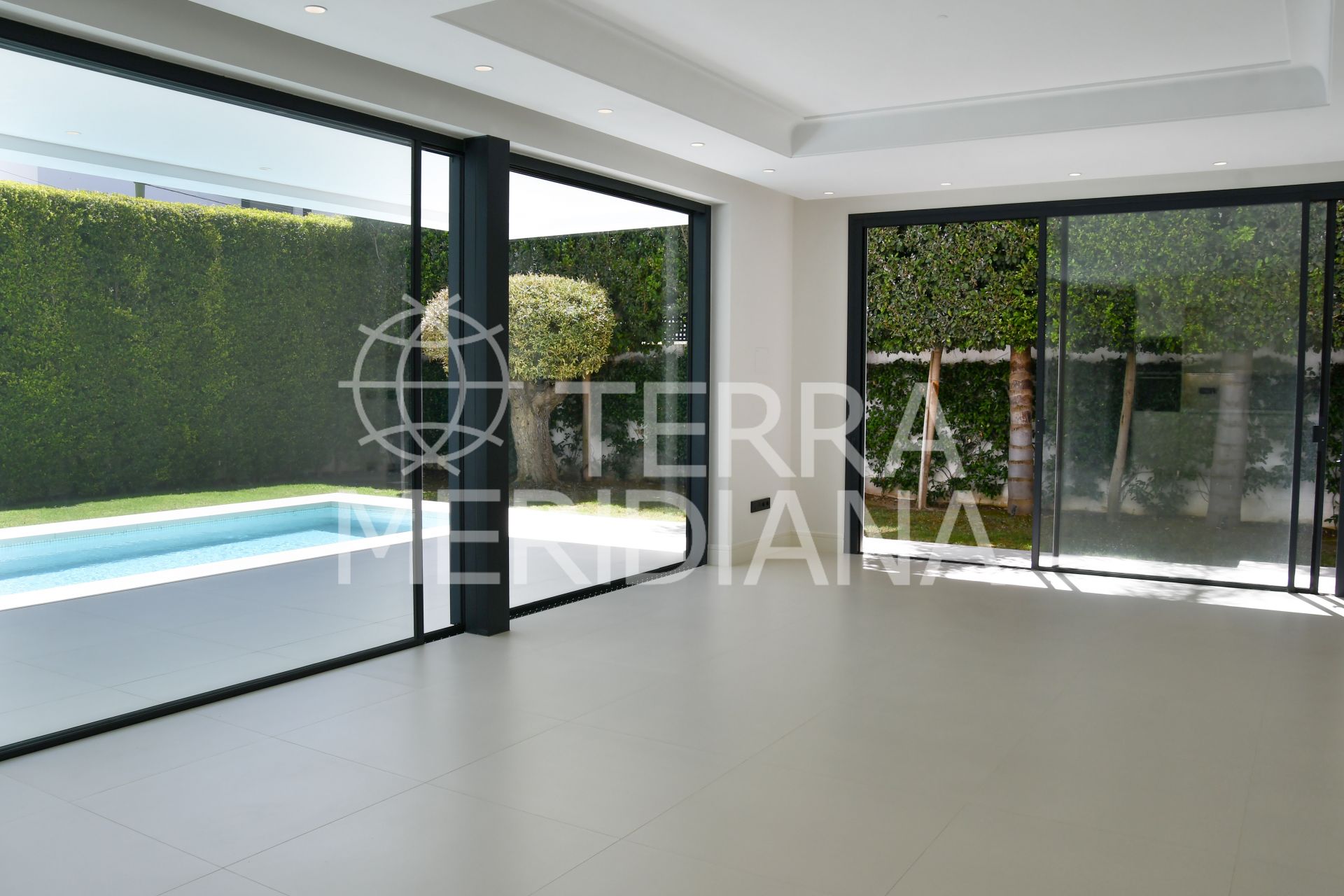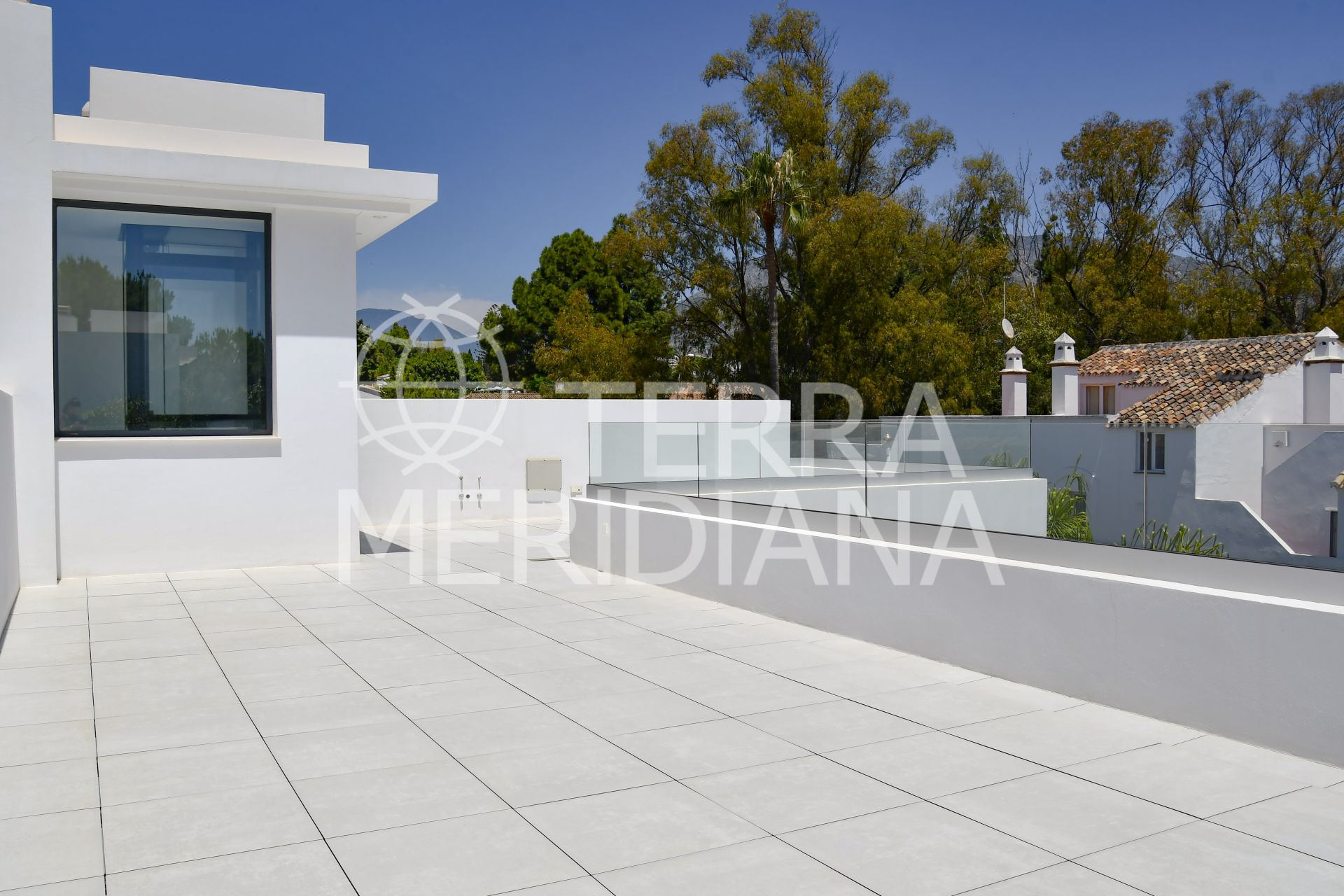 A marvelous new modern villa for sale is located in one of the most luxurious residential areas in Marbella – Golden Mile, in a secure urbanization Rio Verde, just 100 meters from the beach.